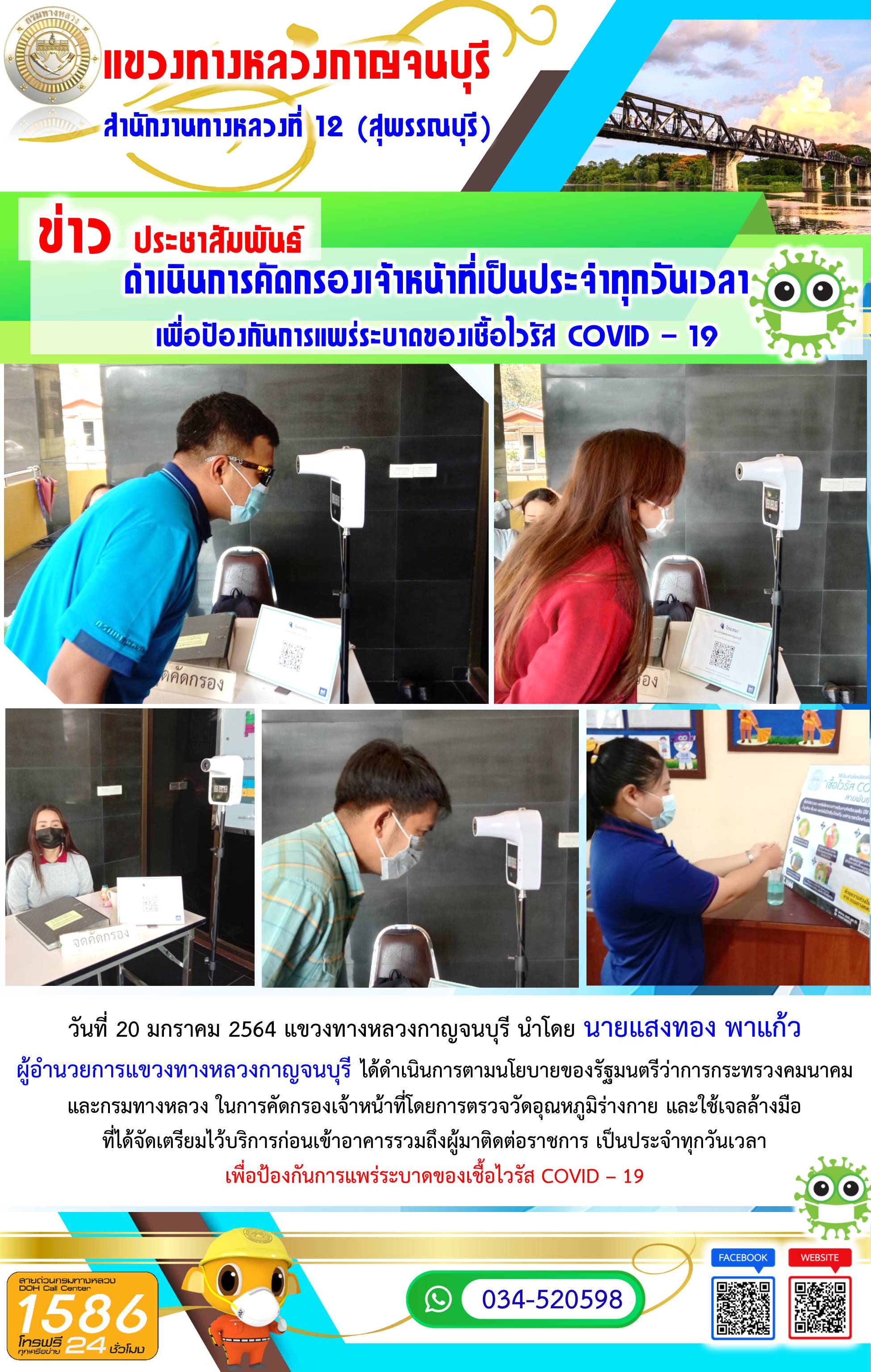 วันที่ 20 มกราคม 2564 แขวงทางหลวงกาญจนบุรี นำโดย นายแสงทอง พาแก้ว ผู้อำนวยการแขวงทางหลวงกาญจนบุรี ได้ดำเนินการตามนโยบายของรัฐมนตรีว่าการกระทรวงคมนาคมและกรมทางหลวง ในการคัดกรองเจ้าหน้าที่โดยการตรวจวัดอุณหภูมิร่างกาย และใช้เจลล้างมือที่ได้จัดเตรียมไว้บริการก่อนเข้าอาคารรวมถึงผู้มาติดต่อราชการ เพื่อป้องกันการแพร่ระบาดของเชื้อไวรัส COVID – 19