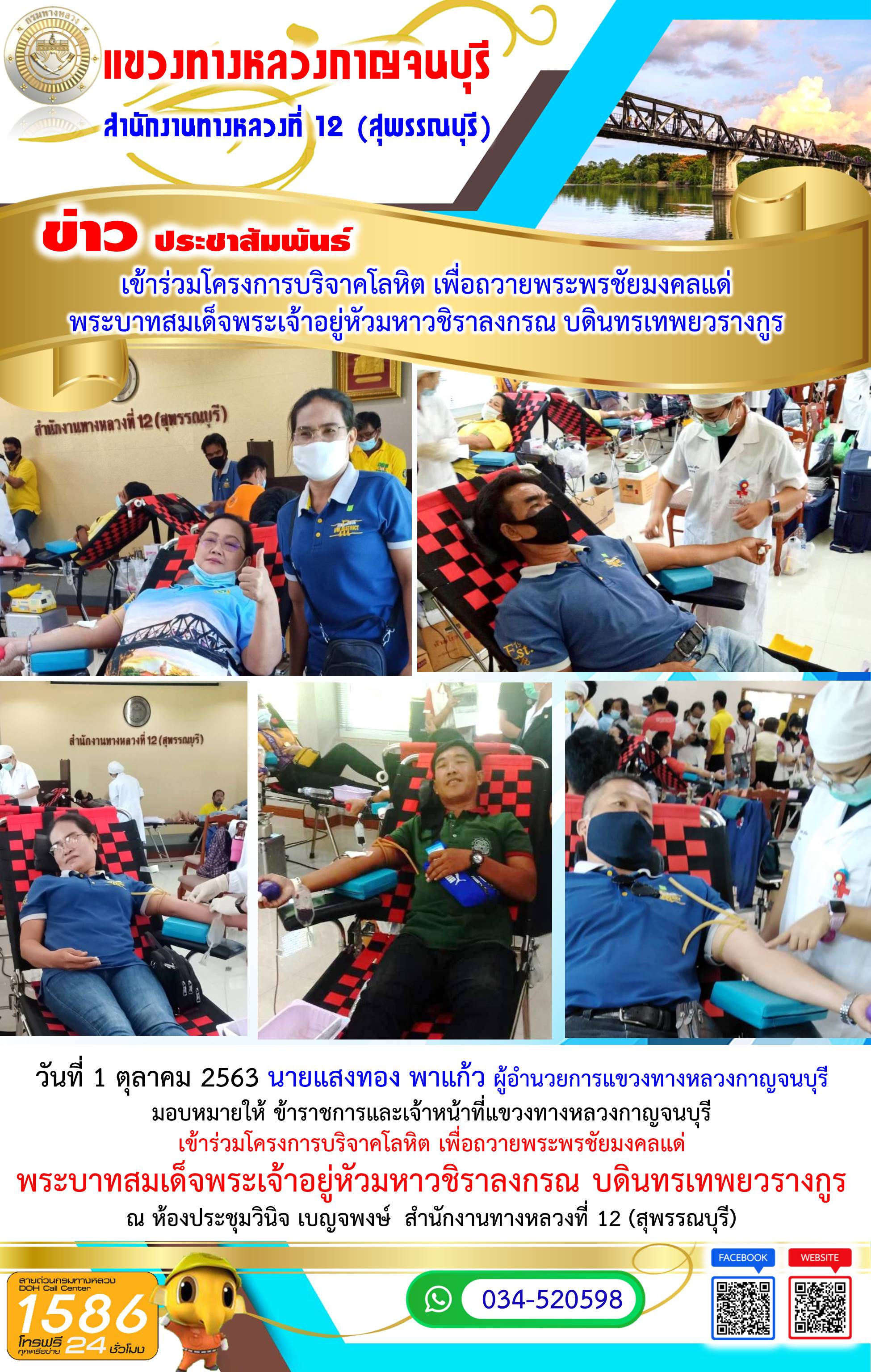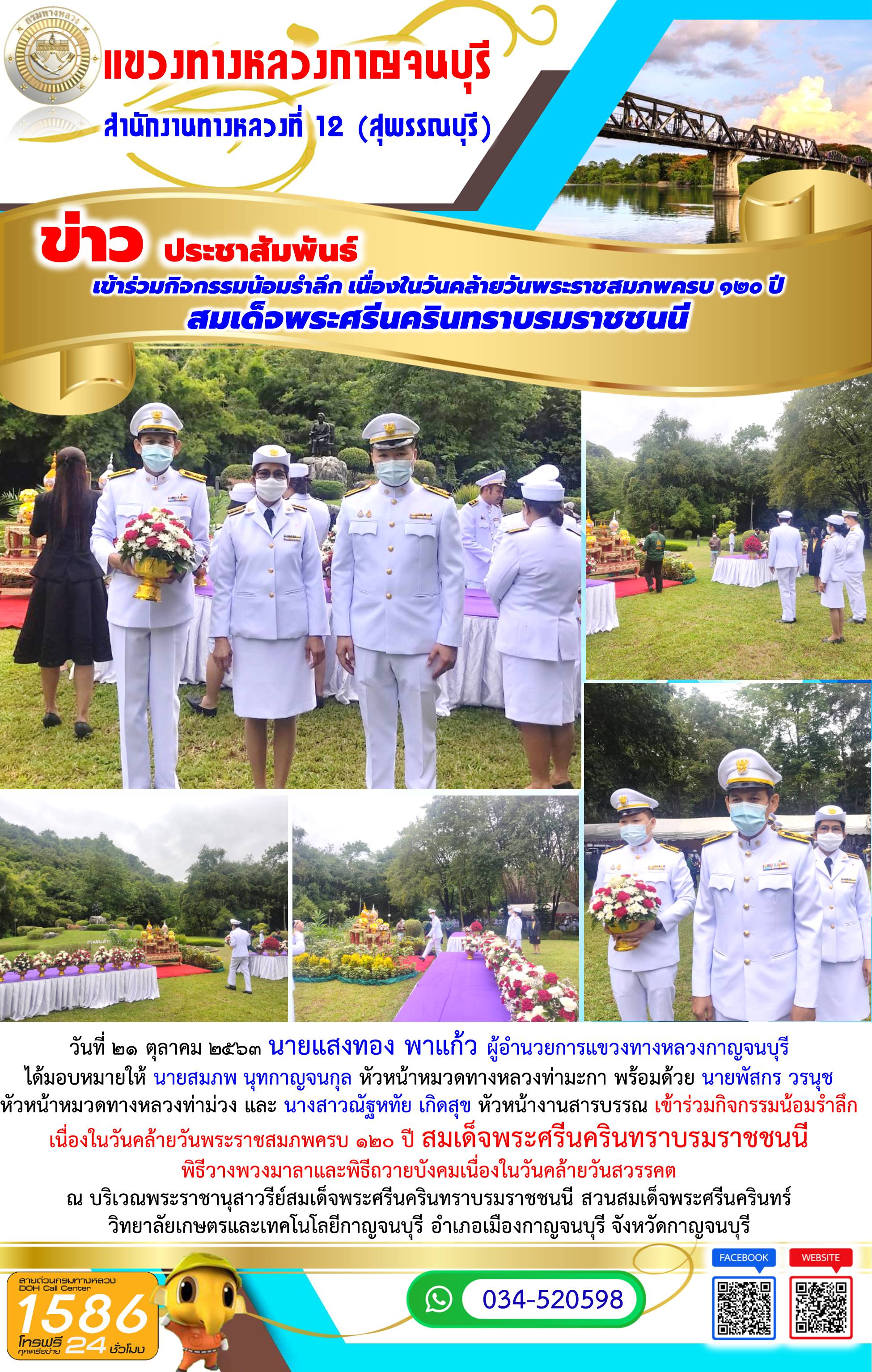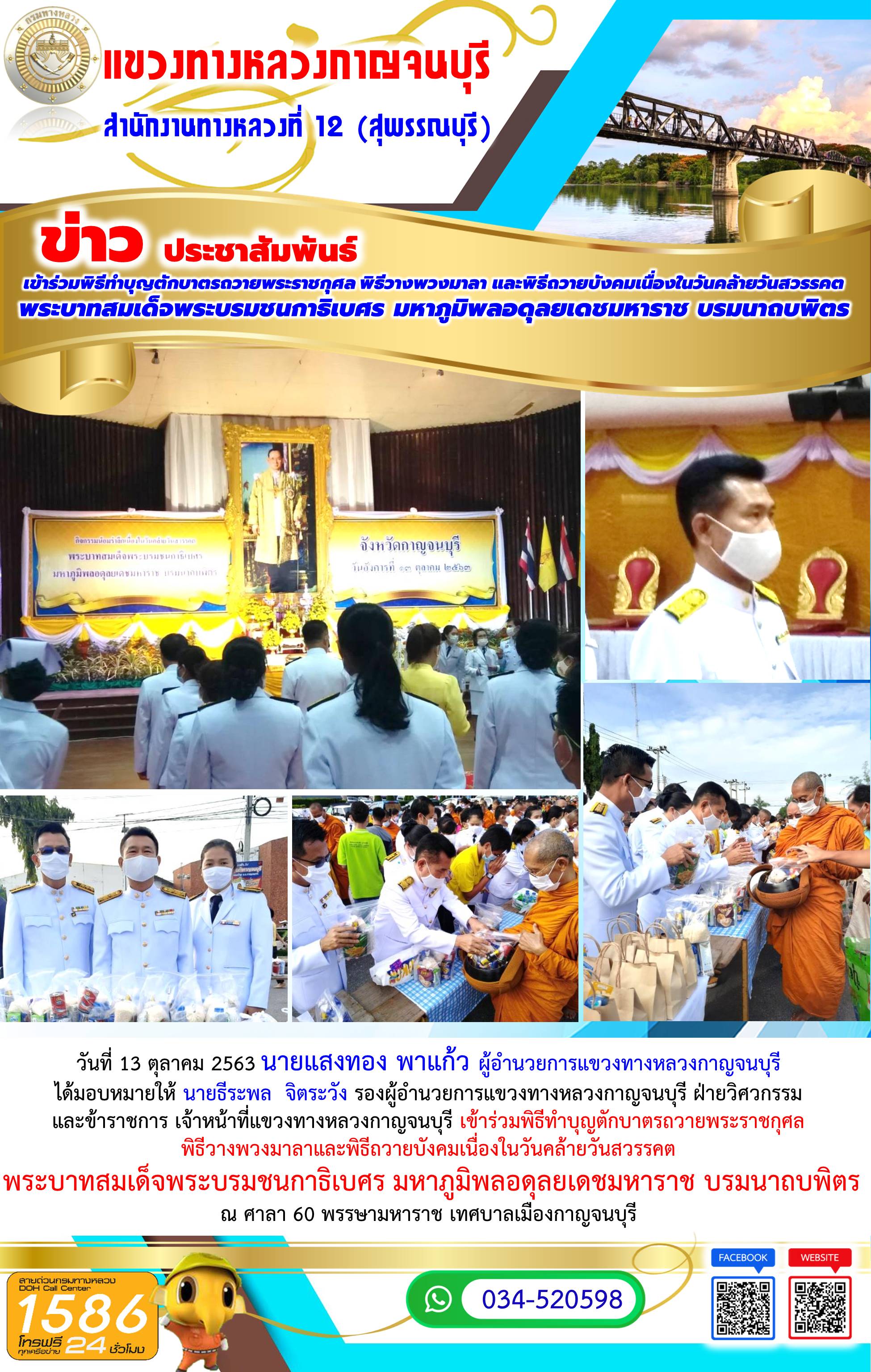 วันที่ 13 ตุลาคม 2563 นายแสงทอง พาแก้ว ผู้อำนวยการแขวงทางหลวงกาญจนบุรี ได้มอบหมายให้ นายธีระพล จิตระวัง รองผู้อำนวยการแขวงทางหลวงกาญจนบุรี ฝ่ายวิศวกรรม และข้าราชการ เจ้าหน้าที่แขวงทางหลวงกาญจนบุรี เข้าร่วมพิธีทำบุญตักบาตรถวายพระราชกุศล พิธีวางพวงมาลาและพิธีถวายบังคมเนื่องในวันคล้ายวันสวรรคต พระบาทสมเด็จพระบรมชนกาธิเบศร มหาภูมิพลอดุลยเดชมหาราช บรมนาถบพิตร ณ ศาลา 60 พรรษามหาราช เทศบาลเมืองกาญจนบุรี