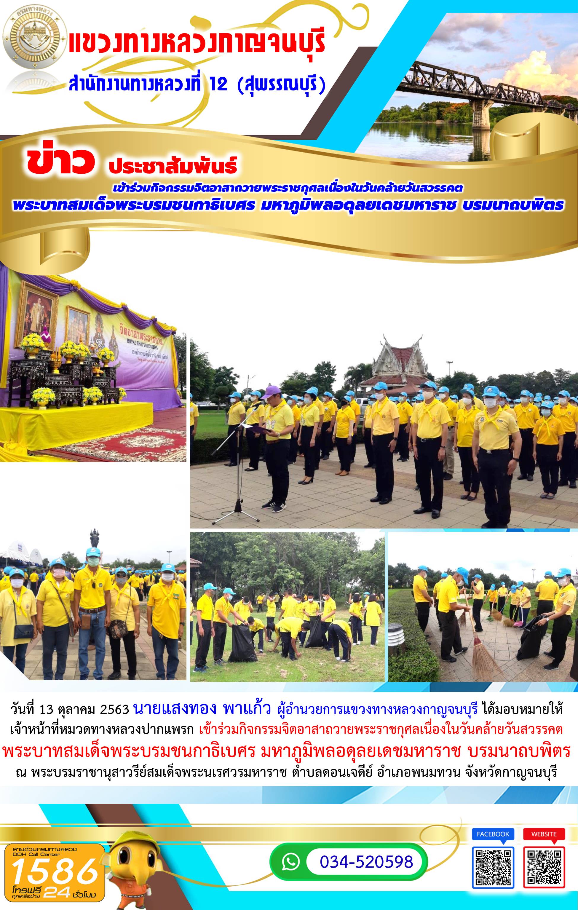 วันที่ 13 ตุลาคม 2563 นายแสงทอง พาแก้ว ผู้อำนวยการแขวงทางหลวงกาญจนบุรี ได้มอบหมายให้ เจ้าหน้าที่หมวดทางหลวงปากแพรก เข้าร่วมกิจกรรมจิตอาสาถวายพระราชกุศลเนื่องในวันคล้ายวันสวรรคต พระบาทสมเด็จพระบรมชนกาธิเบศร มหาภูมิพลอดุลยเดชมหาราช บรมนาถบพิตร ณ พระบรมราชานุสาวรีย์สมเด็จพระนเรศวรมหาราช ตำบลดอนเจดีย์ อำเภอพนมทวน จังหวัดกาญจนบุรี