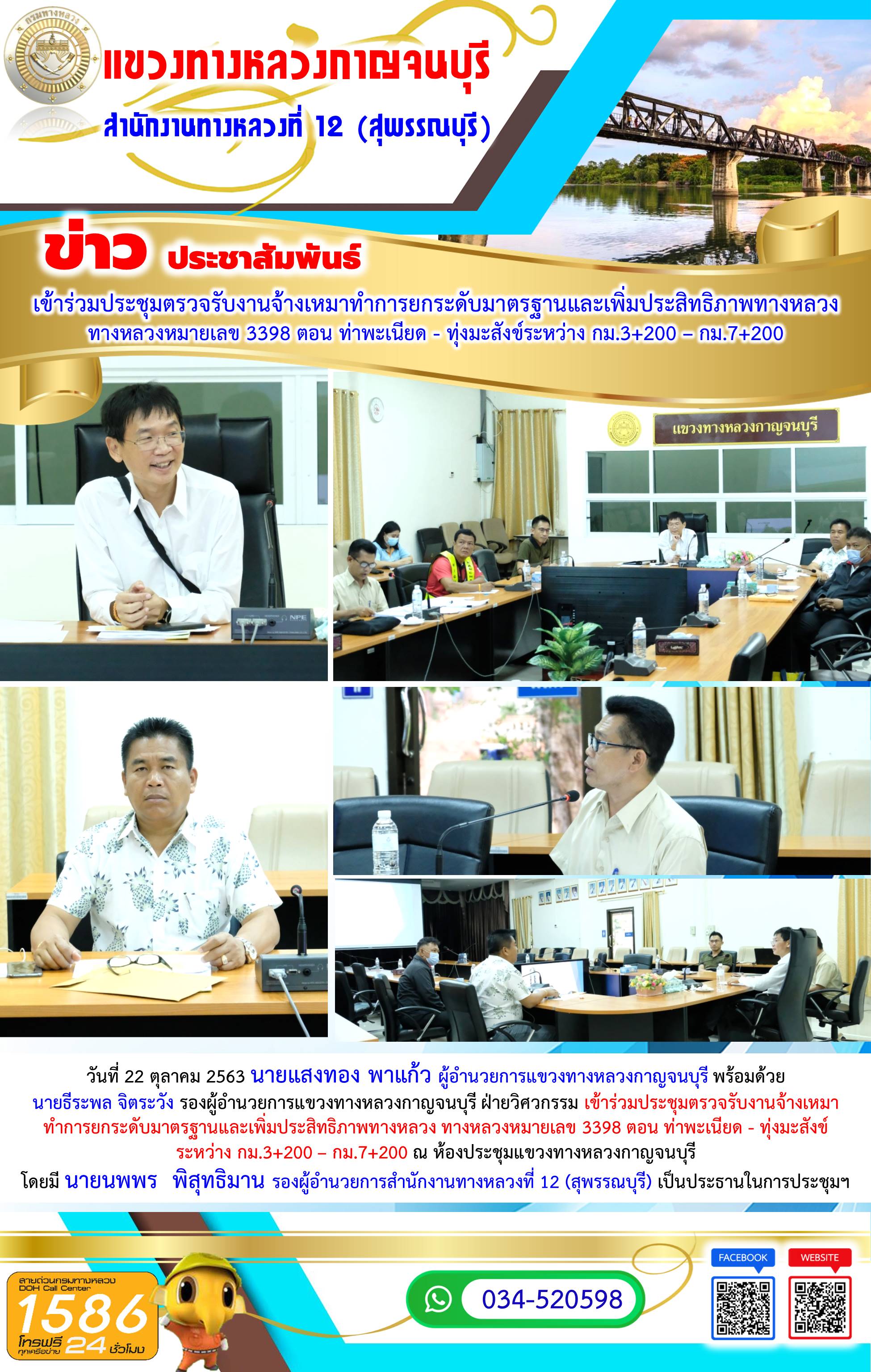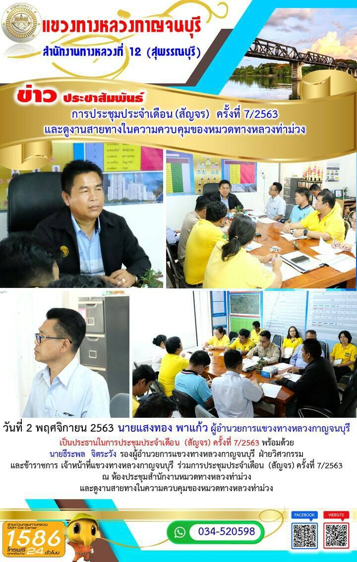 วันที่ 2 พฤศจิกายน 2563 นายแสงทอง พาแก้ว ผู้อำนวยการแขวงทางหลวงกาญจนบุรี เป็นประธานในการประชุมประจำเดือน (สัญจร) ครั้งที่ 7/2563 พร้อมด้วย นายธีระพล จิตระวัง รองผู้อำนวยการแขวงทางหลวงกาญจนบุรี ฝ่ายวิศวกรรม และข้าราชการ เจ้าหน้าที่แขวงทางหลวงกาญจนบุรี ร่วมการประชุมประจำเดือน (สัญจร) ครั้งที่ 7/2563 ณ ห้องประชุมสำนักงานหมวดทางหลวงท่าม่วง และดูงานสายทางในความควบคุมของหมวดทางหลวงท่าม่วง
