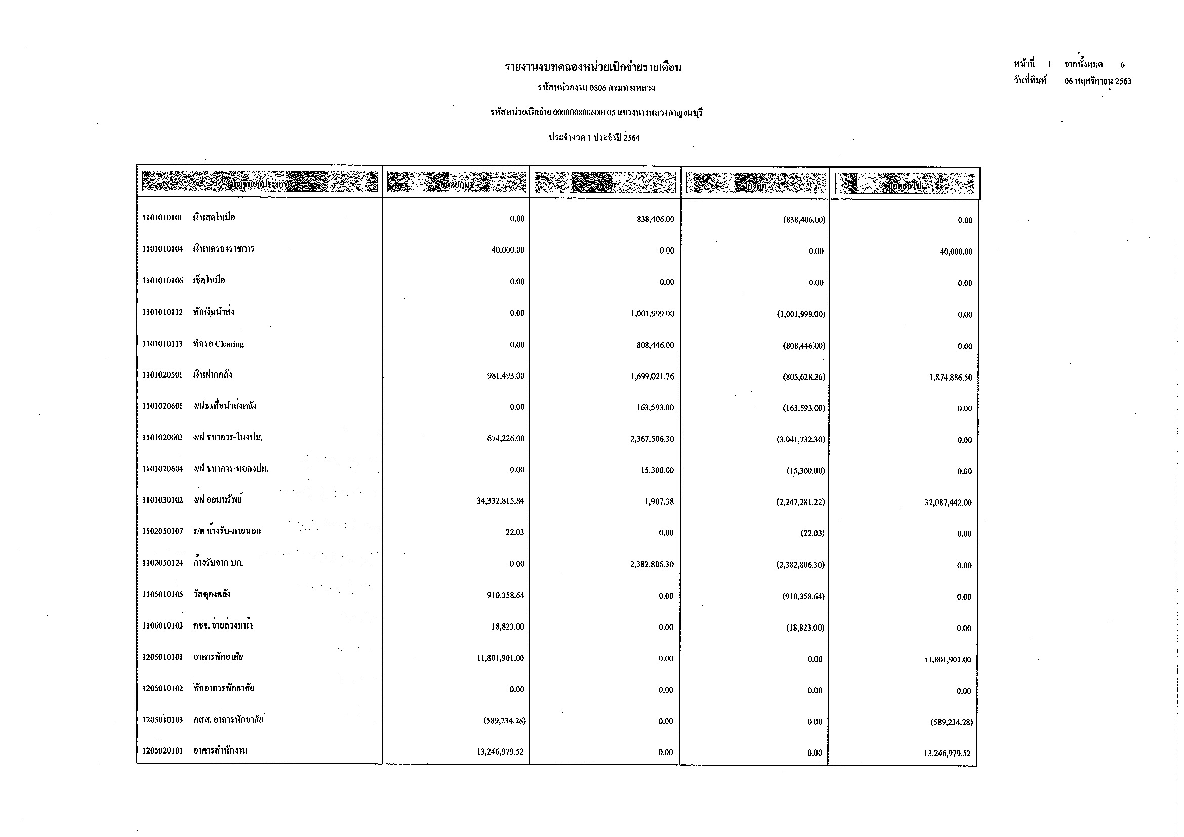 รายงานงบทดลองหน่วยเบิกจ่ายรายเดือน ประจำงวด 1 ประจำปีที่ 2564