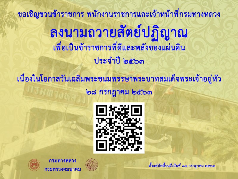 ขอเชิญชวนข้าราชการ พนักงานราชการ และเจ้าหน้าที่กรมทางหลวง ลงนามถวายสัตย์ปฏิญาณ ทางออนไลน์ (สแกน QR-Code) เพื่อเป็นข้าราชการที่ดีและพลังของแผ่นดิน ประจำปี ๒๕๖๓ เนื่องในโอกาสวันเฉลิมพระชนมพรรษาพระบาทสมเด็จพระเจ้าอยู่หัว ๒๘ กรกฎาคม ๒๕๖๓ ตั้งแต่บัดนี้จนถึงวันที่ ๓๑ กรกฎาคม ๒๕๖๓