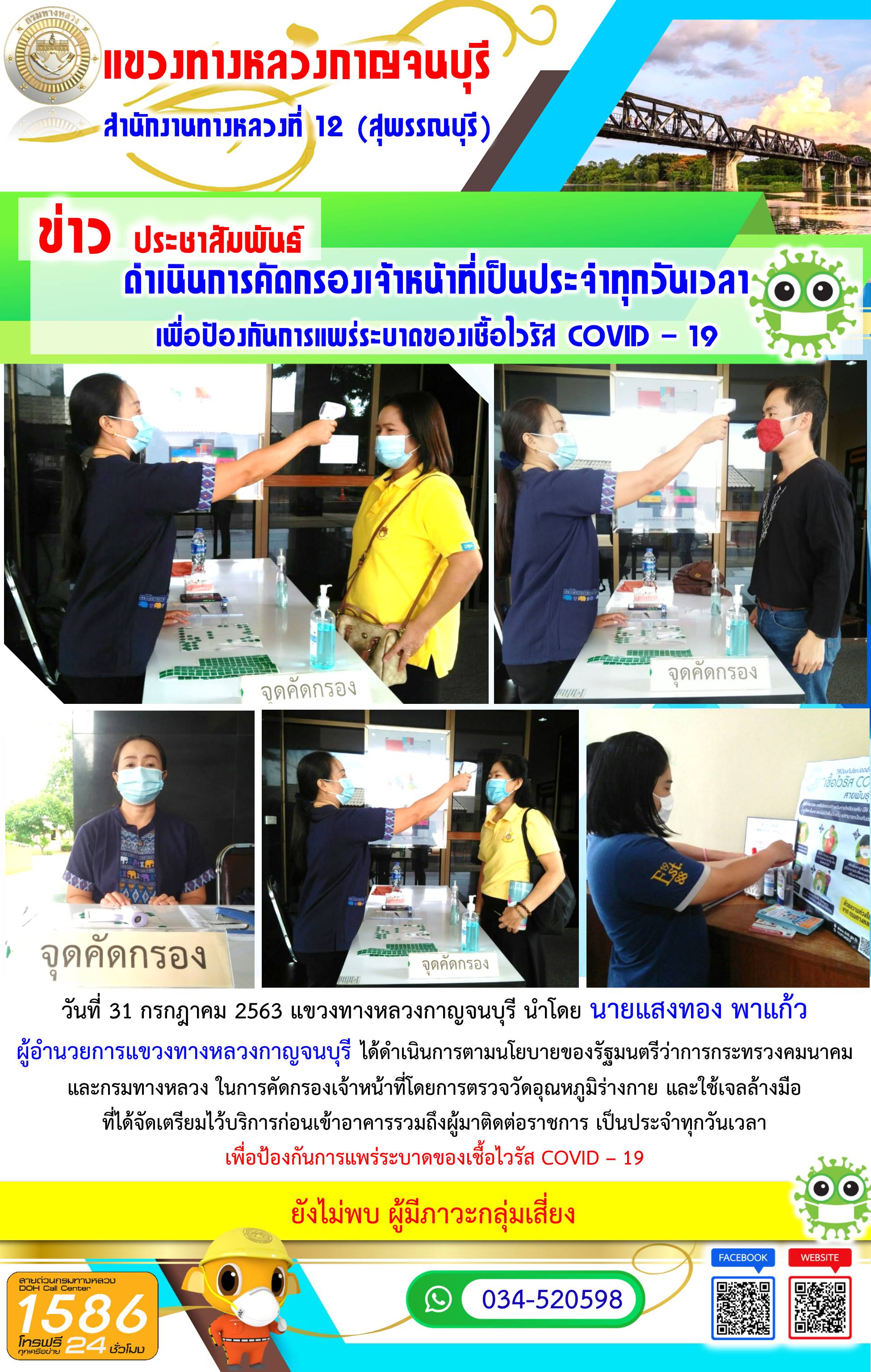 วันที่ 31 กรกฎาคม 2563 แขวงทางหลวงกาญจนบุรี นำโดย นายแสงทอง พาแก้ว ผู้อำนวยการแขวงทางหลวงกาญจนบุรี ได้ดำเนินการตามนโยบายของรัฐมนตรีว่าการกระทรวงคมนาคมและกรมทางหลวง ในการคัดกรองเจ้าหน้าที่โดยการตรวจวัดอุณหภูมิร่างกาย และใช้เจลล้างมือที่ได้จัดเตรียมไว้บริการก่อนเข้าอาคารรวมถึงผู้มาติดต่อราชการ เพื่อป้องกันการแพร่ระบาดของเชื้อไวรัส COVID – 19
