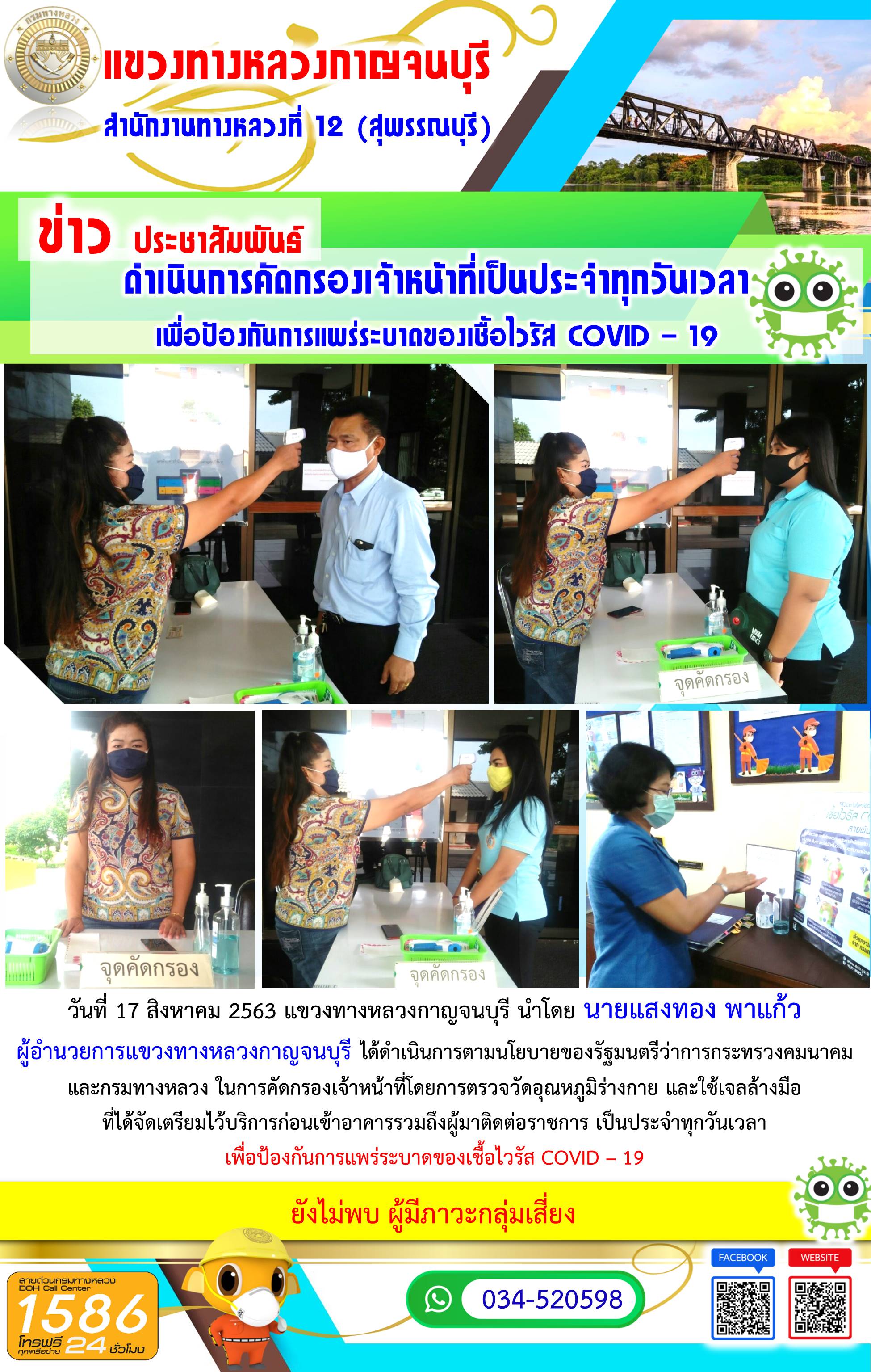 วันที่ 17 สิงหาคม 2563 แขวงทางหลวงกาญจนบุรี นำโดย นายแสงทอง พาแก้ว ผู้อำนวยการแขวงทางหลวงกาญจนบุรี ได้ดำเนินการตามนโยบายของรัฐมนตรีว่าการกระทรวงคมนาคมและกรมทางหลวง ในการคัดกรองเจ้าหน้าที่โดยการตรวจวัดอุณหภูมิร่างกาย และใช้เจลล้างมือที่ได้จัดเตรียมไว้บริการก่อนเข้าอาคารรวมถึงผู้มาติดต่อราชการ เพื่อป้องกันการแพร่ระบาดของเชื้อไวรัส COVID – 19