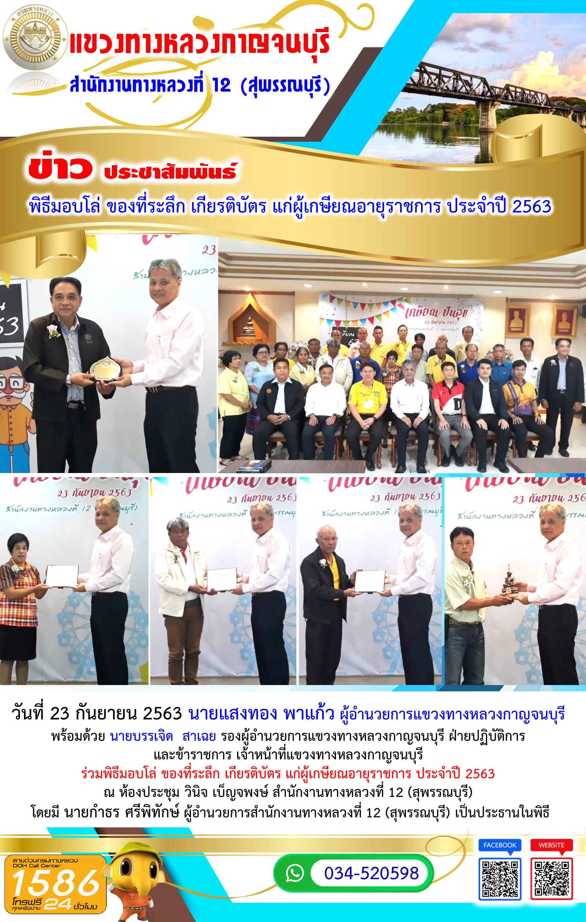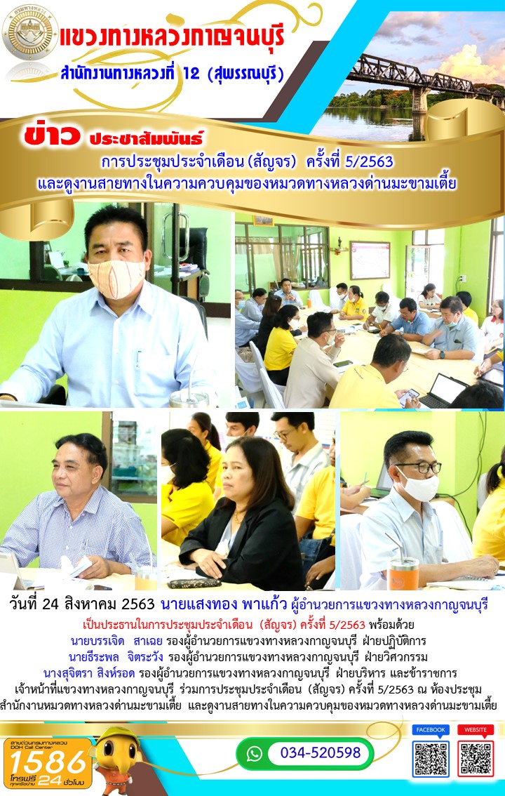 วันที่ 21 กันยายน 2563 นายแสงทอง พาแก้ว ผู้อำนวยการแขวงทางหลวงกาญจนบุรี เป็นประธานในการประชุมประจำเดือน (สัญจร) ครั้งที่ 6/2563 พร้อมด้วย นายบรรเจิด สาเฉย รองผู้อำนวยการแขวงทางหลวงกาญจนบุรี ฝ่ายปฏิบัติการ นายธีระพล จิตระวัง รองผู้อำนวยการแขวงทางหลวงกาญจนบุรี ฝ่ายวิศวกรรม และข้าราชการ เจ้าหน้าที่แขวงทางหลวงกาญจนบุรี ร่วมการประชุมประจำเดือน (สัญจร) ครั้งที่ 6/2563 ณ ห้องประชุมสำนักงานหมวดทางหลวงหนองบัว และดูงานสายทางในความควบคุมของหมวดทางหลวงหนองบัว