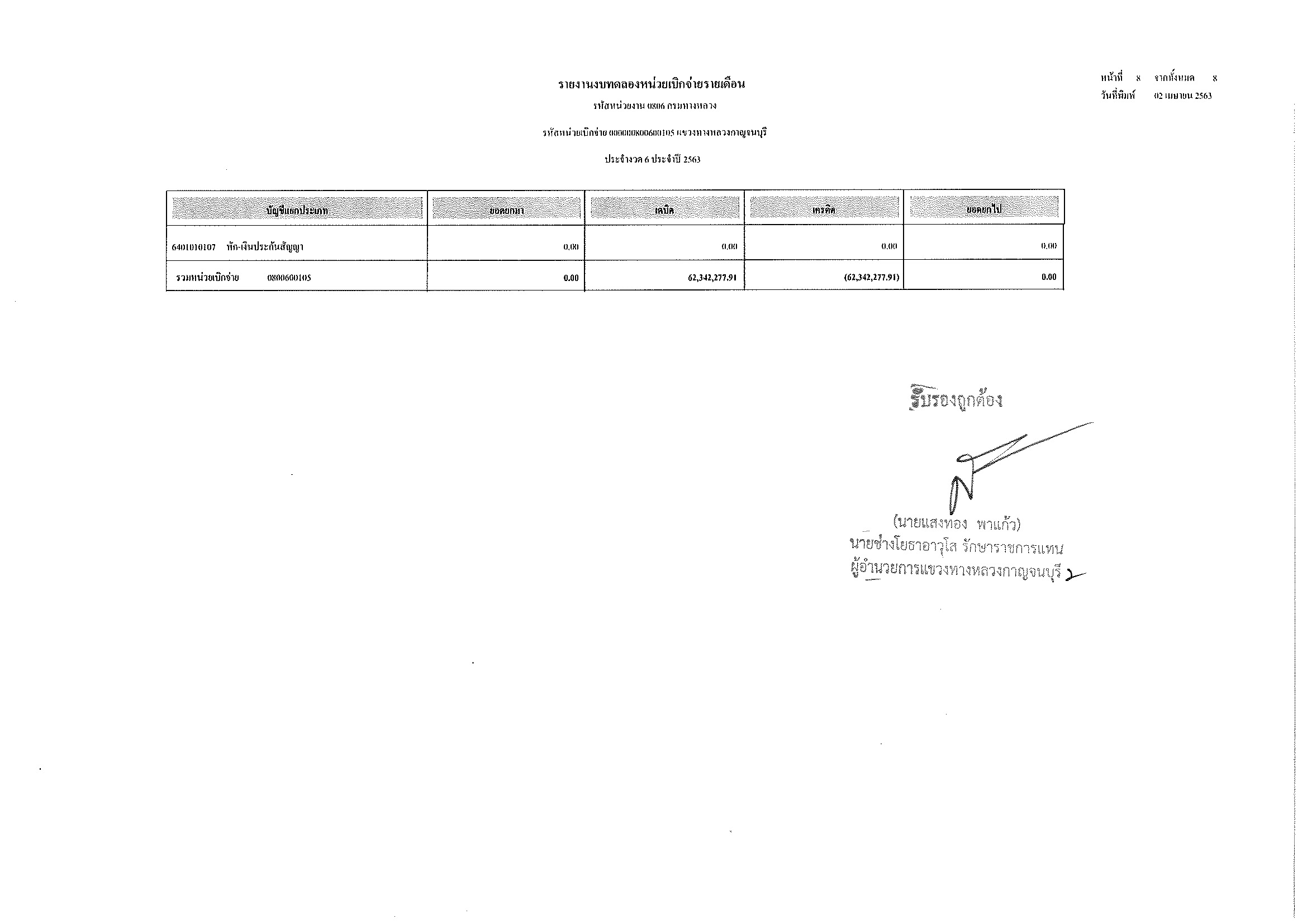 รายงานงบทดลองหน่วยเบิกจ่ายรายเดือน ประจำงวด 6 ประจำปีที่ 2563