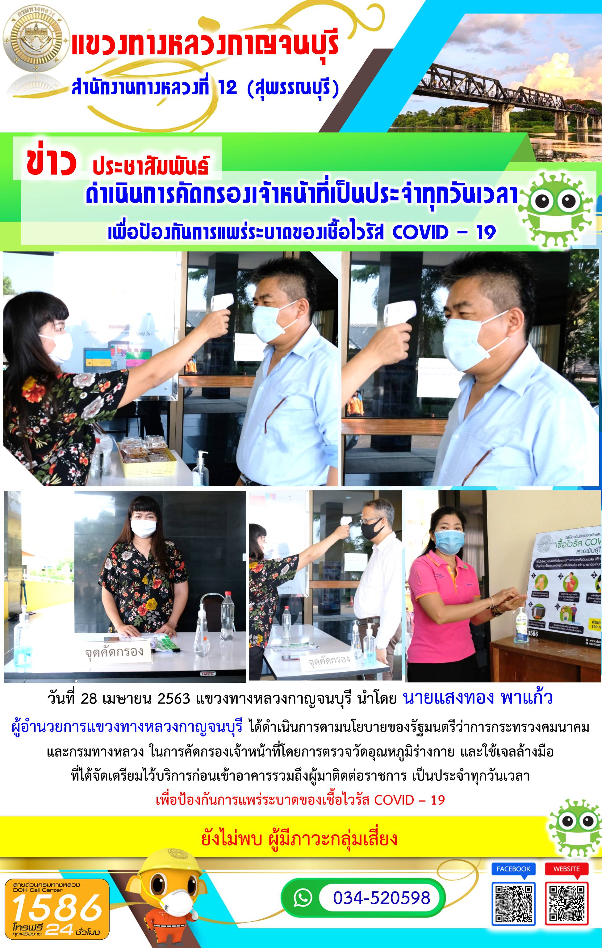 วันที่ 28 เมษายน 2563 แขวงทางหลวงกาญจนบุรี นำโดย นายแสงทอง พาแก้ว ผู้อำนวยการแขวงทางหลวงกาญจนบุรี ได้ดำเนินการตามนโยบายของรัฐมนตรีว่าการกระทรวงคมนาคมและกรมทางหลวง ในการคัดกรองเจ้าหน้าที่โดยการตรวจวัดอุณหภูมิร่างกาย และใช้เจลล้างมือที่ได้จัดเตรียมไว้บริการก่อนเข้าอาคารรวมถึงผู้มาติดต่อราชการ เพื่อป้องกันการแพร่ระบาดของเชื้อไวรัส COVID – 19