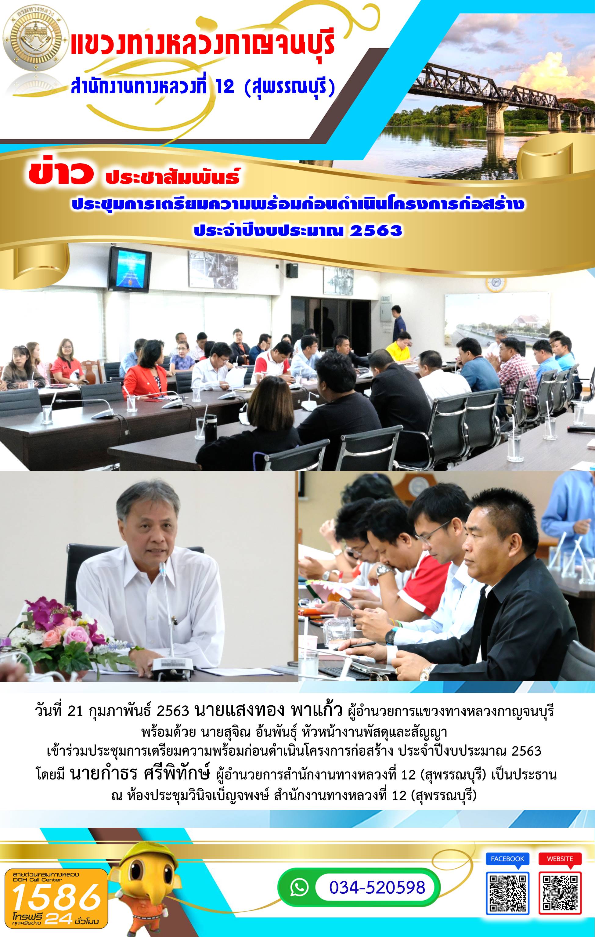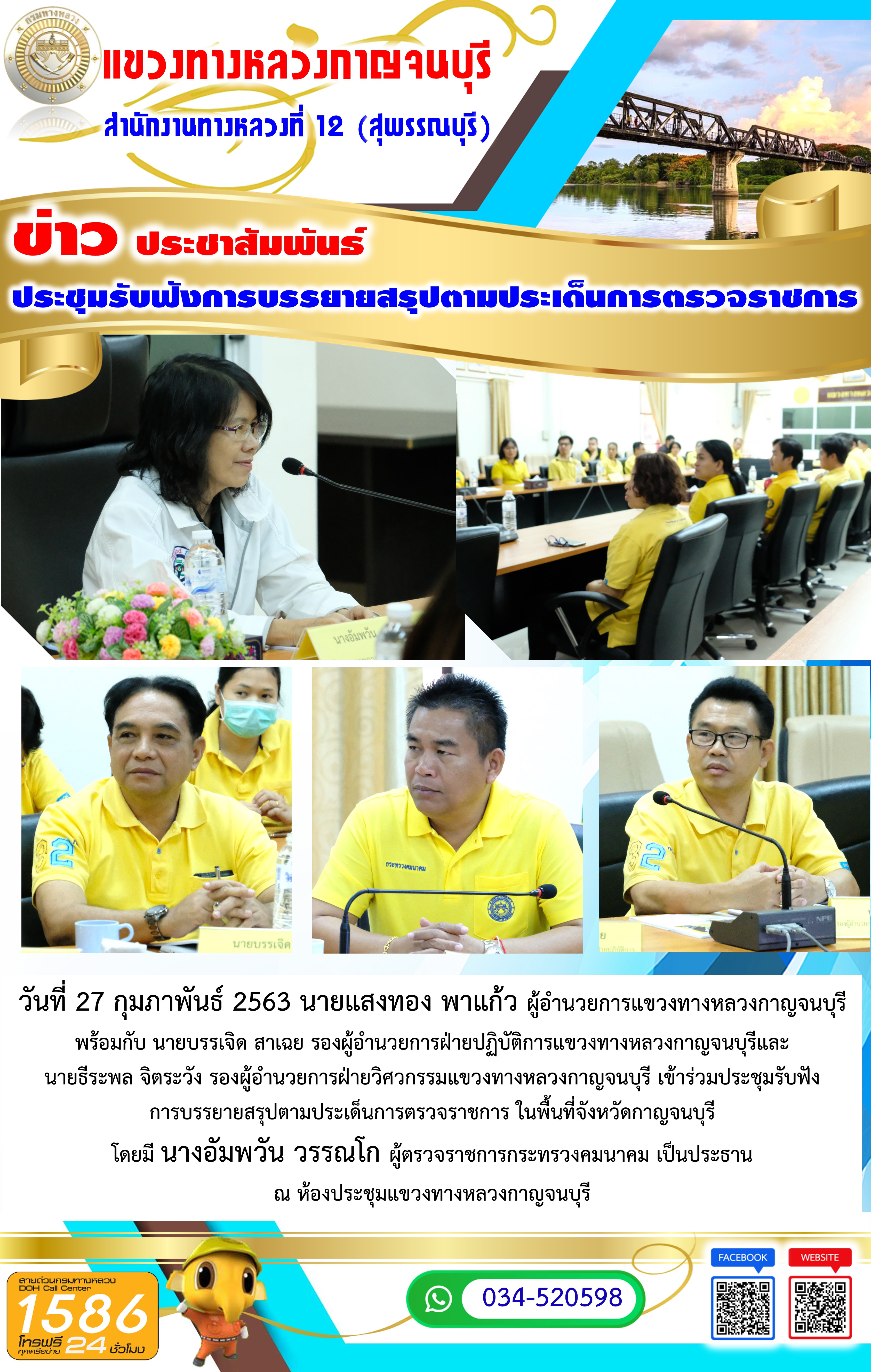 เข้าร่วมประชุมรับฟังการบรรยายสรุปตามประเด็นการตรวจราชการ ในพื้นที่จังหวัดกาญจนบุรี โดยมี นางอัมพวัน วรรณโก ผู้ตรวจราชการกระทรวงคมนาคม เป็นประธาน ณ ห้องประชุมแขวงทางหลวงกาญจนบุรี