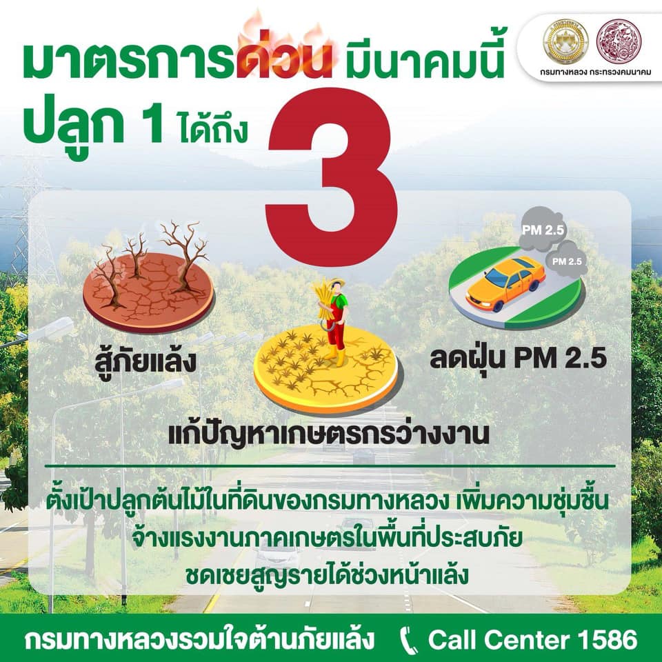 คมนาคมกำชับกรมทางหลวงแจกน้ำบรรเทาทุกข์ภัยแล้งอย่างต่อเนื่องกรมทางหลวงเดินหน้าคลายความเดือดร้อนชาวบ้าน และหน่วยงานต่าง ๆ ช่วงภัยแล้งระดมรถบรรทุกน้ำ 810 คัน แจกน้ำดื่มน้ำใช้กว่า 4 ล้านลิตร 4,601 ครัวเรือนทั่วประเทศ ช่วยดับไฟป่า 225 ครั้ง แนะขาดน้ำโทรสายด่วนกรมทางหลวง 1586 ตลอด 24 ชั่วโมง ออกนโยบายหน่วยงานสังกัดจ้างเกษตรกร ทำงานในโครงการที่มีอยู่ชดเชยรายได้สูญ พร้อมแผนช่วยรายได้ชาวสวนยางสั่งเพิ่มปริมาณใช้น้ำยางดิบปีนี้ 26,564 ตัน