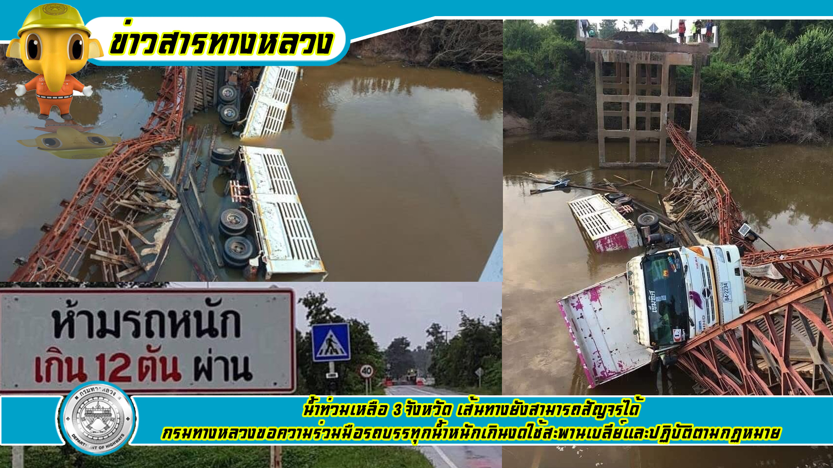น้ำท่วมเหลือ 3 จังหวัด เส้นทางยังสามารถสัญจรได้ กรมทางหลวงขอความร่วมมือรถบรรทุกน้ำหนักเกินงดใช้สะพานเบลีย์และปฏิบัติตามกฏหมาย