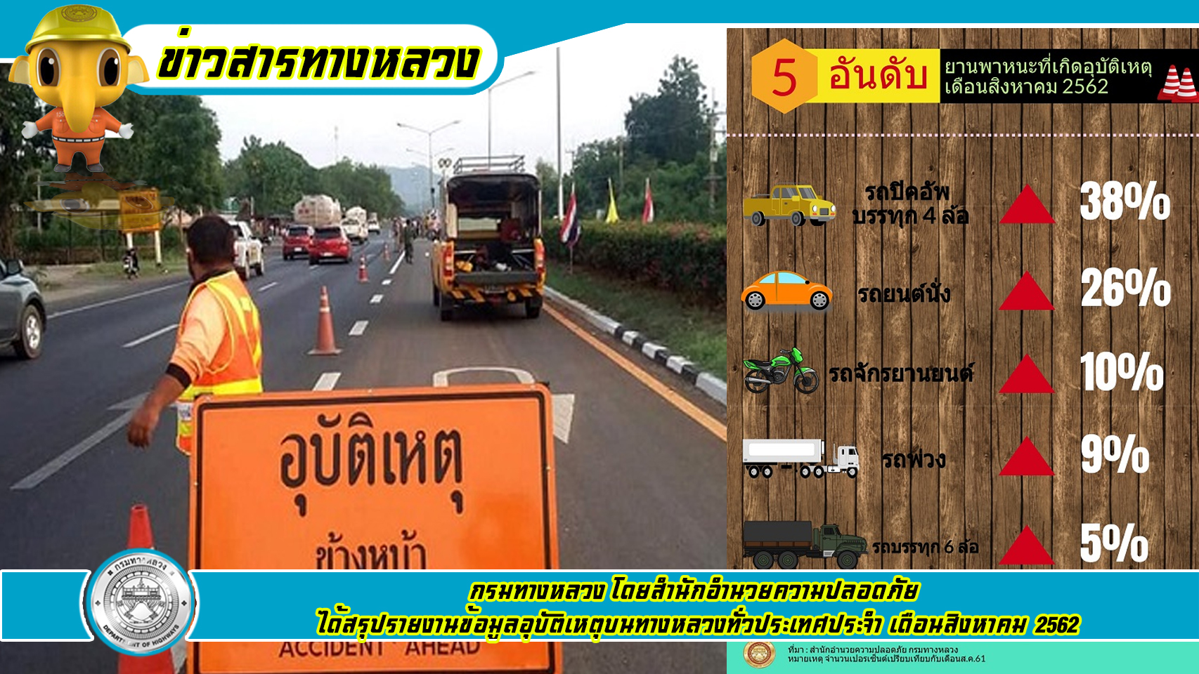 กรมทางหลวง สรุปอุบัติเหตุบนทางหลวงเดือนส.ค. 62 พร้อมขอความร่วมมือปฏิบัติตามกฎจราจร พบอุบัติเหตุแจ้งสายด่วน 1586