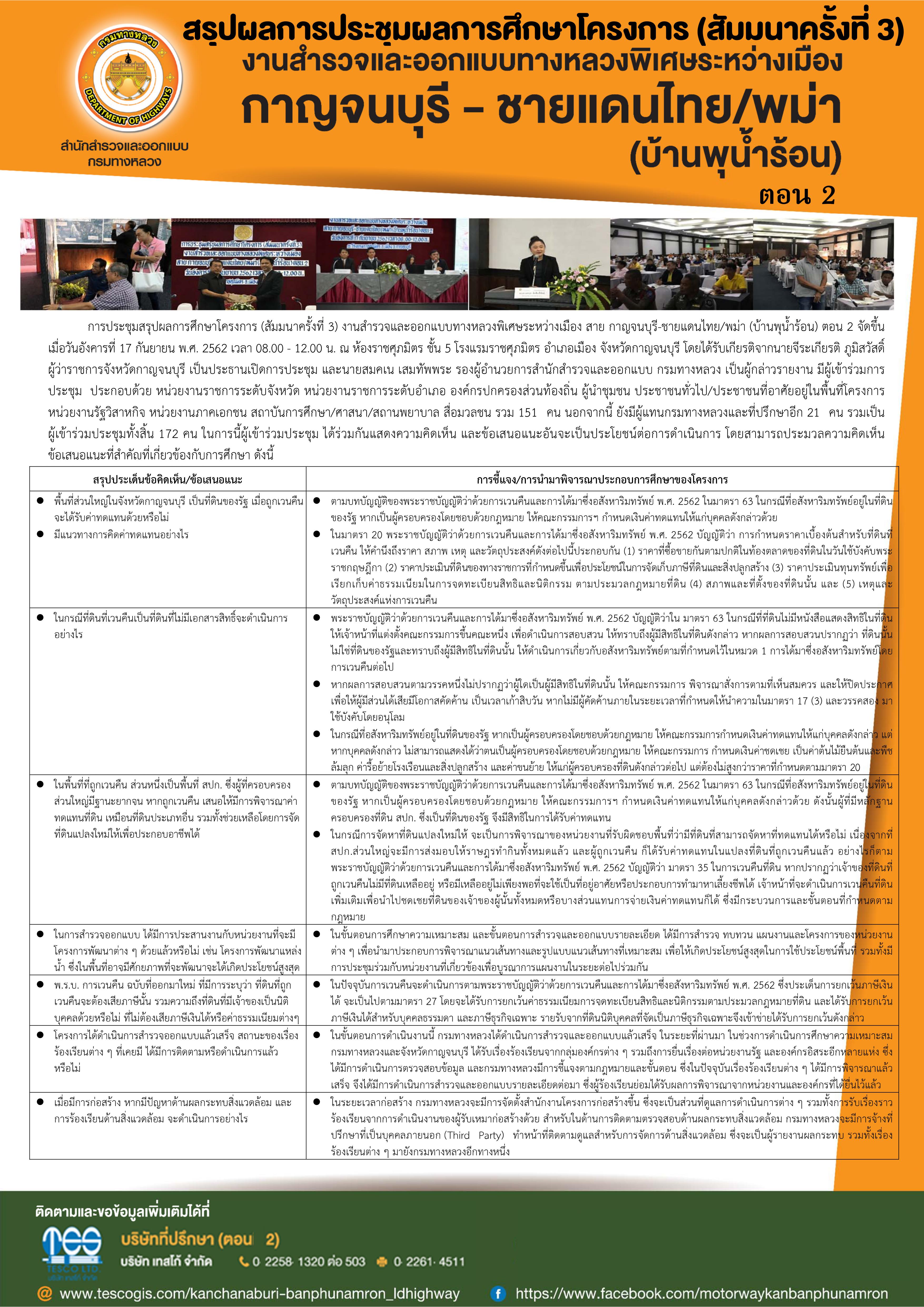 ประชาสัมพันธ์ สรุปผลการประชุมผลการศึกษาโครงการ (สัมนาครั้งที่ 3) งานสำรวจและออกแบบทางหลวงพิเศษระหว่างเมือง กาญจนบุรี - ชายแดนไทย/พม่า(บ้านพุน้ำร้อน)