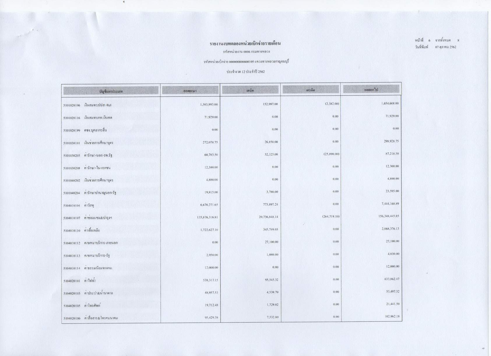 รายงานงบทดลองหน่วยเบิกจ่ายรายเดือน ประจำงวดที่ 12 ประจำปี 2562