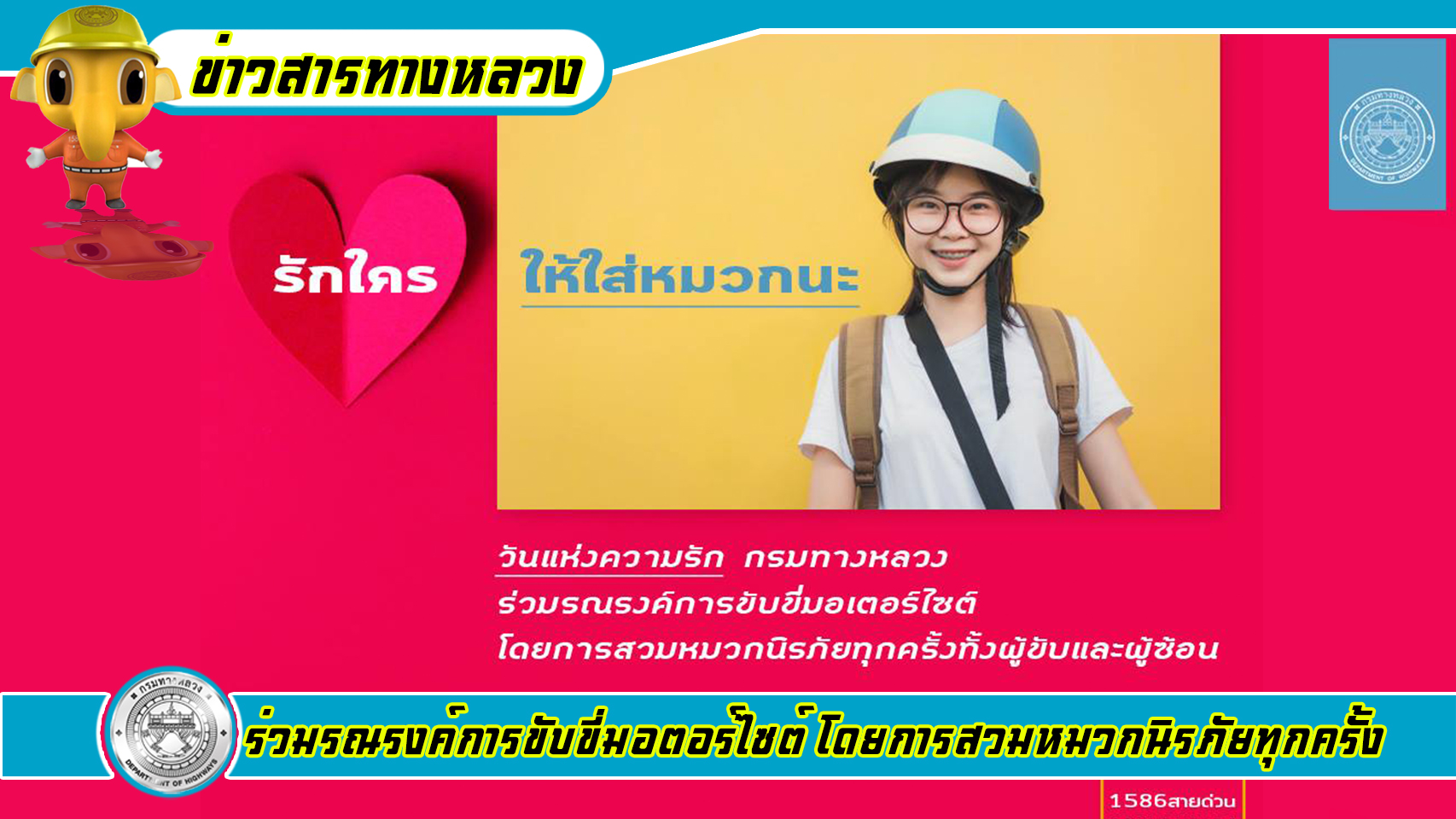 660 14/02/2562 เนื่องในวันแห่งความรัก กรมทางหลวง ร่วมรณรงค์การขับขี่มอเตอร์ไซต์ โดยการสวมหมวกนิรภัยทุกครั้งทั้งผู้ขับและผู้ซ้อน
