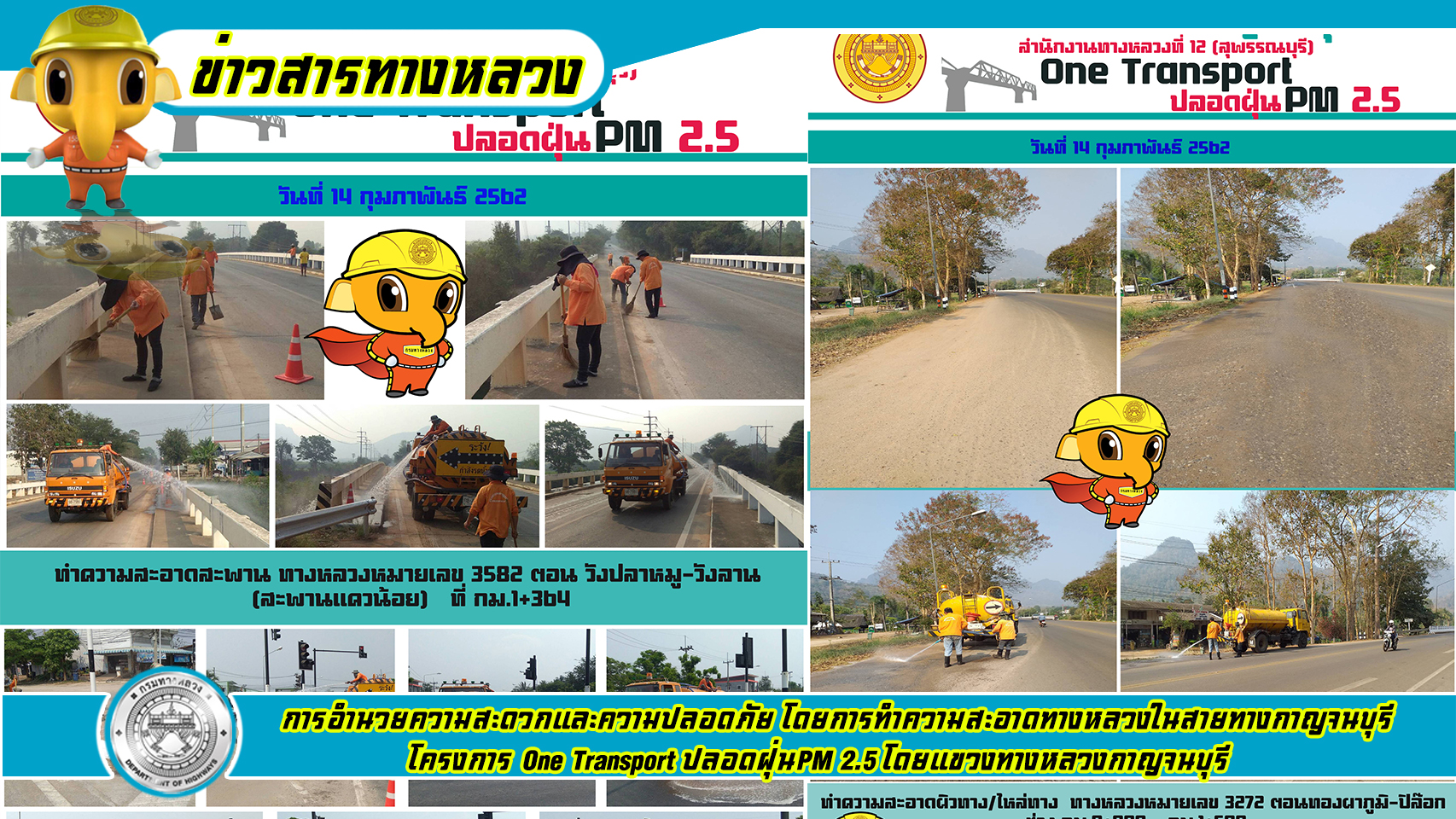 659 15/02/2562 การอำนวยความสะดวกและความปลอดภัย โดยการทำความสะอาดทางหลวงในสายทางกาญจนบุรี โครงการ One Transport ปลอดฝุ่น PM 2.5 โดยแขวงทางหลวงกาญจนบุรี สำนักงานทางหลวงที่ 12 (สุพรรณบุรี)