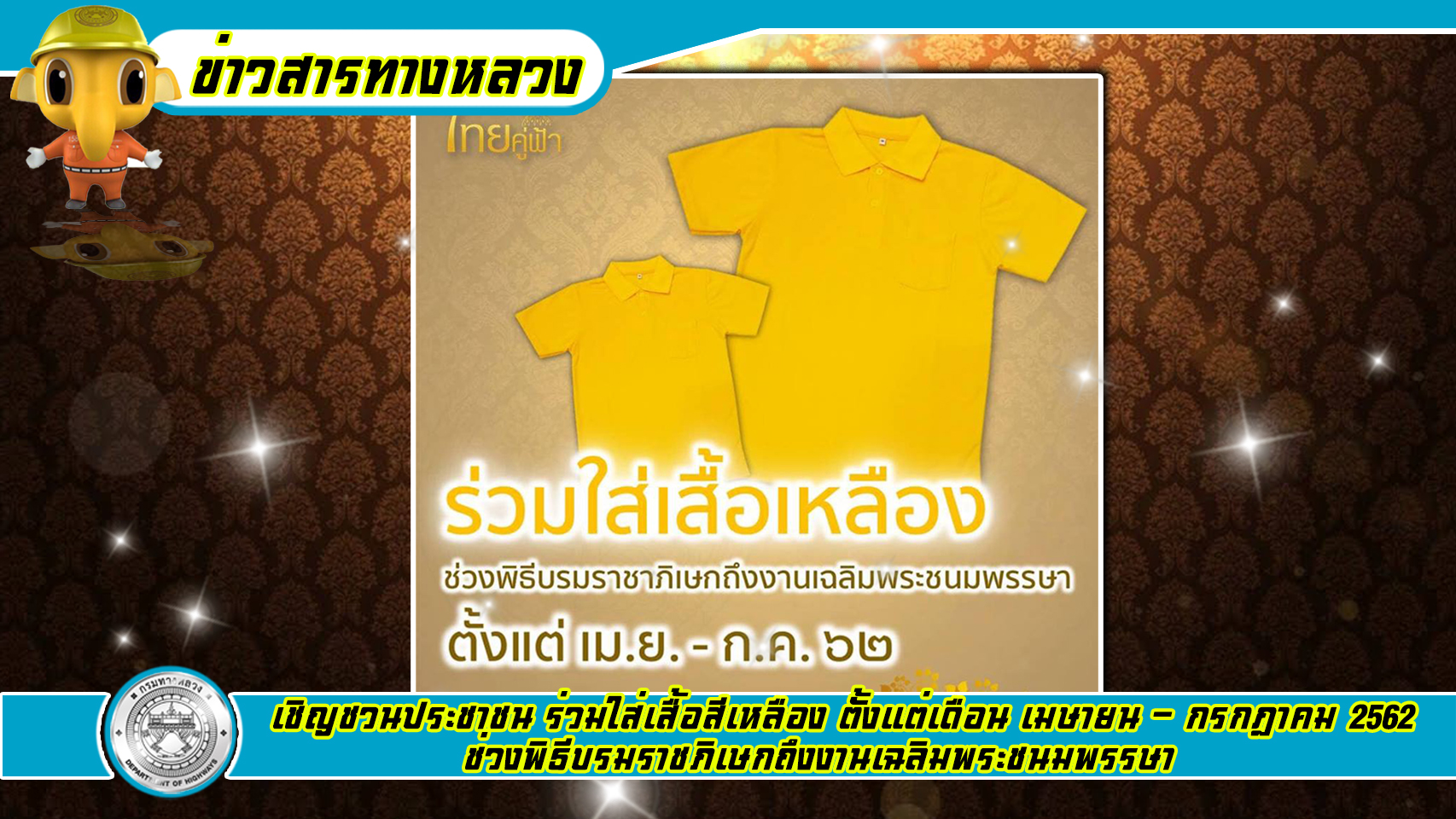 651 01/03/2562 เชิญชวนประชาชนและเจ้าหน้าที่ทุกท่าน ร่วมใส่เสื้อสีเหลือง ตั้งแต่เดือน เมษายน - กรกฎาคม 2562 ช่วงพิธีบรมราชภิเษกถึงงานเฉลิมพระชนมพรรษา