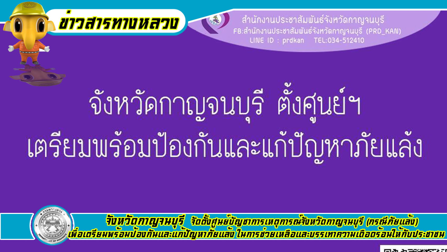 648 07/03/2562 จังหวัดกาญจนบุรีจัดตั้งศูนย์บัญชาการเหตุการณ์จังหวัดกาญจนบุรี (กรณีภัยแล้ง) เพื่อเตรียมพร้อมป้องกันและแก้ปัญหาภัยแล้ง ในการช่วยเหลือและบรรเทาความเดือดร้อนให้กับประชาชน