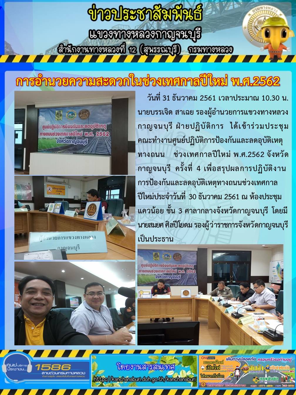 นายบรรเจิด สาเฉย รองผู้อำนวยการแขวงทางหลวงกาญจนบุรี ฝ่ายปฏิบัติการ ได้เข้าร่วมประชุมคณะทำงานศูนย์ปฏิบัติการป้องกันและลดอุบัติเหตุทางถนน ช่วงเทศกาลปีใหม่ พ.ศ.2562