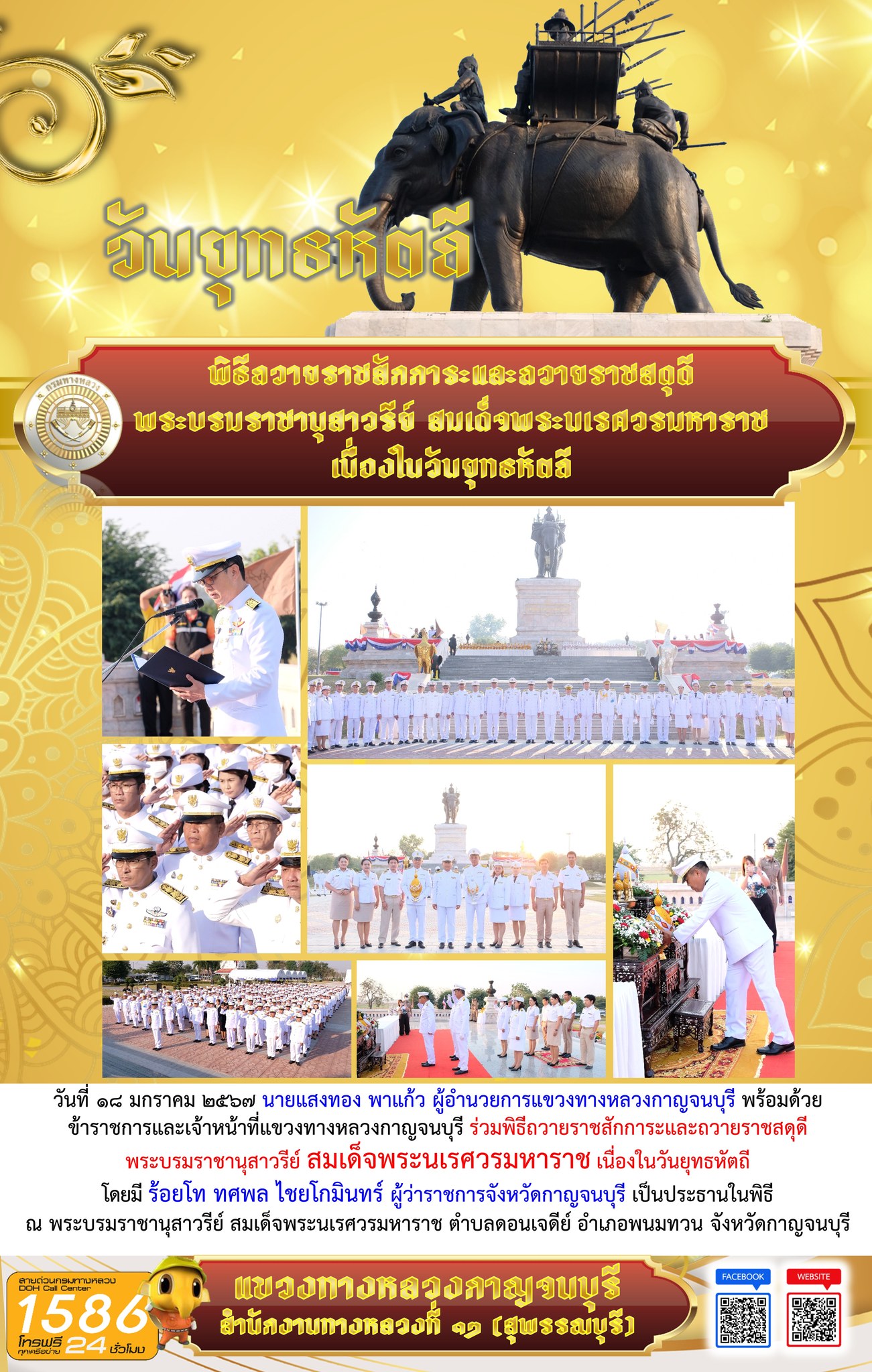 วันที่ ๑๘ มกราคม ๒๕๖๗ นายแสงทอง พาแก้ว ผู้อำนวยการแขวงทางหลวงกาญจนบุรี พร้อมด้วย ข้าราชการและเจ้าหน้าที่แขวงทางหลวงกาญจนบุรี ร่วมพิธีถวายราชสักการะและถวายราชสดุดี พระบรมราชานุสาวรีย์ สมเด็จพระนเรศวรมหาราช เนื่องในวันยุทธหัตถี โดยมี ร้อยโท ทศพล ไชยโกมินทร์ ผู้ว่าราชการจังหวัดกาญจนบุรี เป็นประธานในพิธี ณ พระบรมราชานุสาวรีย์ สมเด็จพระนเรศวรมหาราช ตำบลดอนเจดีย์ อำเภอพนมทวน จังหวัดกาญจนบุรี
