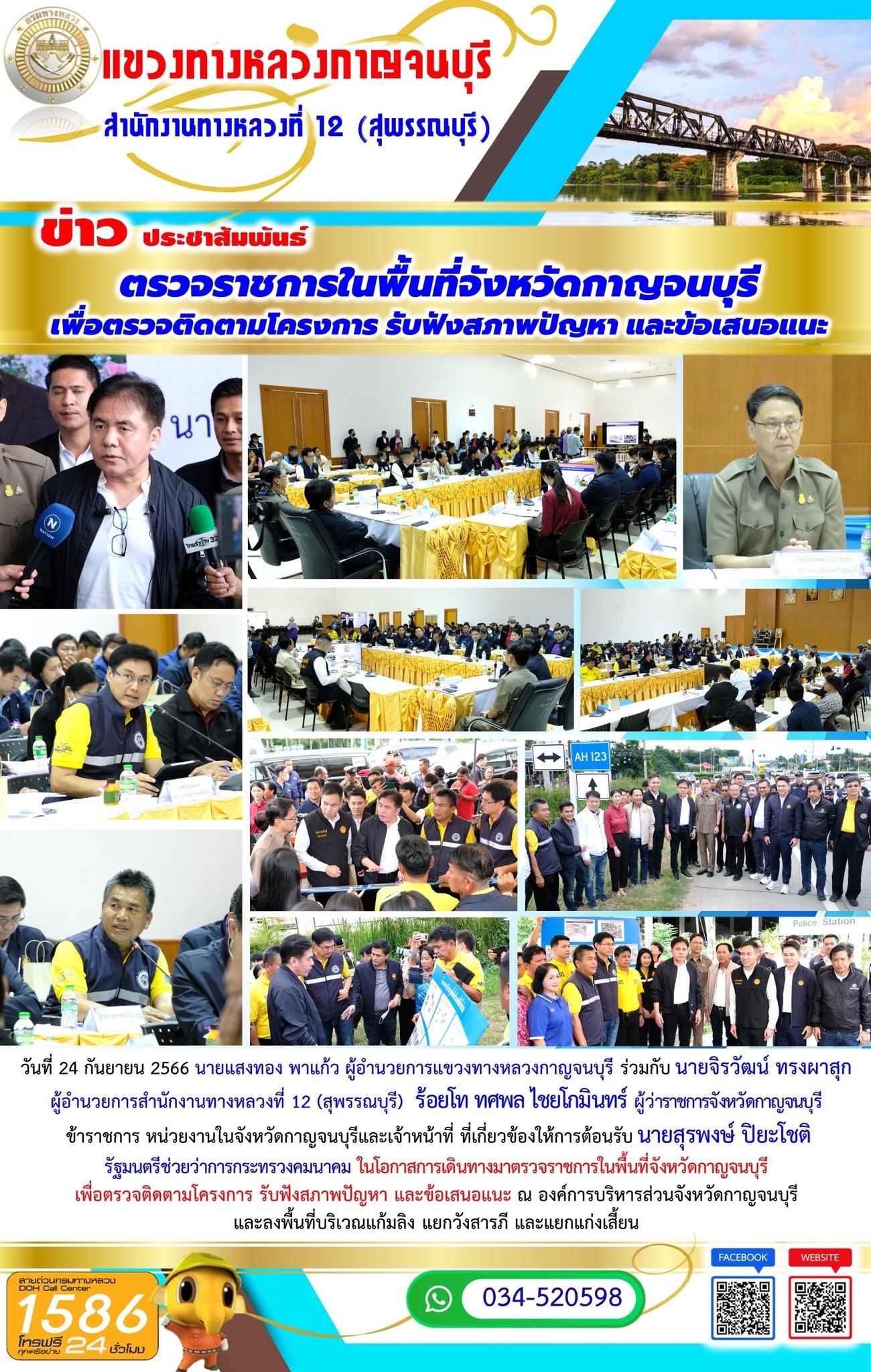 วันที่ 24 กันยายน 2566 นายแสงทอง พาแก้ว ผู้อำนวยการแขวงทางหลวงกาญจนบุรี ร่วมกับ นายจิรวัฒน์ ทรงผาสุก ผู้อำนวยการสำนักงานทางหลวงที่ 12 (สุพรรณบุรี) ร้อยโท ทศพล ไชยโกมินทร์ ผู้ว่าราชการจังหวัดกาญจนบุรี ข้าราชการ หน่วยงานในจังหวัดกาญจนบุรีและเจ้าหน้าที่ ที่เกี่ยวข้องให้การต้อนรับ นายสุรพงษ์ ปิยะโชติ รัฐมนตรีช่วยว่าการกระทรวงคมนาคม ในโอกาสการเดินทางมาตรวจราชการในพื้นที่จังหวัดกาญจนบุรี เพื่อตรวจติดตามโครงการ รับฟังสภาพปัญหา และข้อเสนอแนะ ณ องค์การบริหารส่วนจังหวัดกาญจนบุรี