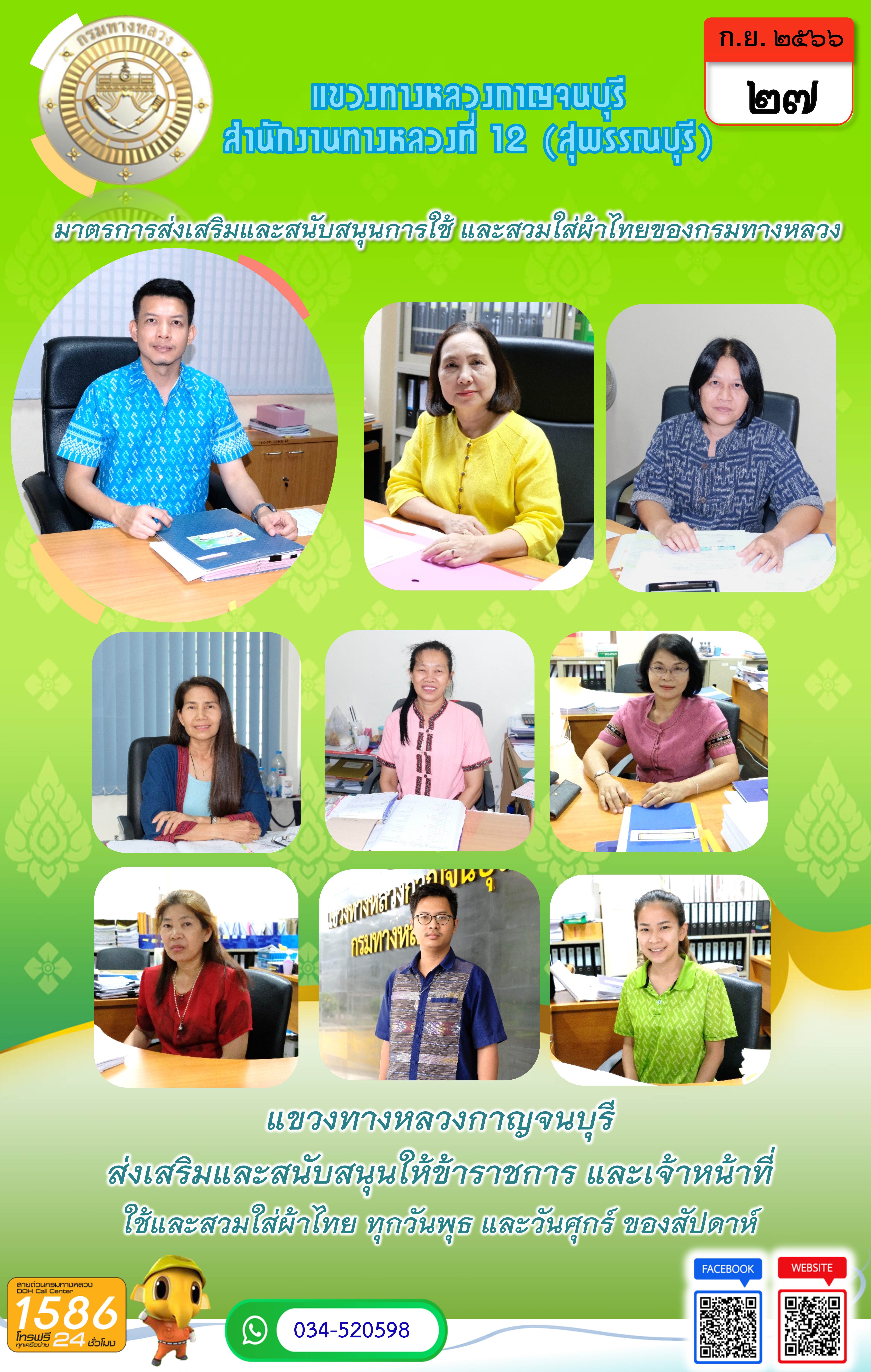 วันที่ 27 ก.ย. 2566 แขวงทางหลวงกาญจนบุรี รณรงค์แต่งกายด้วยผ้าไทยเพื่อส่งเสริมและสนับสนุนการใช้และสวมใส่ผ้าไทย เป็นการอนุรักษ์และสืบสานภูมิปัญญาของไทย สร้างค่านิยมและการตระหนักรับรู้การรักษามรดกและอัตลักษณ์ภูมิปัญญาของไทย