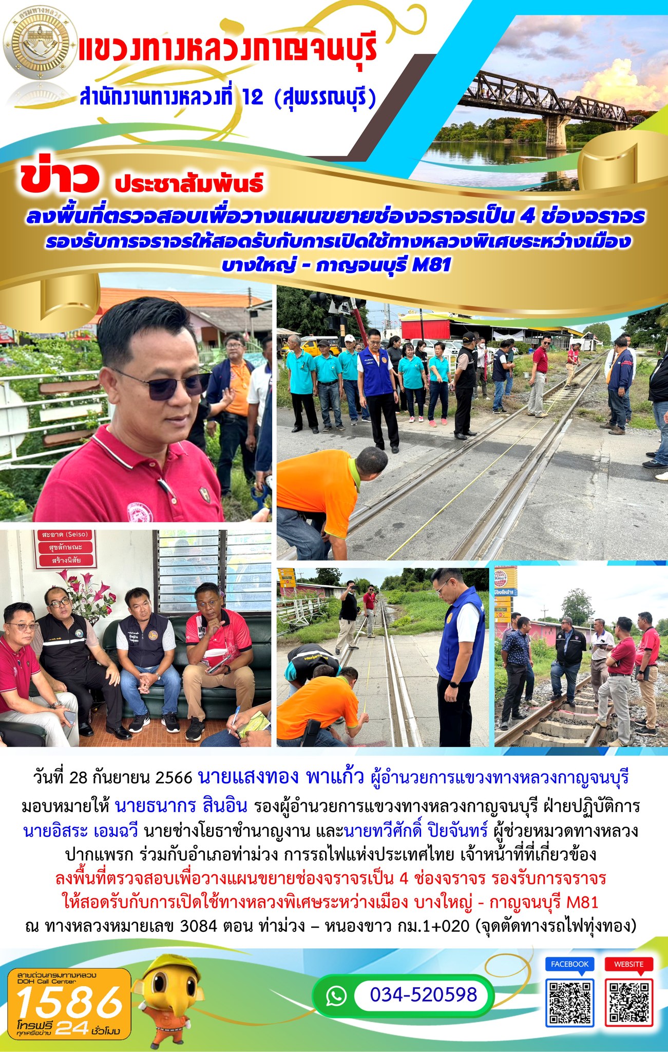 วันที่ 28 กันยายน 2566 นายแสงทอง พาแก้ว ผู้อำนวยการแขวงทางหลวงกาญจนบุรี มอบหมายให้ นายธนากร สินอิน รองผู้อำนวยการแขวงทางหลวงกาญจนบุรี ฝ่ายปฏิบัติการนายอิสระ เอมฉวี นายช่างโยธาชำนาญงาน และนายทวีศักดิ์ ปิยจันทร์ ผู้ช่วยหมวดทางหลวงปากแพรก ร่วมกับอำเภอท่าม่วง การรถไฟแห่งประเทศไทย เจ้าหน้าที่ที่เกี่ยวข้อง ลงพื้นที่ตรวจสอบเพื่อวางแผนขยายช่องจราจรเป็น 4 ช่องจราจร รองรับการจราจรให้สอดรับกับการเปิดใช้ทางหลวงพิเศษระหว่างเมือง บางใหญ่ - กาญจนบุรี M81 ณ