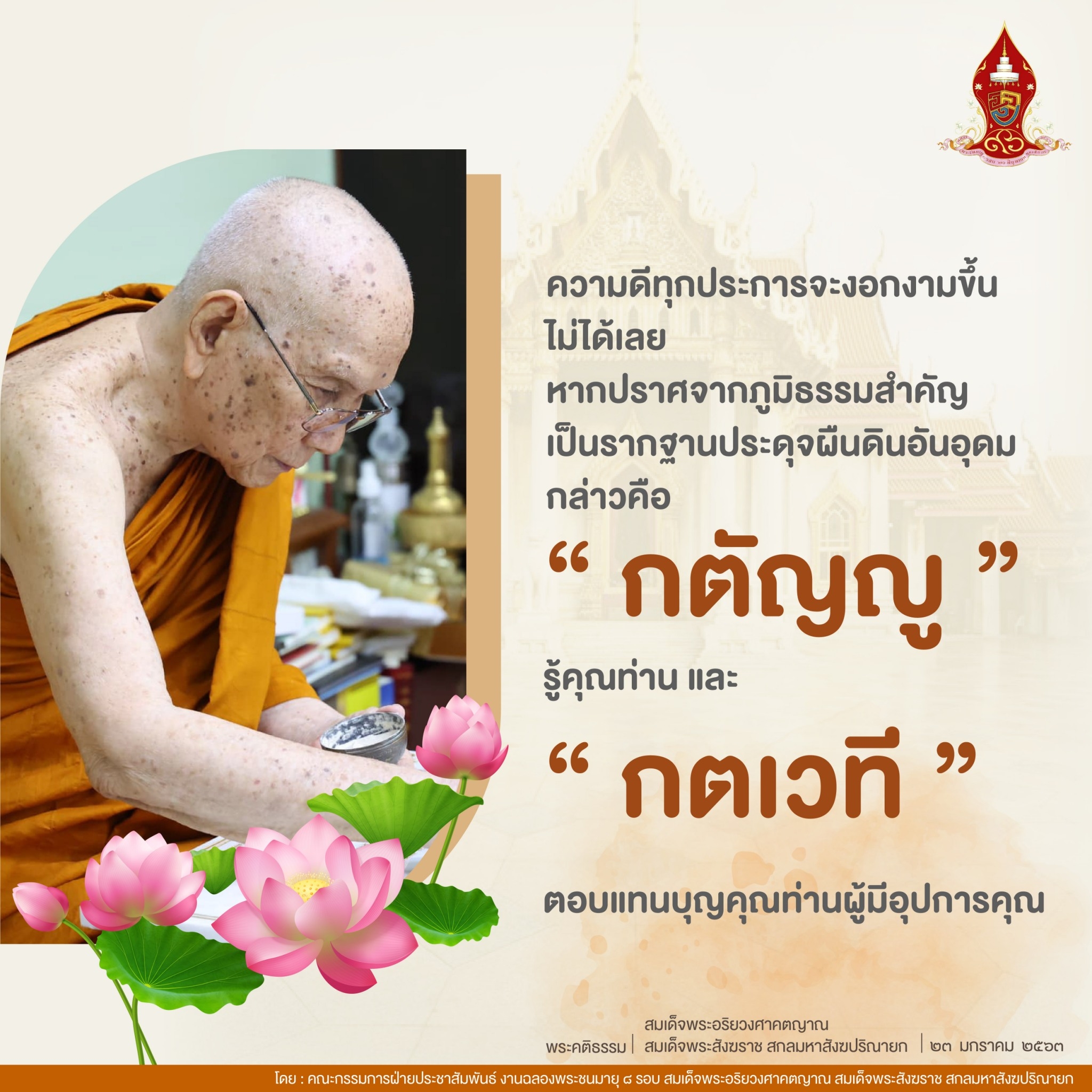 สมเด็จพระสัมมาสัมพุทธเจ้าทรงพระอนุศาสน์สั่งสอนไว้ว่า "ความกตัญญูกตเวที เป็นพื้นฐานของการเป็นคนดี" ดังนี้ บุคคลใดที่ประสงค์จะประสบความสุขความเจริญในชีวิต บุคคลนั้นต้องอบรมสั่งสมความดีให้เพิ่มพูนขึ้นในการกระทำทางกาย วาจา และใจของตนอยู่เสมอ