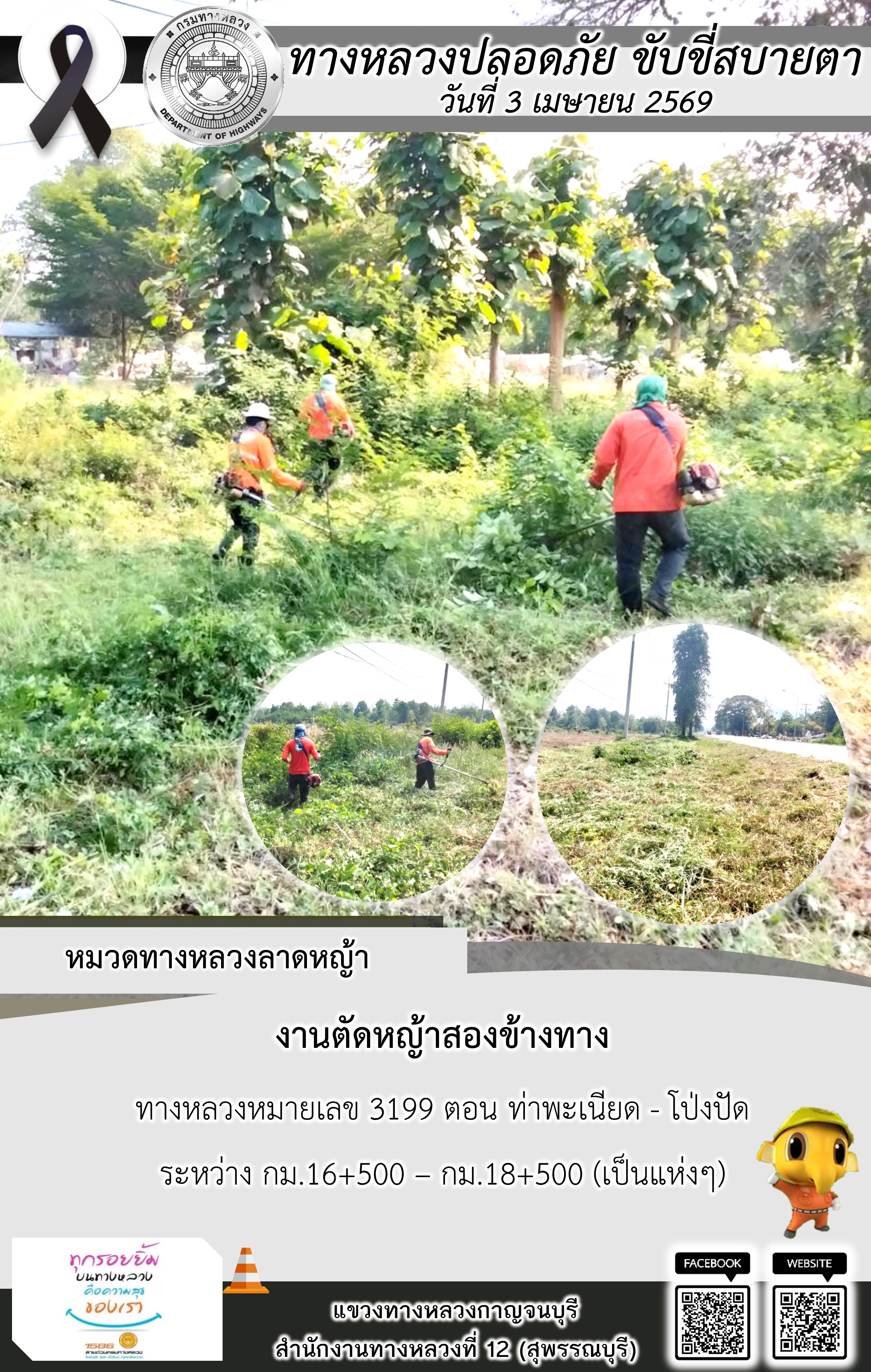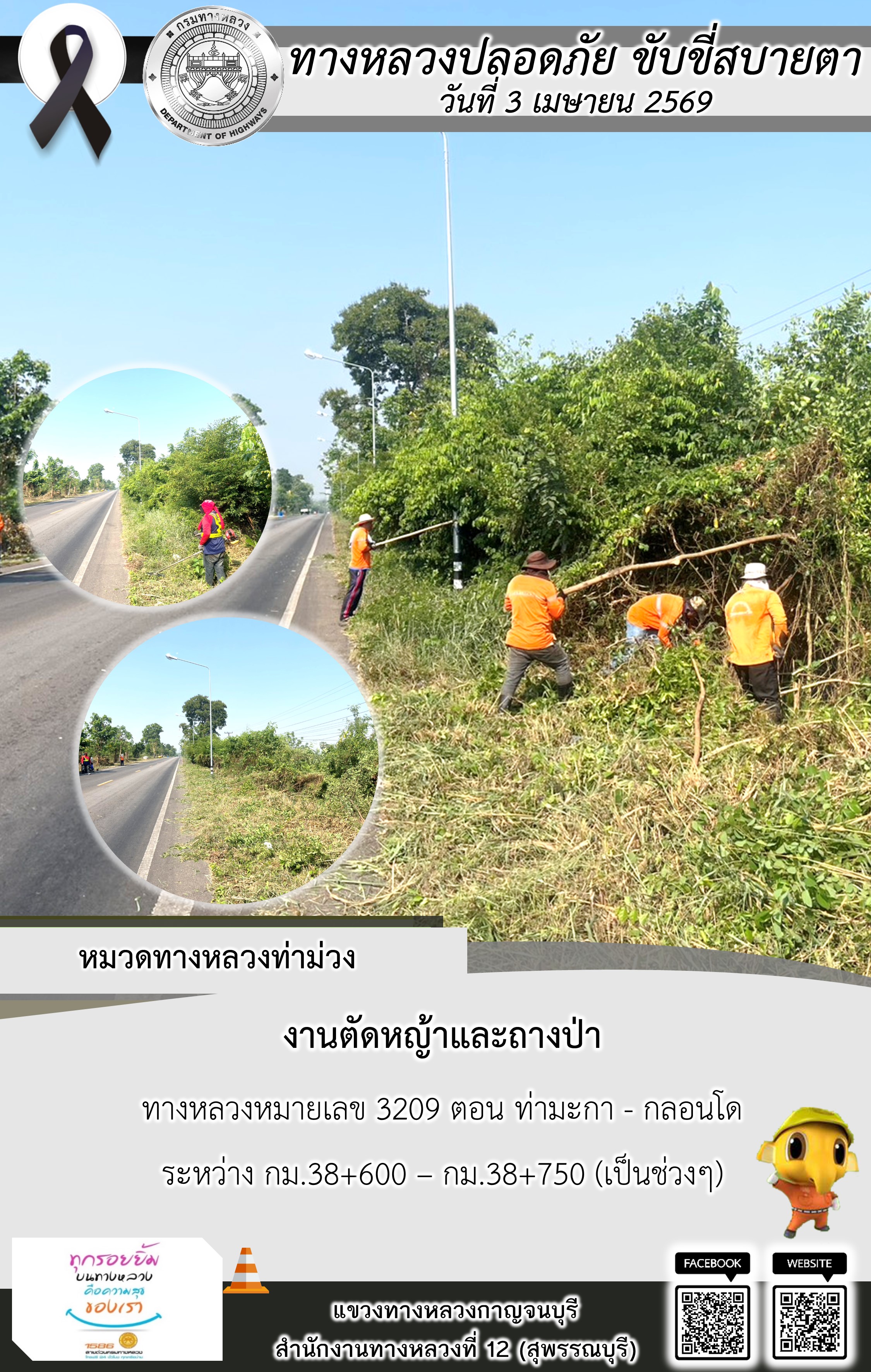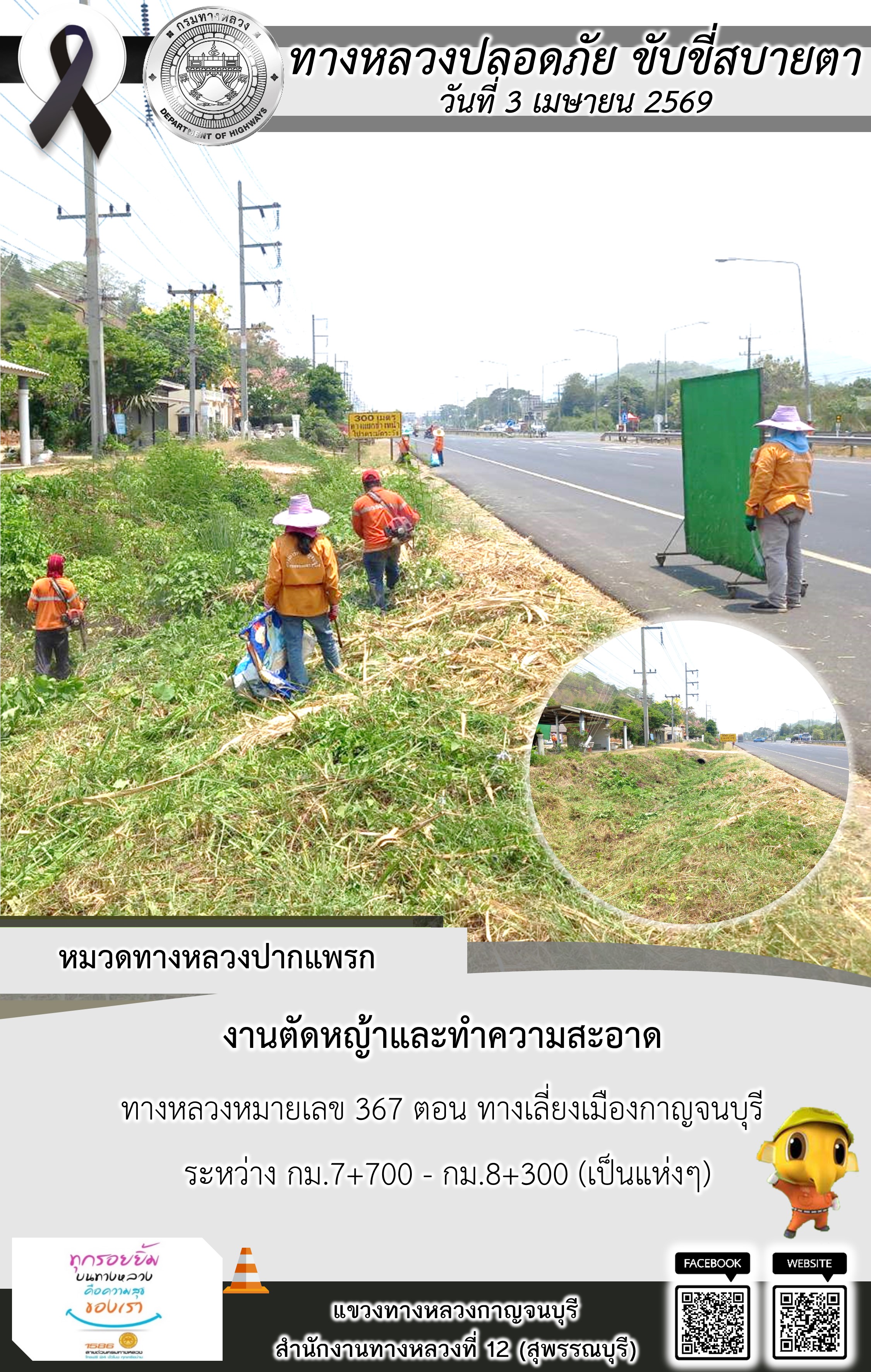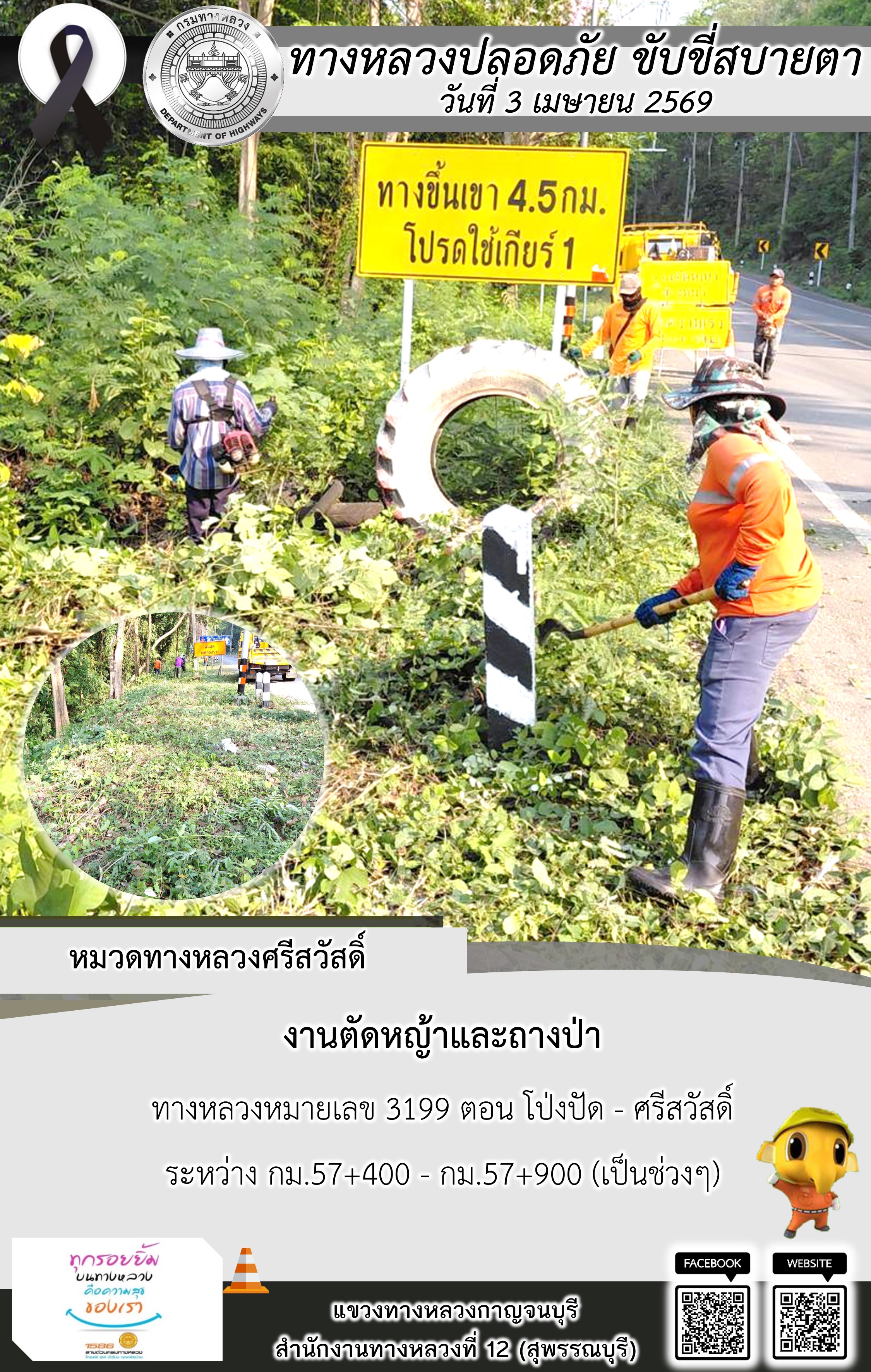 แขวงทางหลวงกาญจนบุรี โดยหมวดทางหลวงในสังกัด และงานอำนวยความปลอดภัยปฏิบัติงาน ประจำวันที่ 3 เม.ย. 69