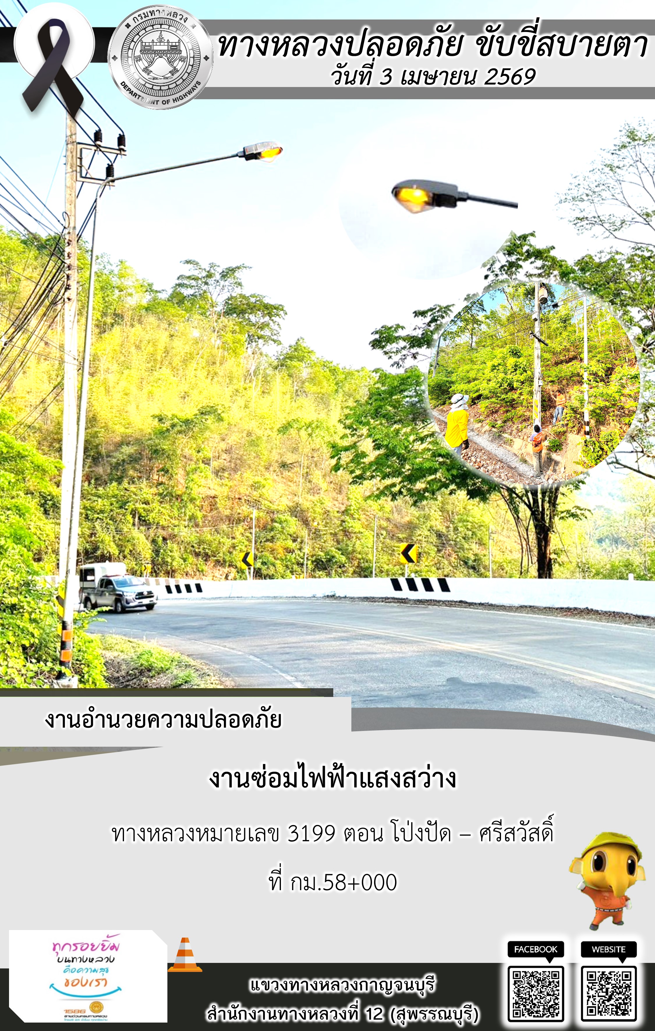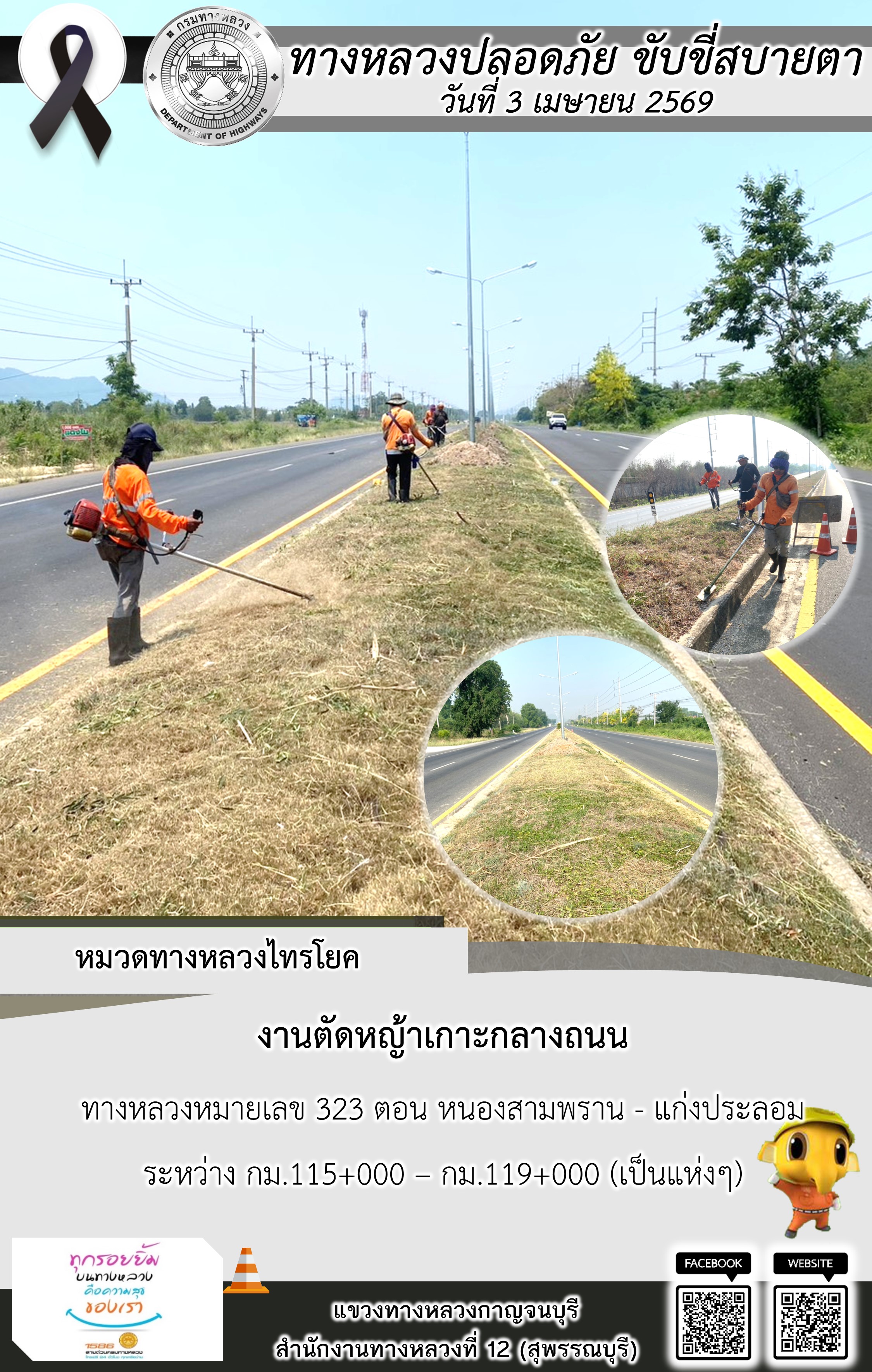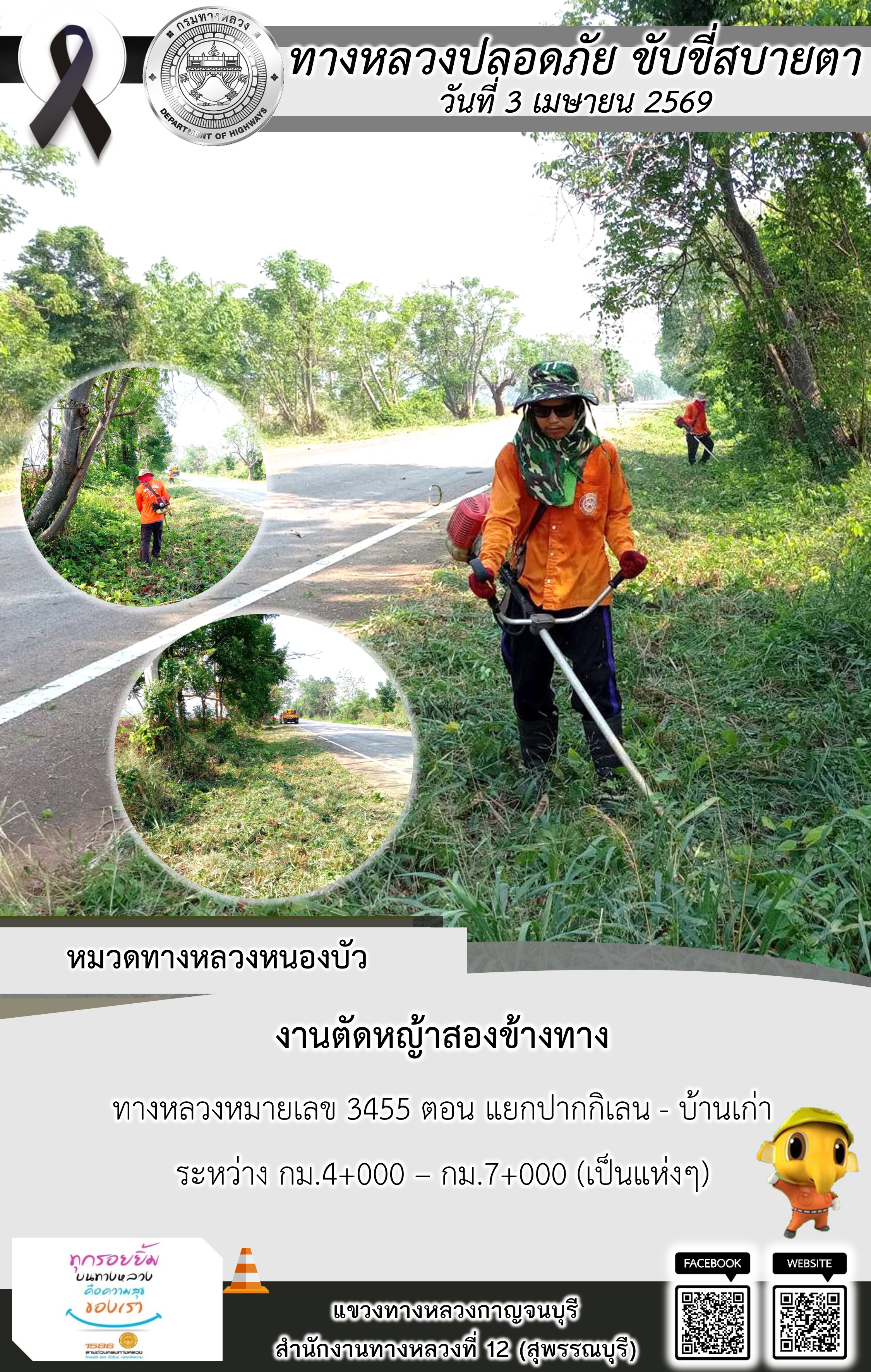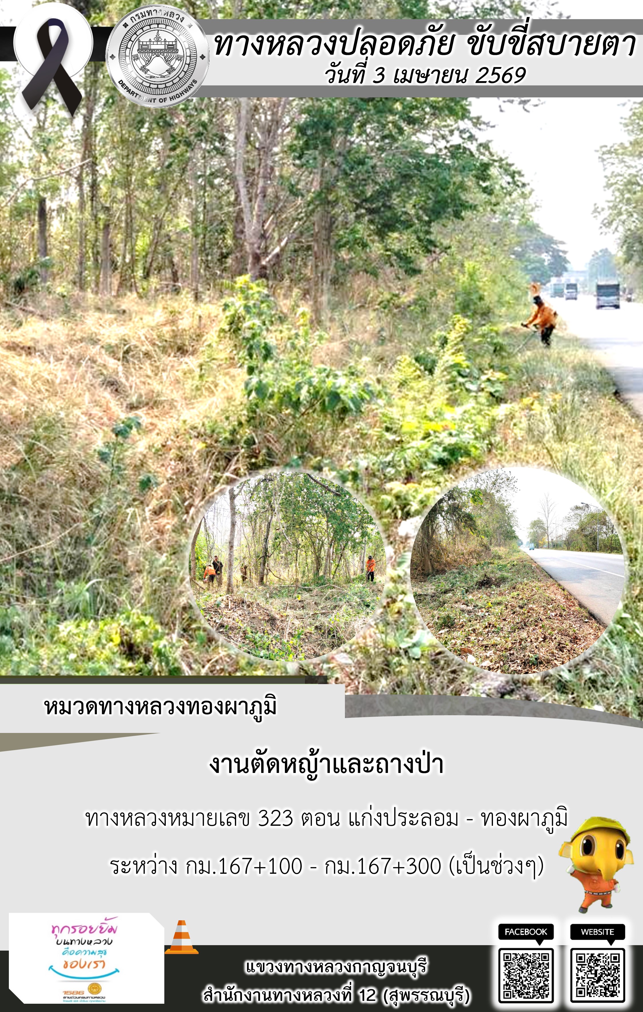 แขวงทางหลวงกาญจนบุรี โดยหมวดทางหลวงในสังกัด และงานอำนวยความปลอดภัยปฏิบัติงาน ประจำวันที่ 3 เม.ย. 69