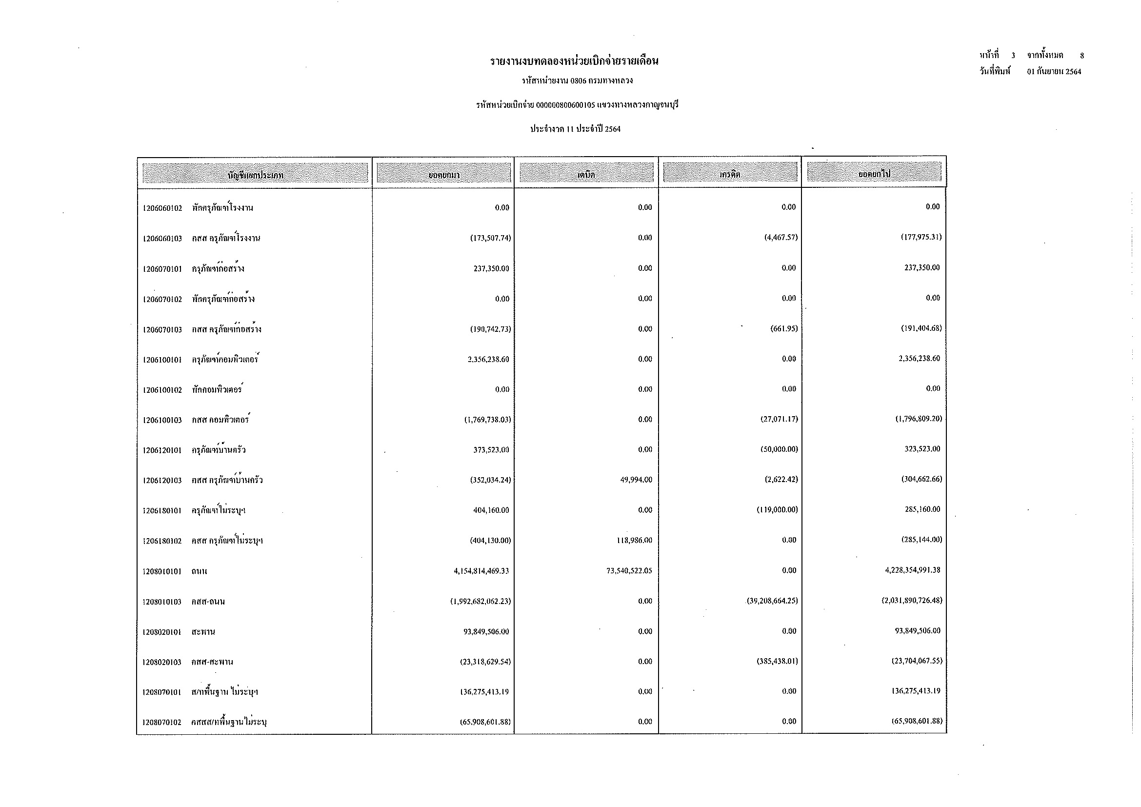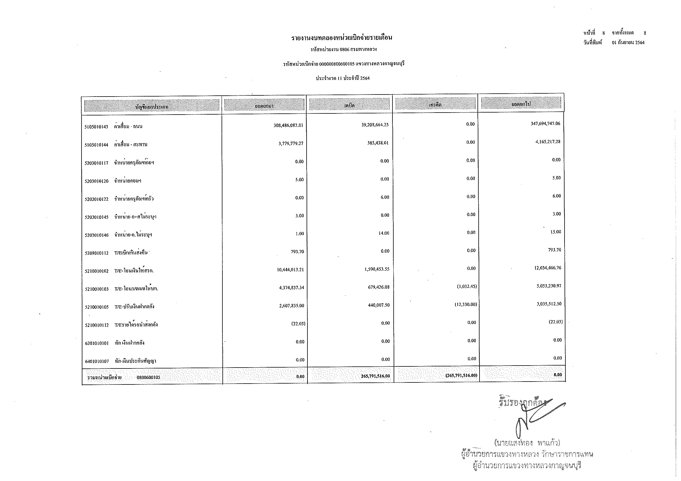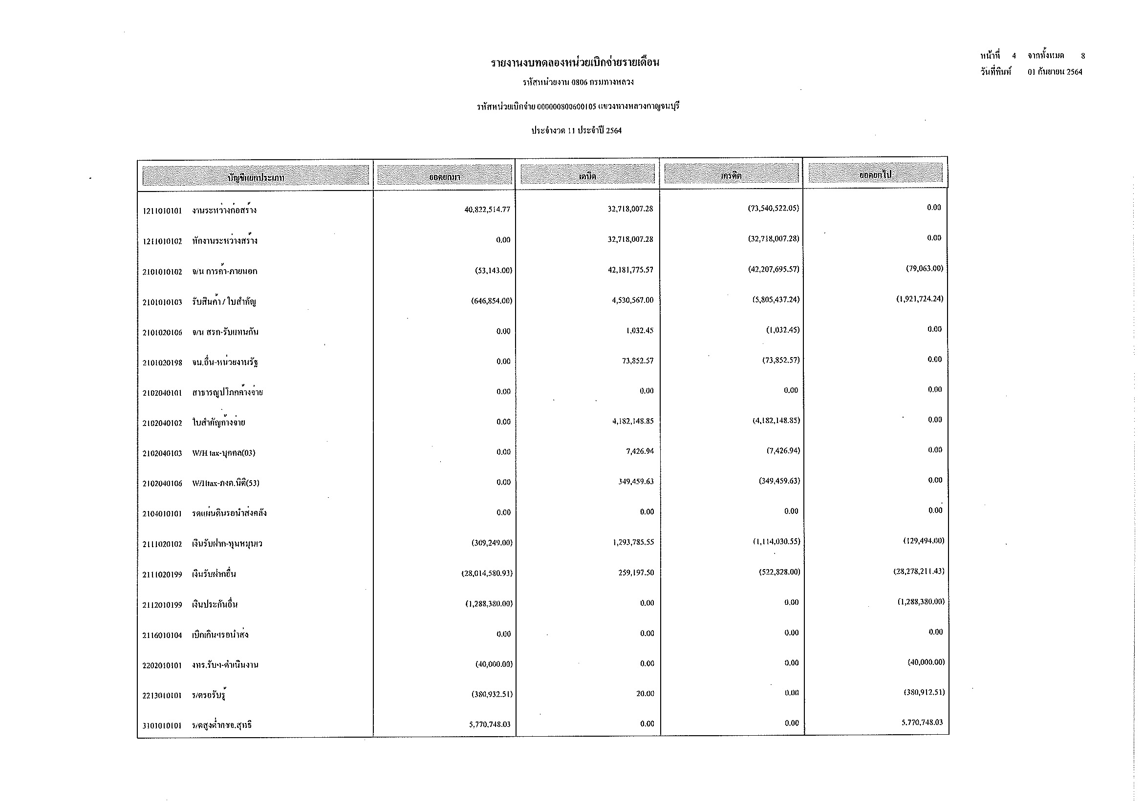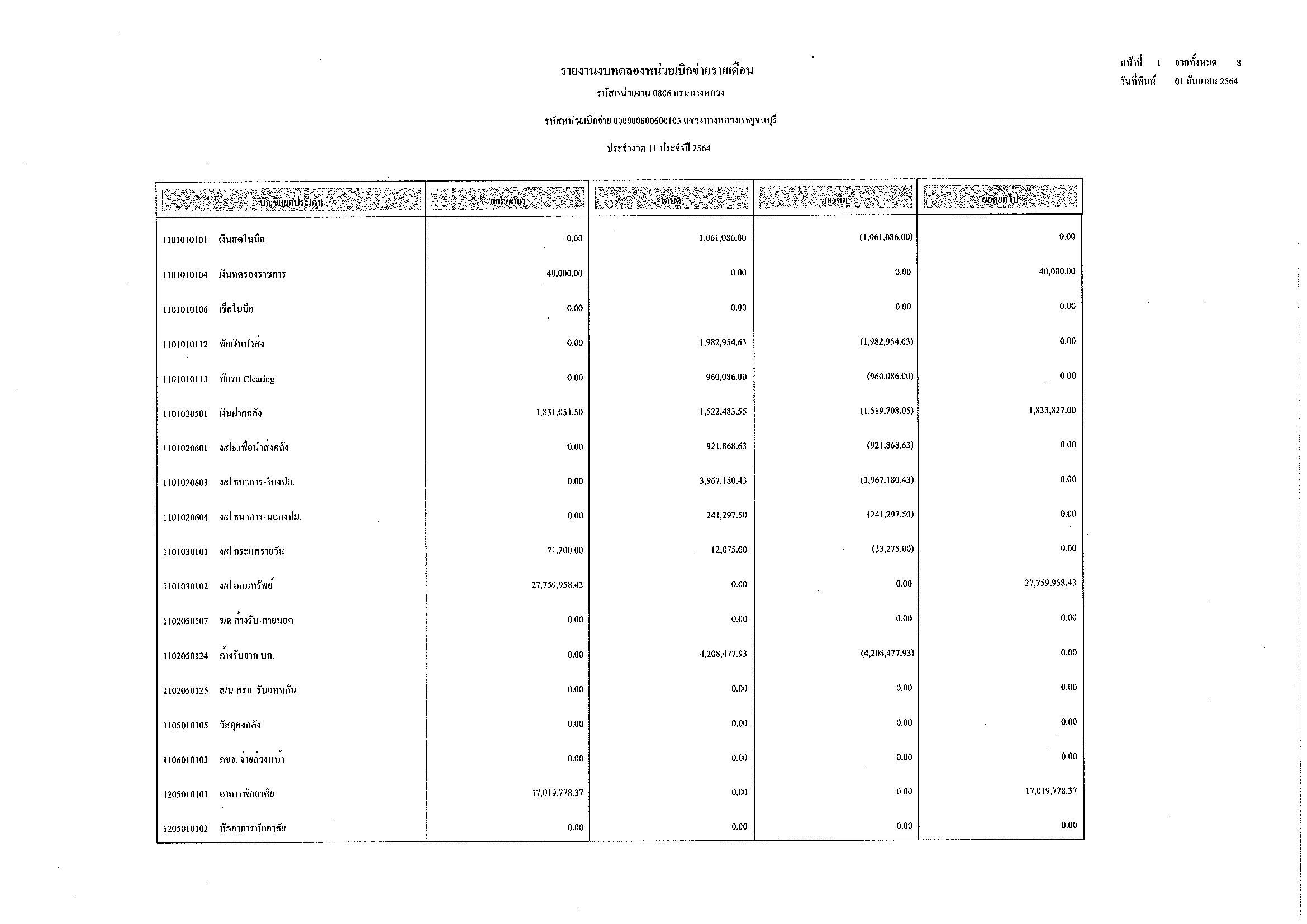 รายงานงบทดลองหน่วยเบิกจ่ายรายเดือน ประจำงวด 11 ประจำปีที่ 2564