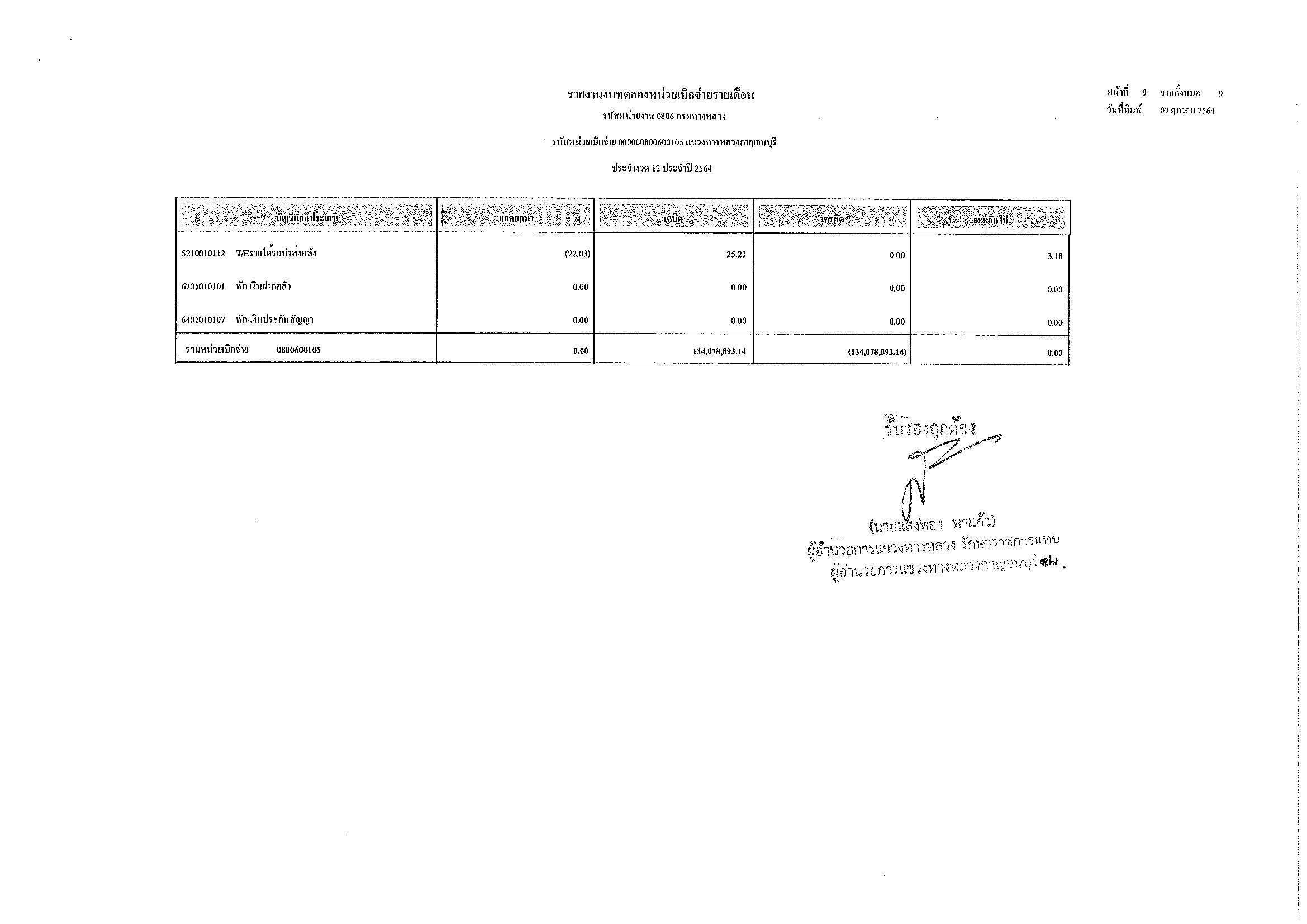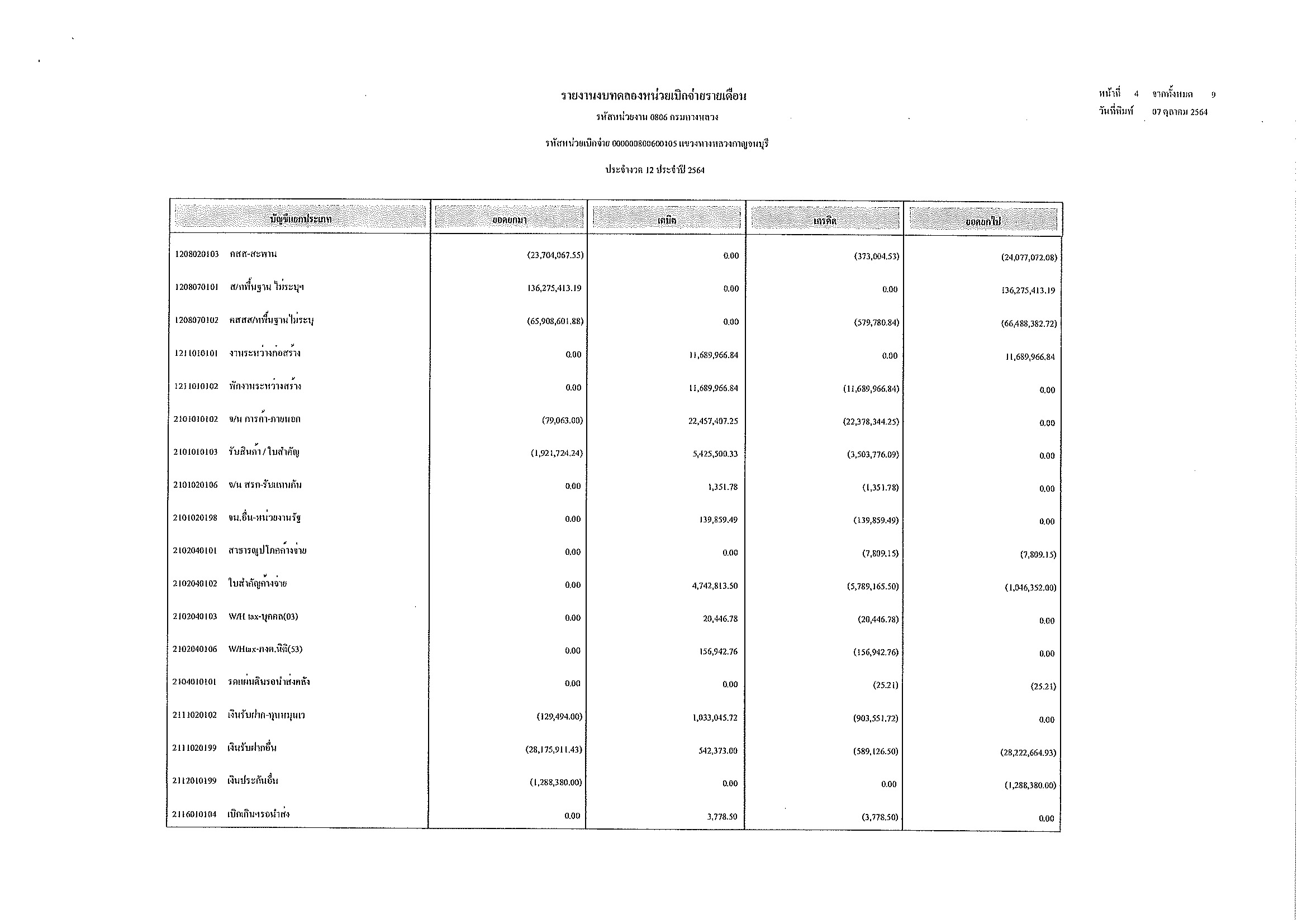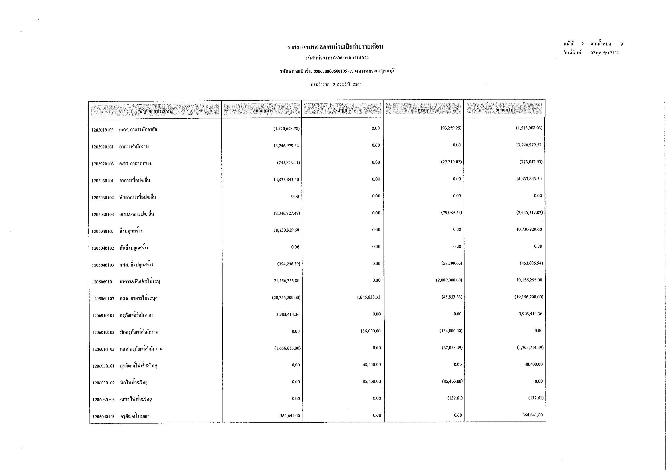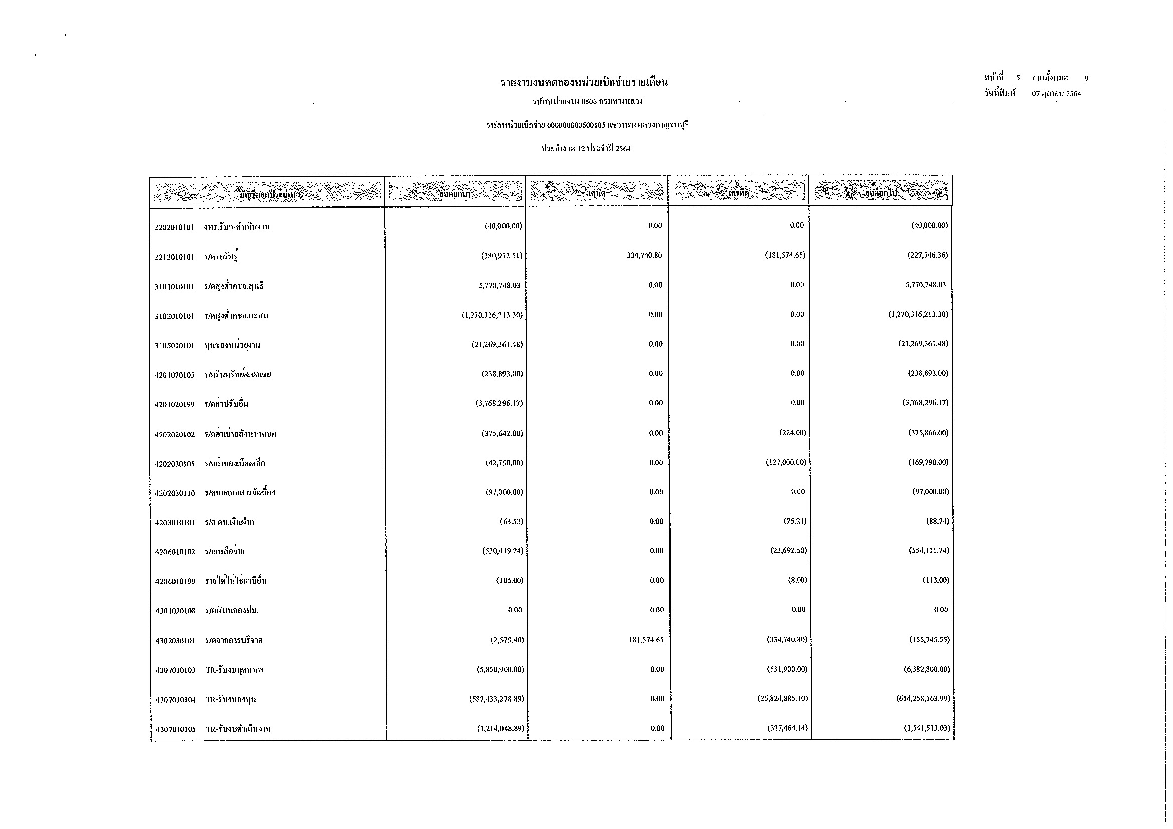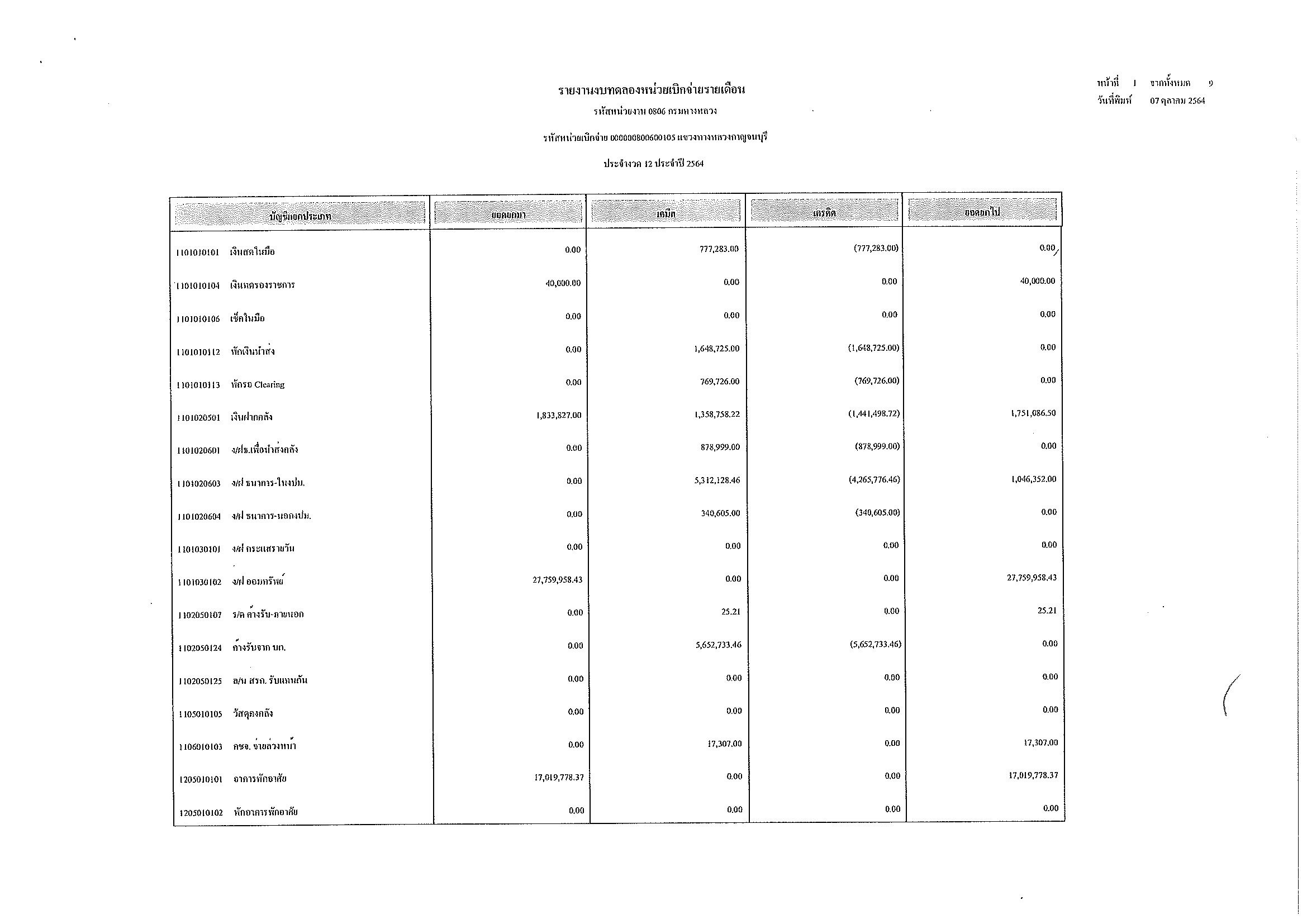 รายงานงบทดลองหน่วยเบิกจ่ายรายเดือน ประจำงวด 12 ประจำปีที่ 2564