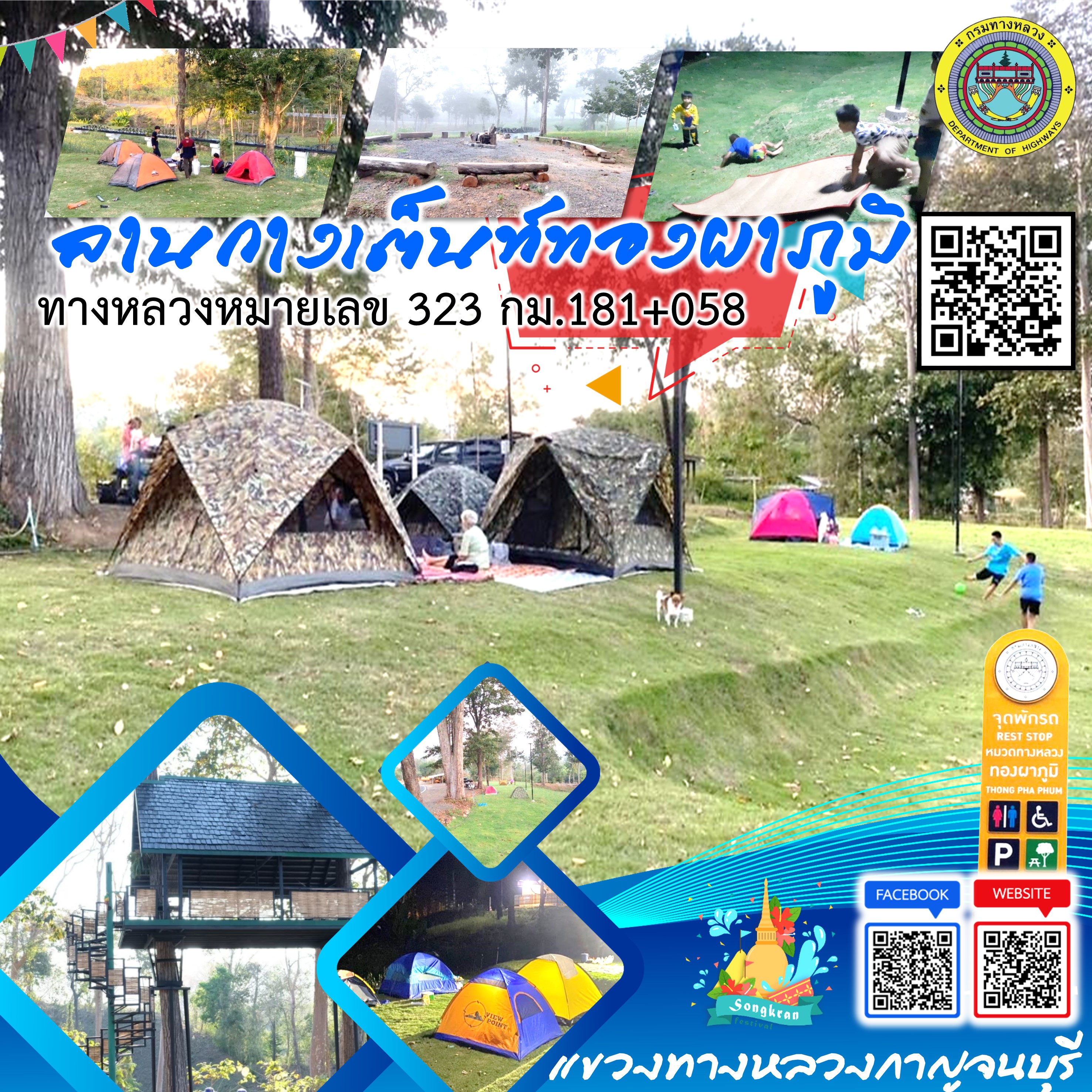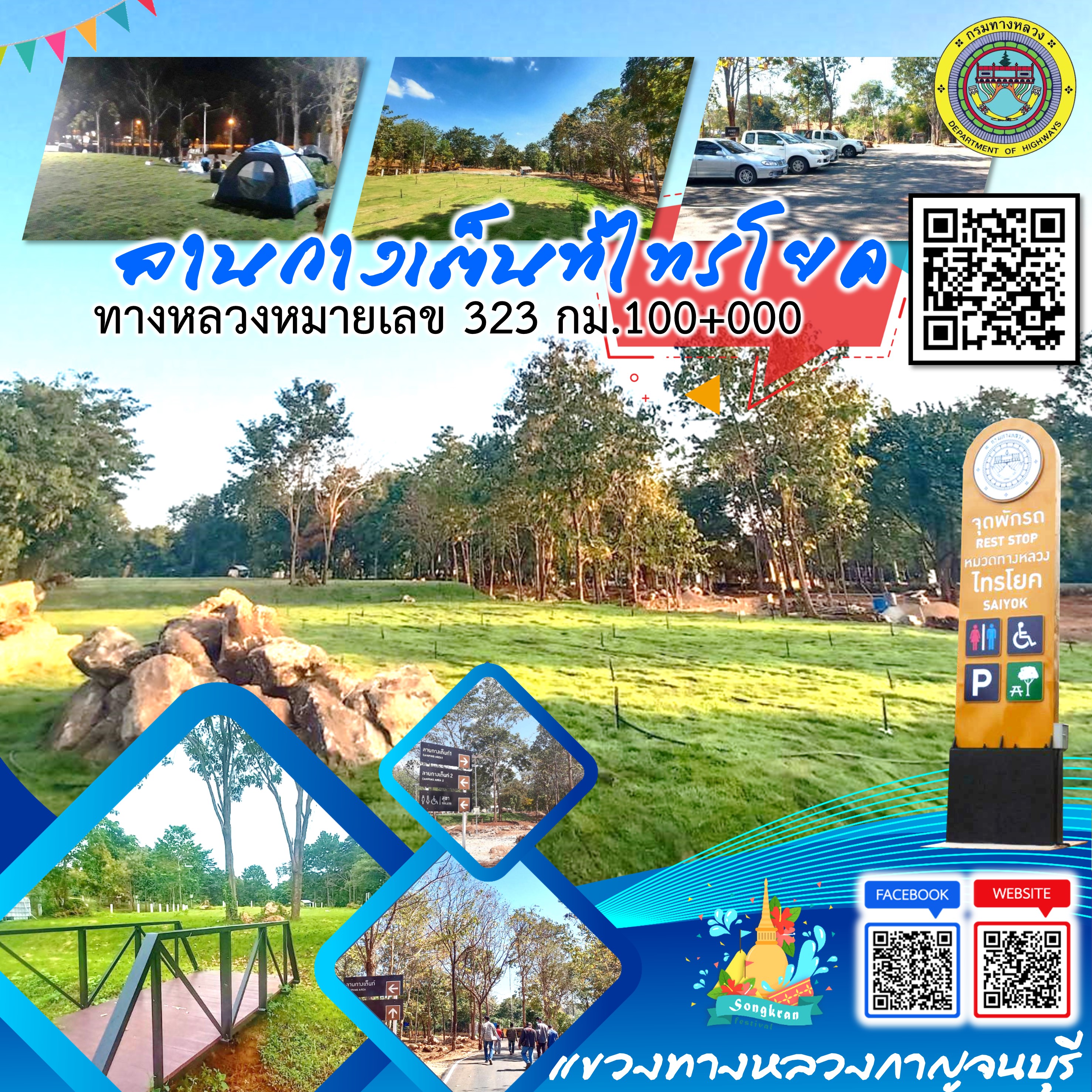 ข้อมูลข่าว : แขวงทางหลวงกาญจนบุรี สำนักงานทางหลวงที่ 12 (สุพรรณบุรี) กรมทางหลวง ให้บริการลานกางเต็นท์ จุดพักรถ ห้องน้ำ และสอบถามข้อมูลต่างๆ สำหรับนักท่องเที่ยวแวะพักใช้บริการ โดยมีเจ้าหน้าที่พร้อมบริการตลอด 24 ชั่วโมง ในช่วงเทศกาลสงกรานต์ 2565