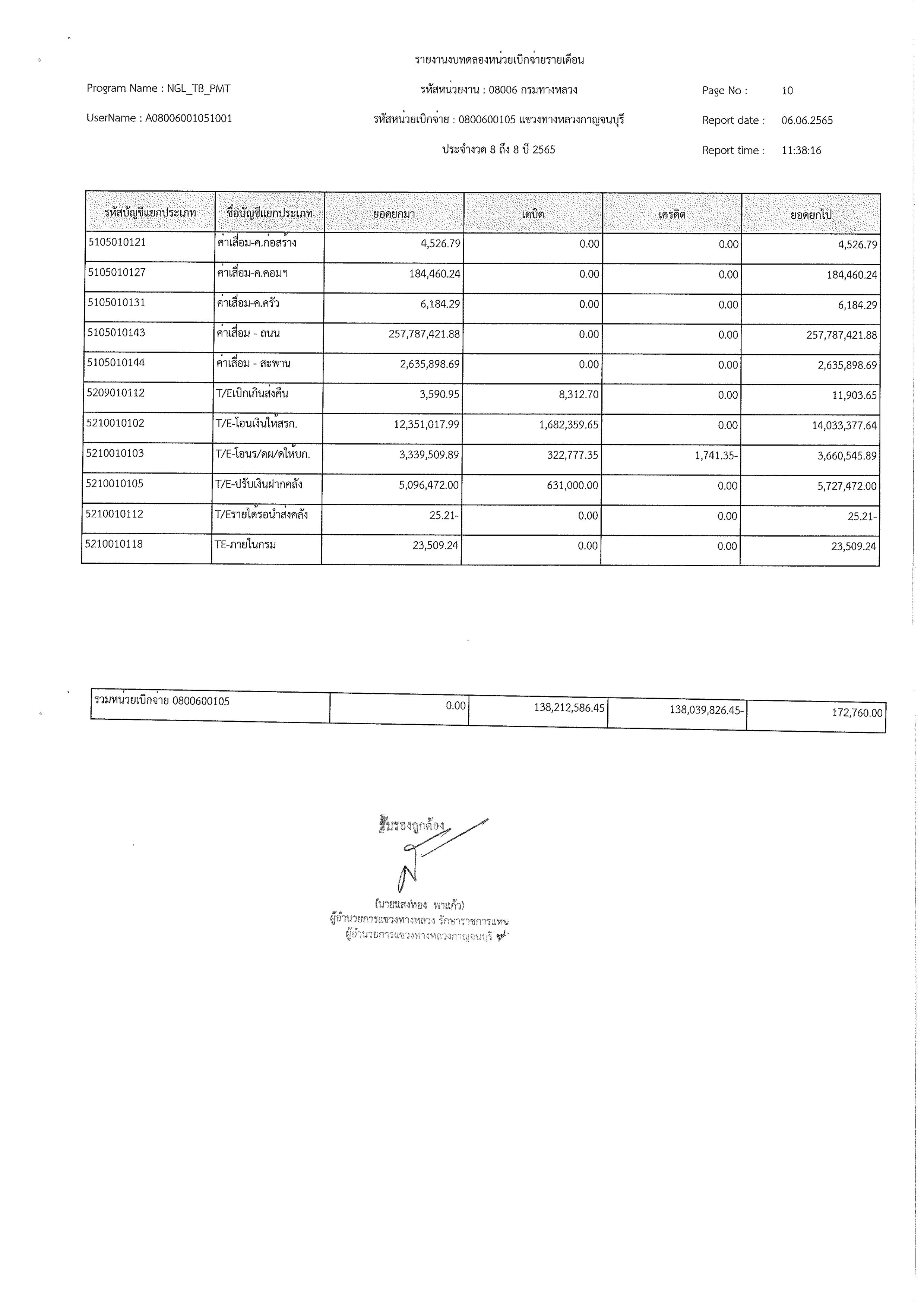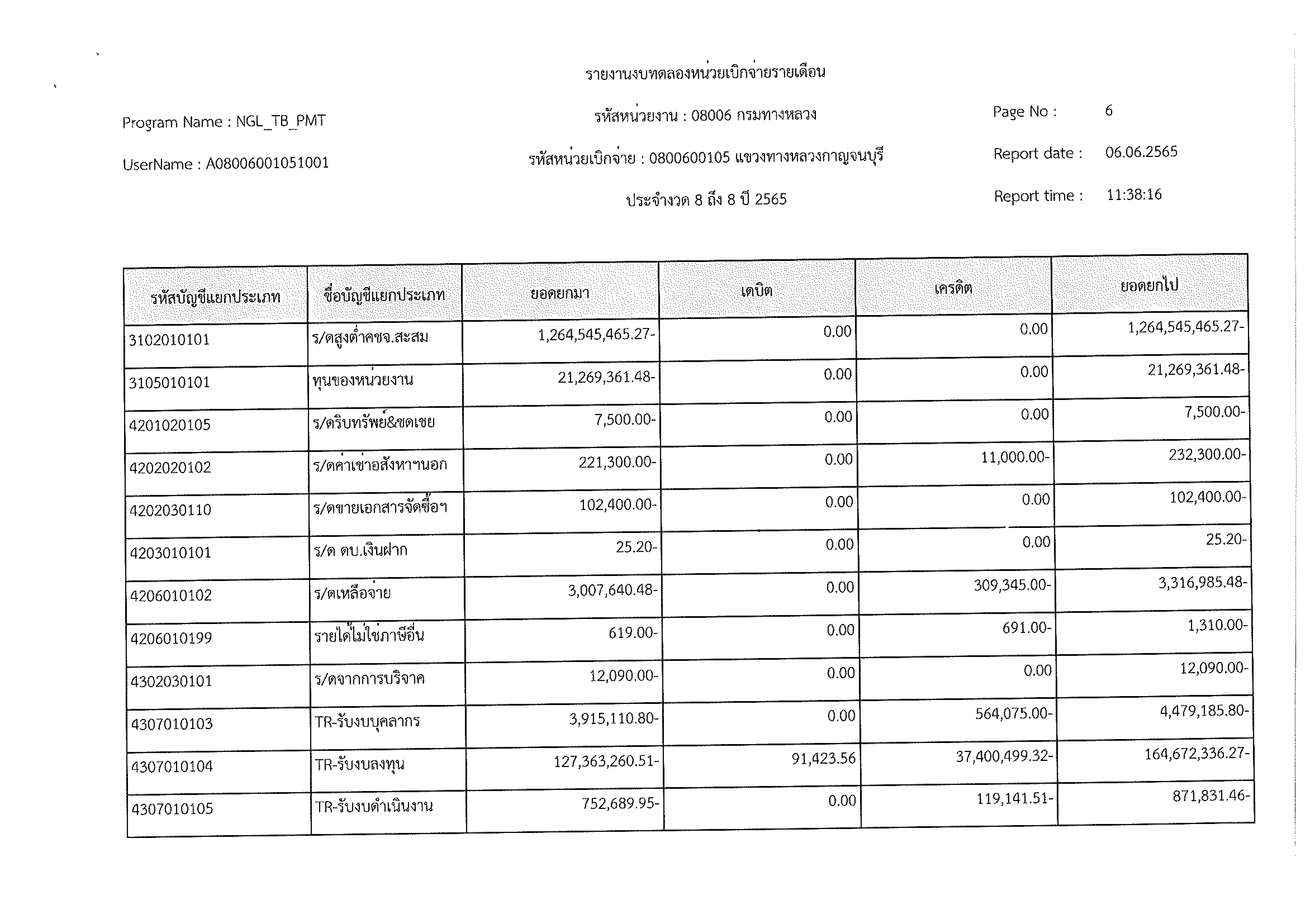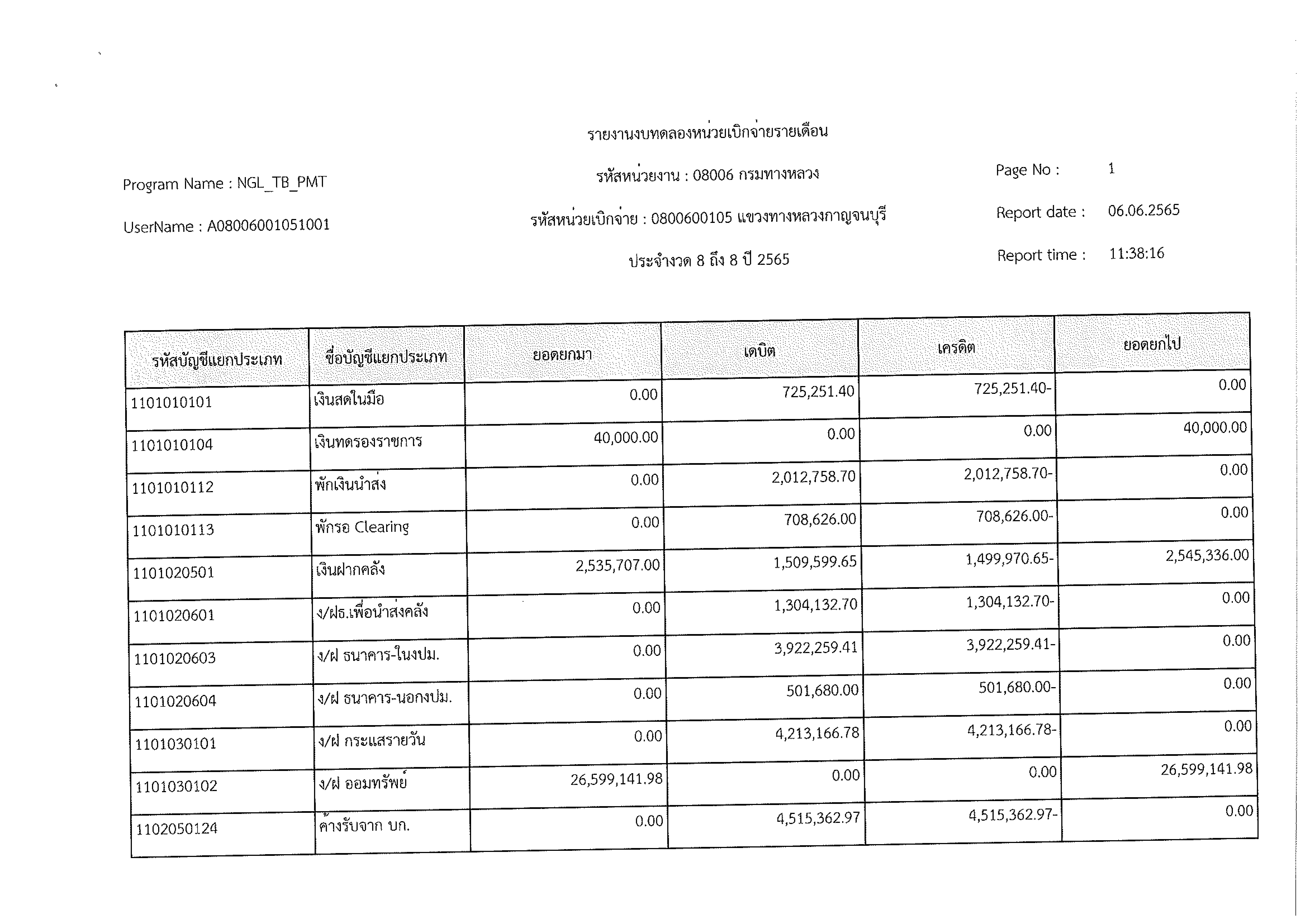 รายงานงบทดลองหน่วยเบิกจ่ายรายเดือน ประจำงวด 8 ประจำปีที่ 2565