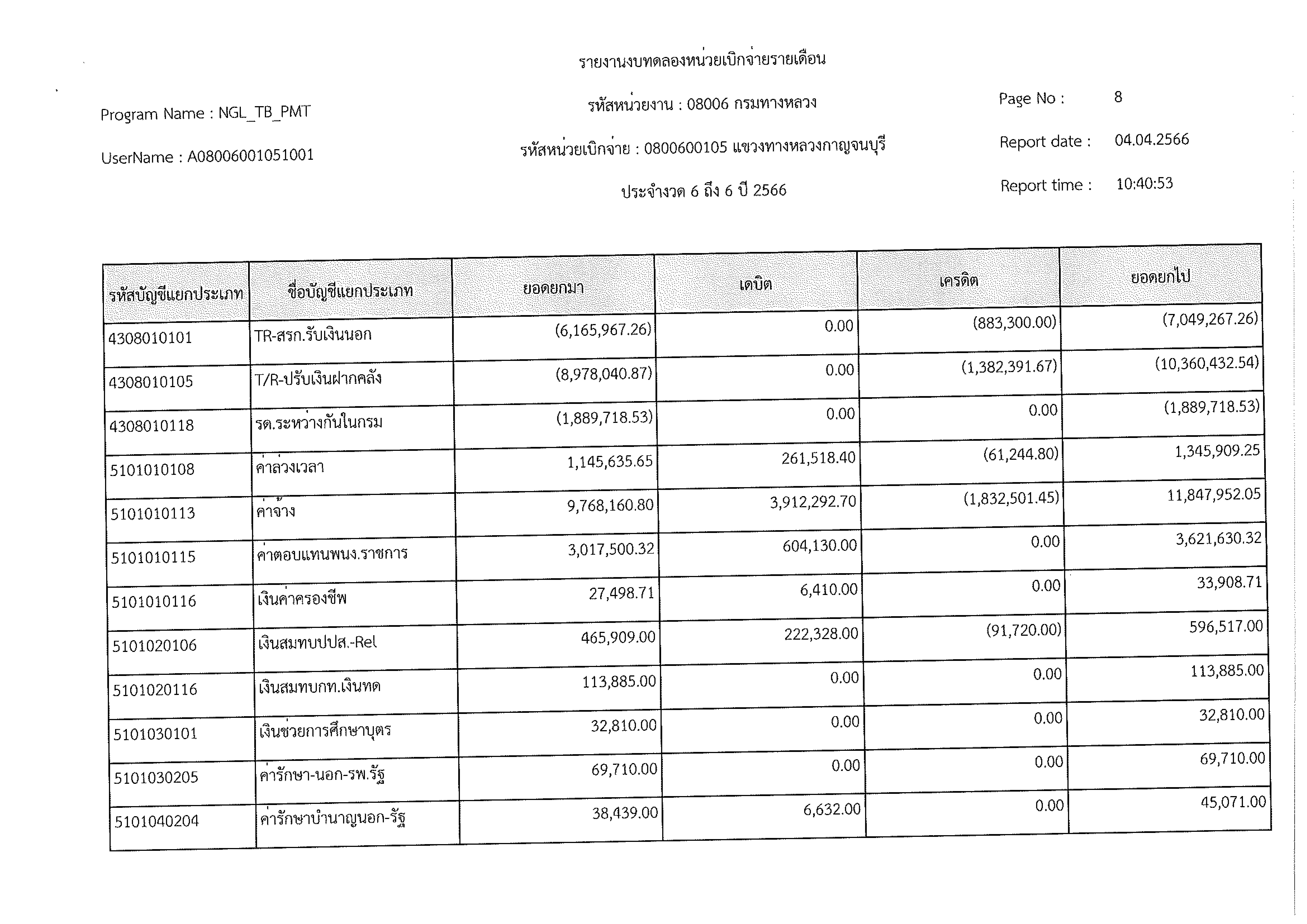 รายงานงบทดลองหน่วยเบิกจ่ายรายเดือน ประจำงวด 6 ประจำปีที่ 2566