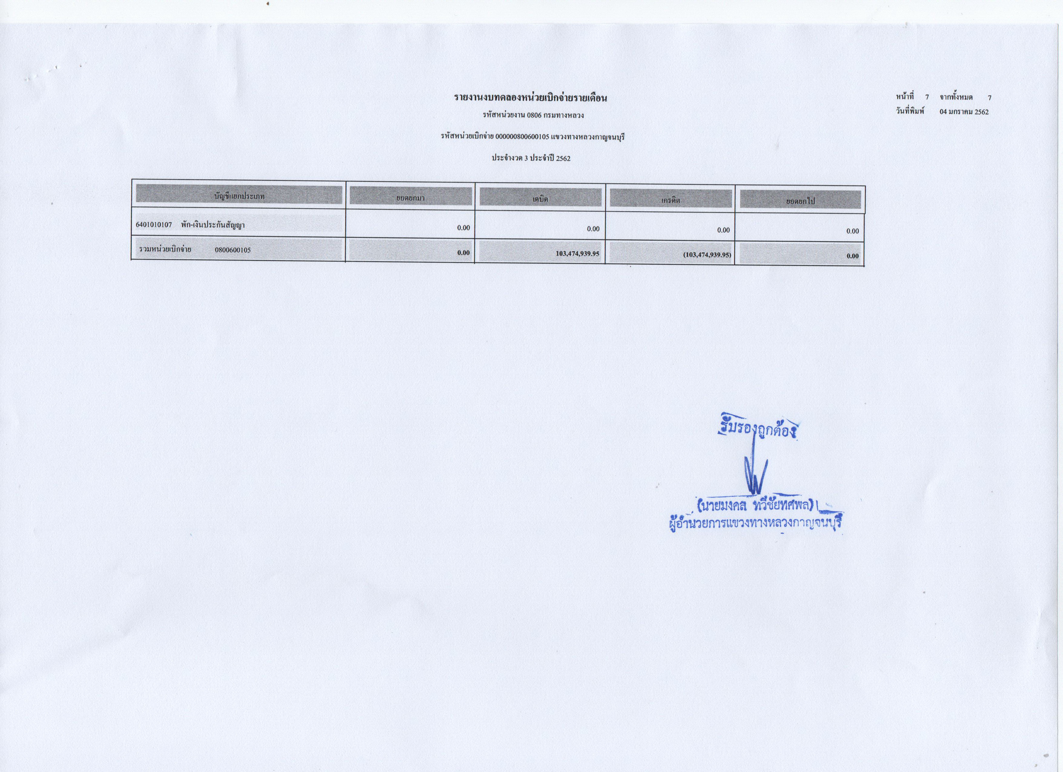 รายงานงบทดลองหน่วยเบิกจ่ายรายเดือน ประจำงวดที่ 3 ประจำปี 2562