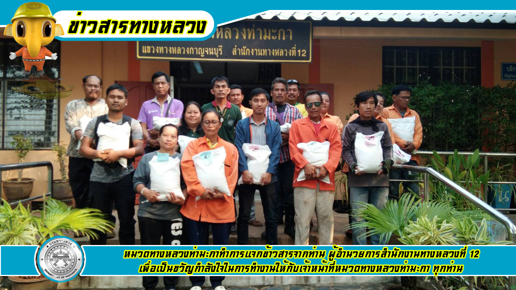 หมวดทางหลวงท่ามะกาทำการแจกข้าวสารจากท่าน ผู้อำนวยการสำนักงานทางหลวงที่ 12 เพื่อเป็นขวัญกำลังใจในการทำงานให้กับเจ้าหน้าที่หมวดทางหลวงท่ามะกา ทุกท่าน