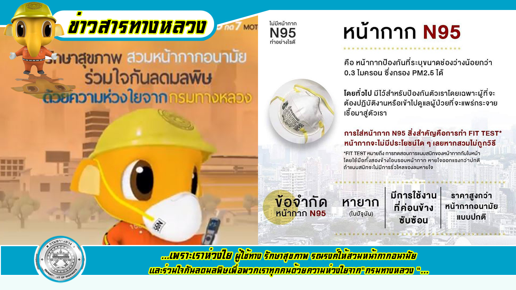 ข้อมูลข่าว : ...เพราะเราห่วงใย ผู้ใช้ทาง รักษาสุขภาพ รณรงค์ให้สวมหน้ากากอนามัย และร่วมใจกันลดมลพิษ เพื่อพวกเราทุกคน ด้วยความห่วงใย จาก"กรมทางหลวง "