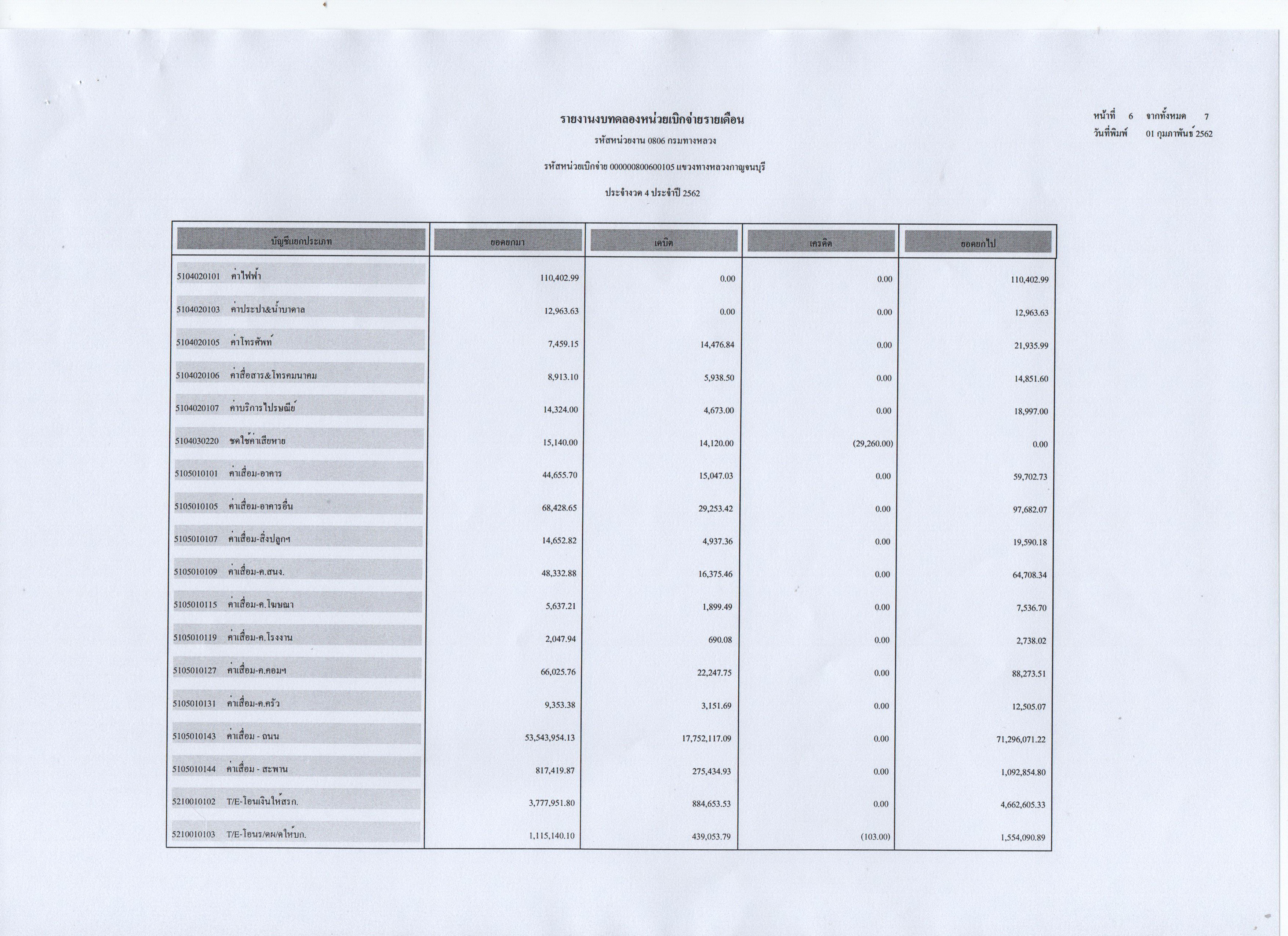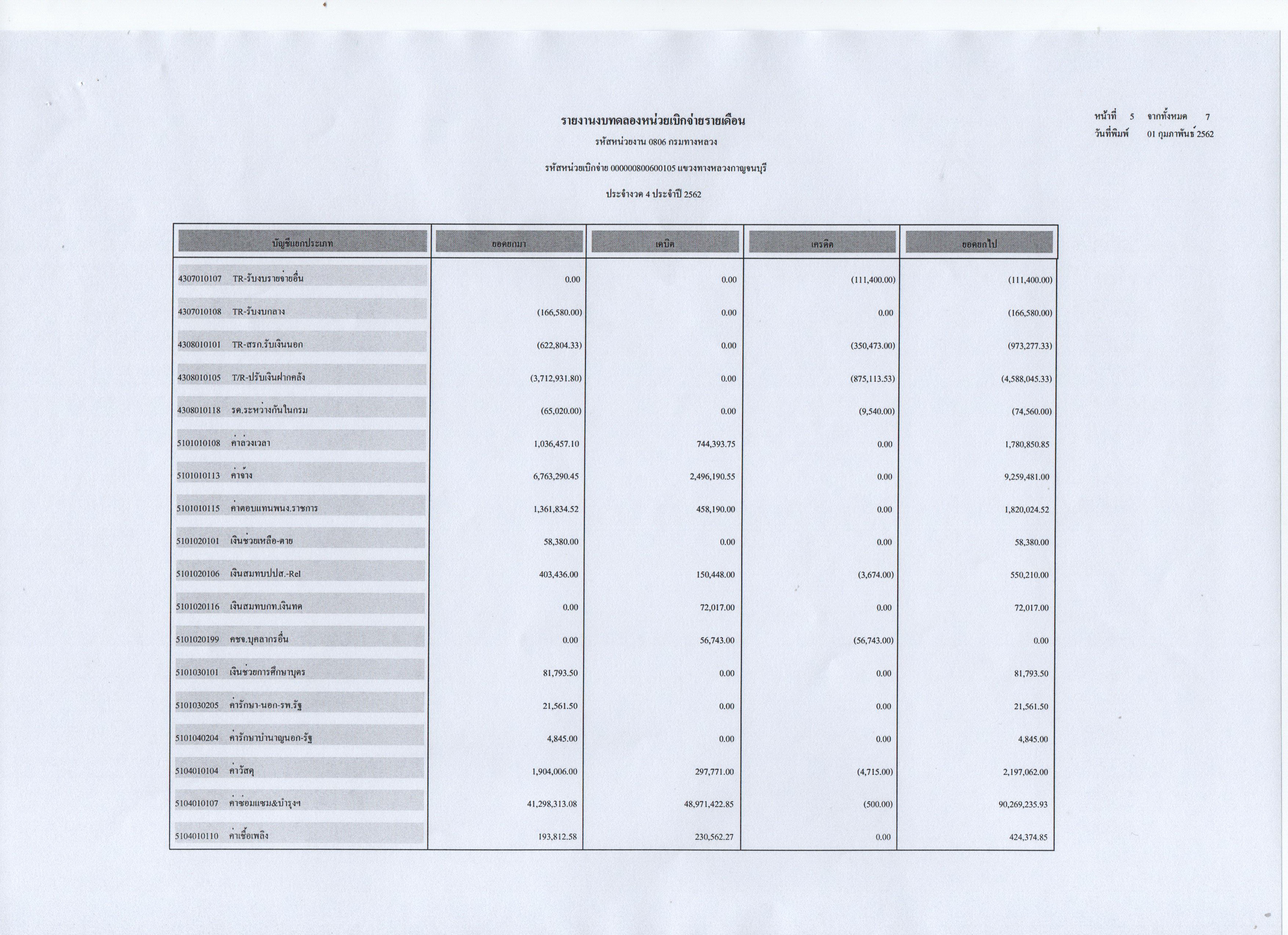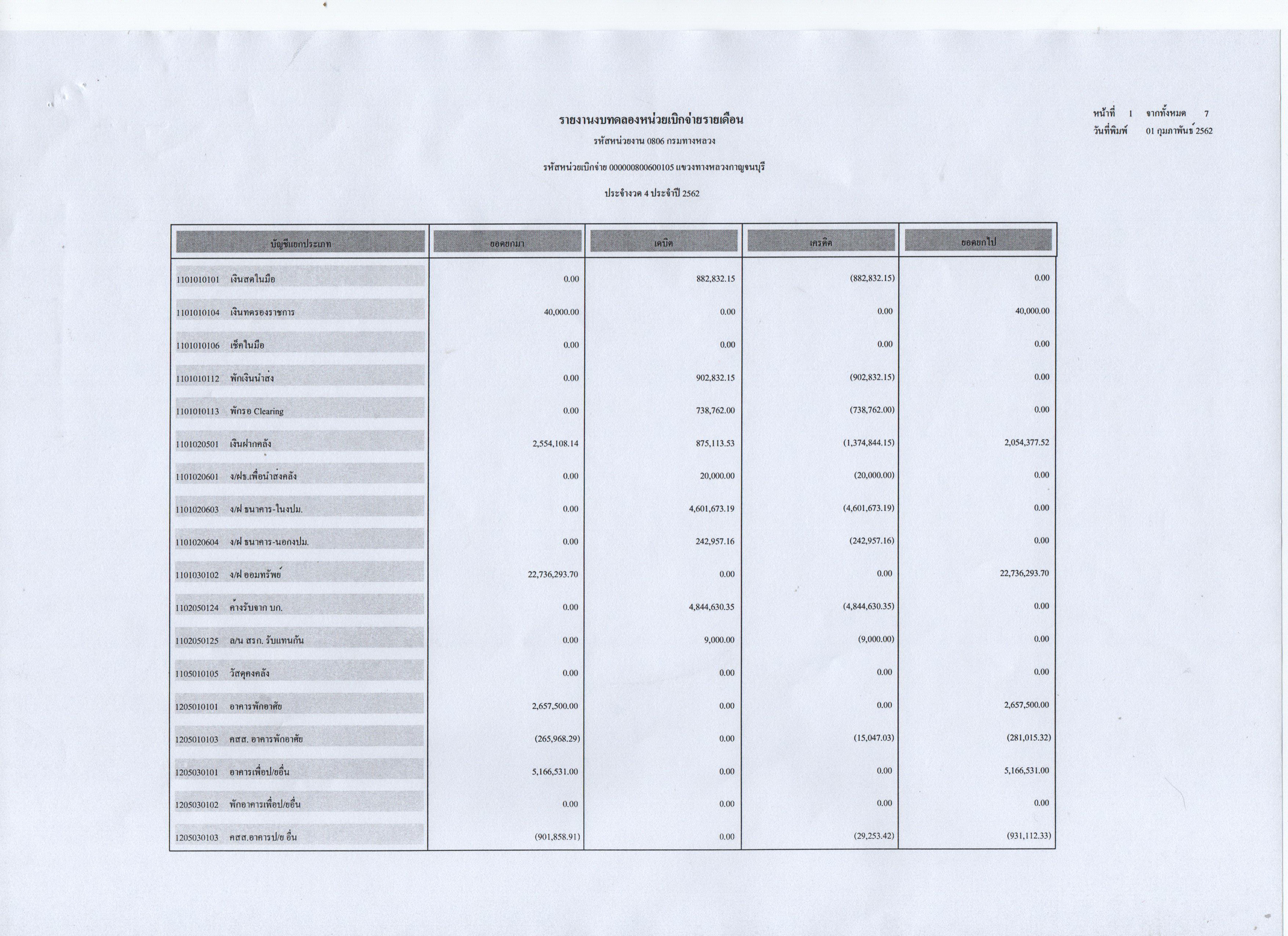 ข้อมูลข่าว : รายงานงบทดลองหน่วยเบิกจ่ายรายเดือน ประจำงวดที่ 4 ประจำปี 2562