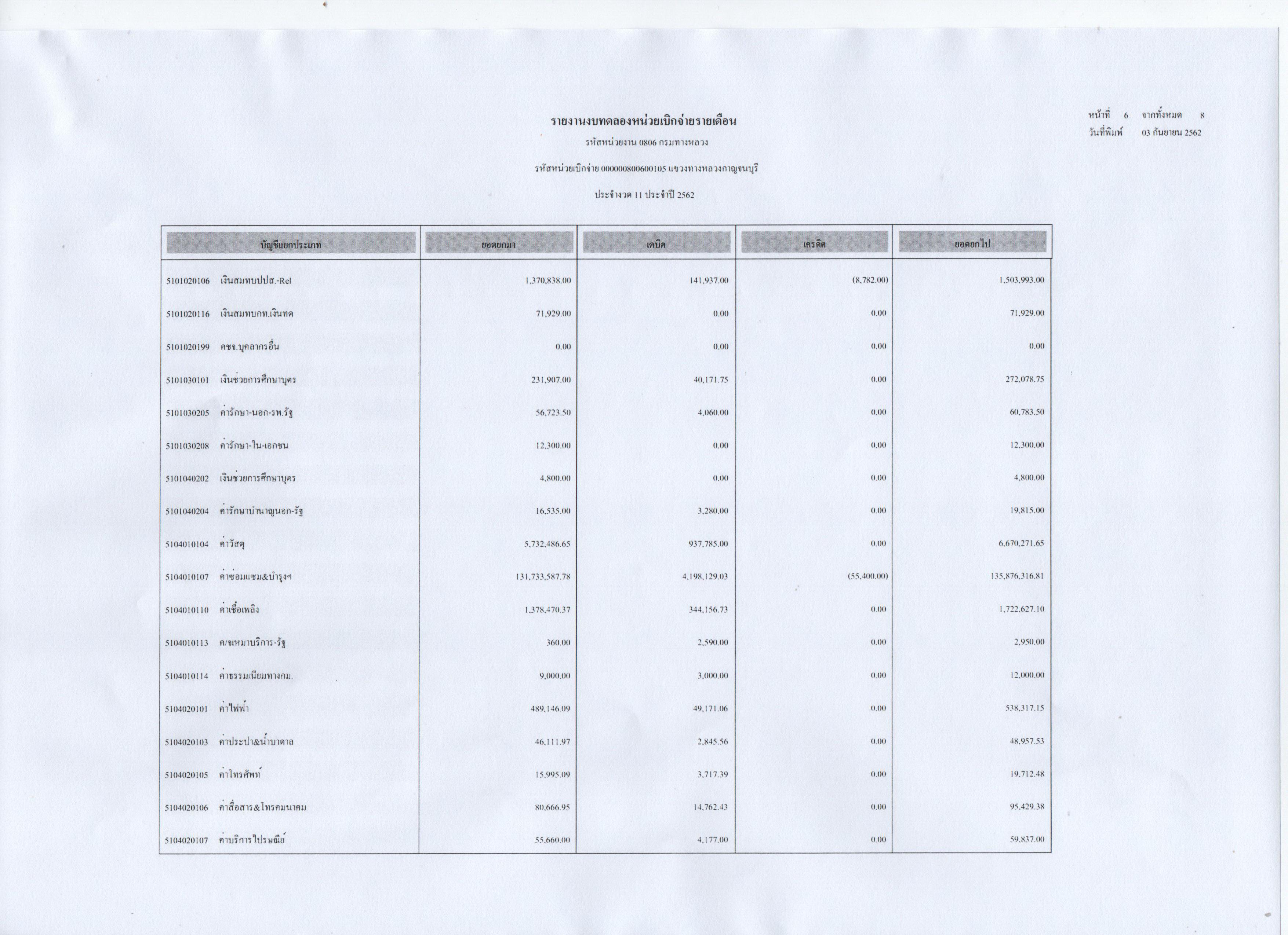ข้อมูลข่าว : รายงานงบทดลองหน่วยเบิกจ่ายรายเดือน ประจำงวดที่ 11 ประจำปี 2562