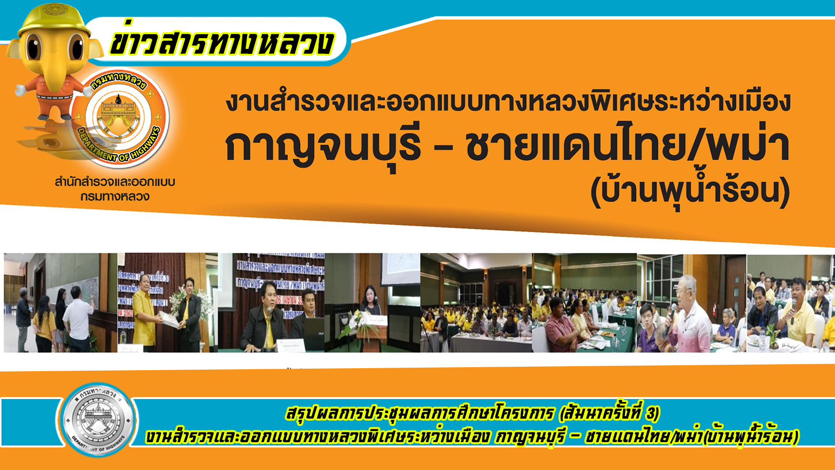 ประชาสัมพันธ์ สรุปผลการประชุมผลการศึกษาโครงการ (สัมนาครั้งที่ 3) งานสำรวจและออกแบบทางหลวงพิเศษระหว่างเมือง กาญจนบุรี - ชายแดนไทย/พม่า(บ้านพุน้ำร้อน)