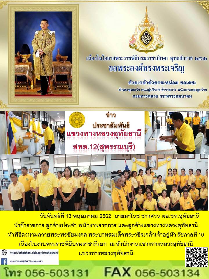กิจกรรมเฉลิมพระเกียรติพระบาทสมเด็จพระเจ้าอยู่หัว เนื่องในโอกาสวันฉัตรมงคล ๔ พฤษภาคม ๒๕๖๔ โดยดำเนินการจัดตั้งโต๊ะหมู่ประดิษฐานพระบรมฉายาลักษณ์พระบาทสมเด็จพระเจ้าอยู่หัวพร้อมเครื่องราชสักการะและพานพุ่ม ที่บริเวณห้องโถงสำนักงานแขวงทางหลวงอุทัยธานี และประดับธงชาติไทยคู่กับธงอักษรพระปรมาภิไธย ว.ป.ร. และประดับผ้าระบายสีเหลืองร่วมกับผ้าระบายสีขาว ที่บริเวณหน้าสำนักงานแขวงทางหลวงอุทัยธานี