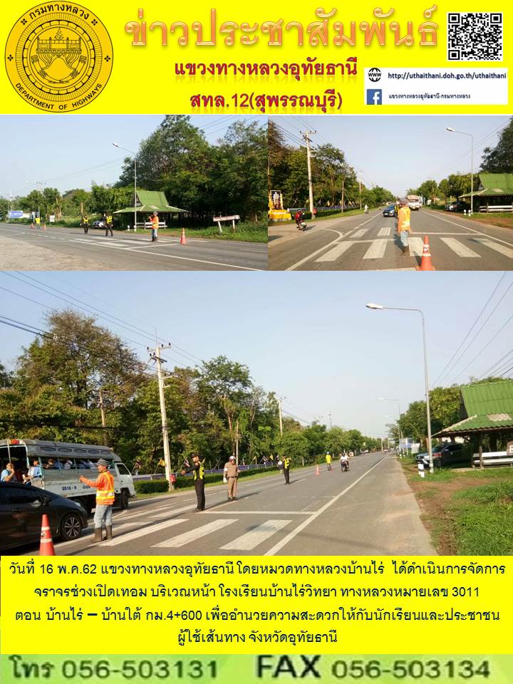 วันที่ 16 พฤษภาคม 2562 เวลา 07.30น. หมวดทางหลวงบ้านไร่ ดำเนินการติดตั้งอุปกรณ์อำนวยความปลอดภัย ตามรูปแบบมาตรฐานครบถ้วน บริเวณหน้าโรงเรียนบ้านไร่วิทยา ทางหลวงหมายเลข 3011 ตอนบ้านไร่- บ้านใต้ ที่กม.4+600