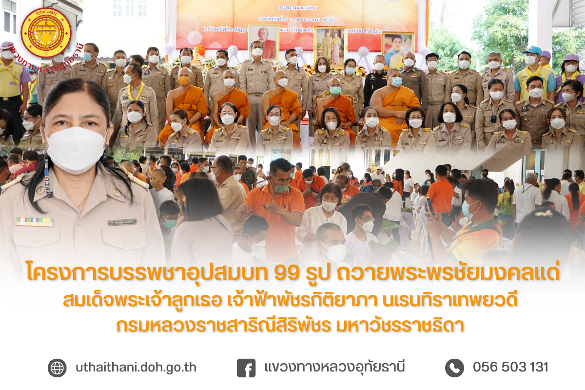 วันที่ 9 มกราคม 2566 เวลา 09.00 น. นายสมโภช โอทาตะ ผอ.ขท.อุทัยธานี มอบหมายให้ นางสาวเพียงจิตต์ เหลือจ้อย รอ.ขท.อุทัยธานี เข้าร่วมกิจกรรม โครงการบรรพชาอุปสมบท 99 รูป ถวายพระพรชัยมงคลแด่สมเด็จพระเจ้าลูกเธอ เจ้าฟ้าพัชรกิติยาภา นเรนทิราเทพยวดี กรมหลวงราชสาริณีสิริพัชร มหาวัชรราชธิดา ณ วัดมณีสถิตกปิฏฐารามพระอารามหลวง (วัดทุ่งแก้ว)