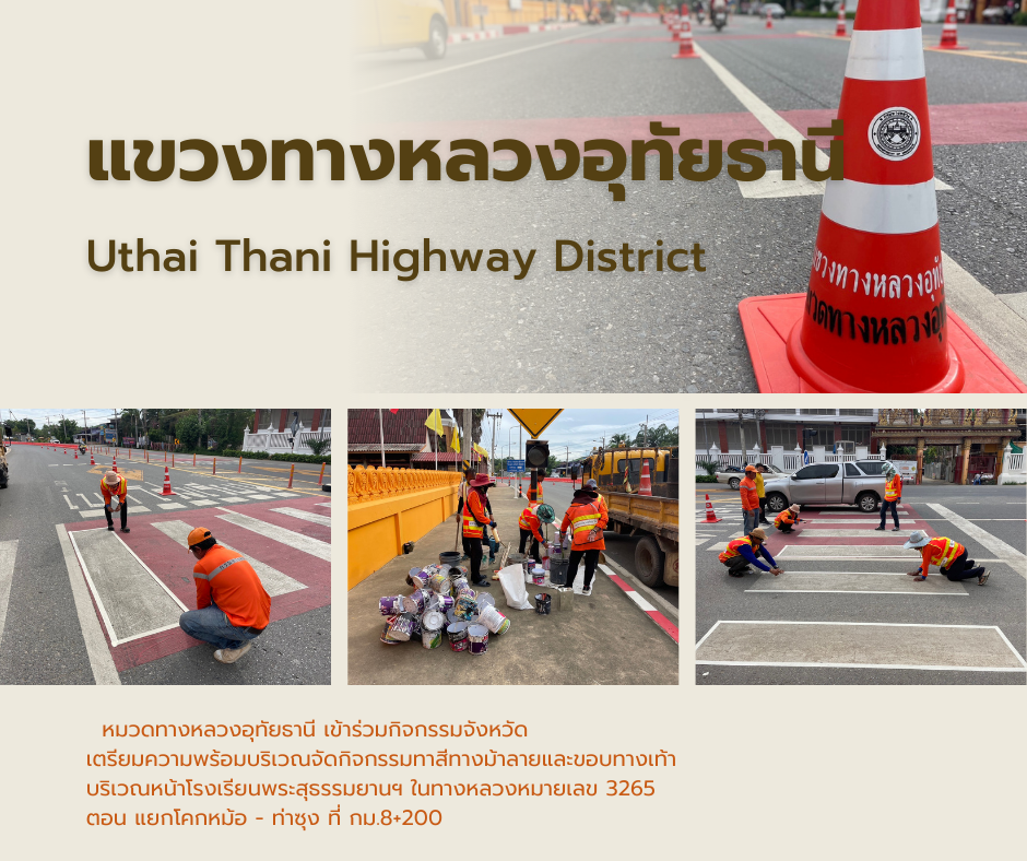 นายสมโภช โอทาตะ ผู้อำนวยการแขวงทางหลวงอุทัยธานี มอบหมายให้ นายสัญญา ปานพรม หัวหน้าหมวดทางหลวงอุทัยธานี เข้าร่วมกิจกรรมจังหวัด เตรียมความพร้อมบริเวณจัดกิจกรรมทาสีทางม้าลายและขอบทางเท้า บริเวณหน้าโรงเรียนพระสุธรรมยานฯ ในทางหลวงหมายเลข 3265 ตอน แยกโคกหม้อ - ท่าซุง ที่ กม.8+200 อำเภอเมืองอุทัยธานี จังหวัดอุทัยธานี