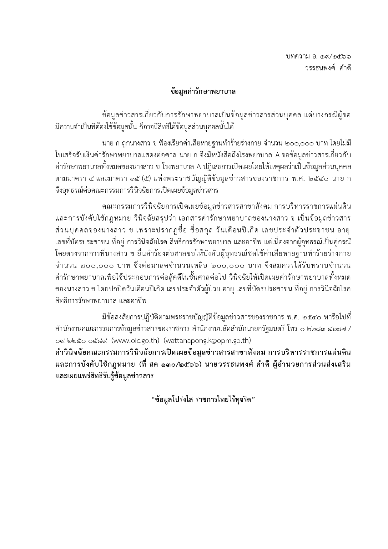 ด้วยสำนักงานปลัดสำนักนายกรัฐมนตรี โดยสำนักงานคณะกรรมการข้อมูลชาวสารของราชการ ได้จัดทำบทความสรุปประเด็นคำวินิจฉัยของคณะกรรมการวินิจฉัยการเปิดเผยข้อมูลข่าวสาร