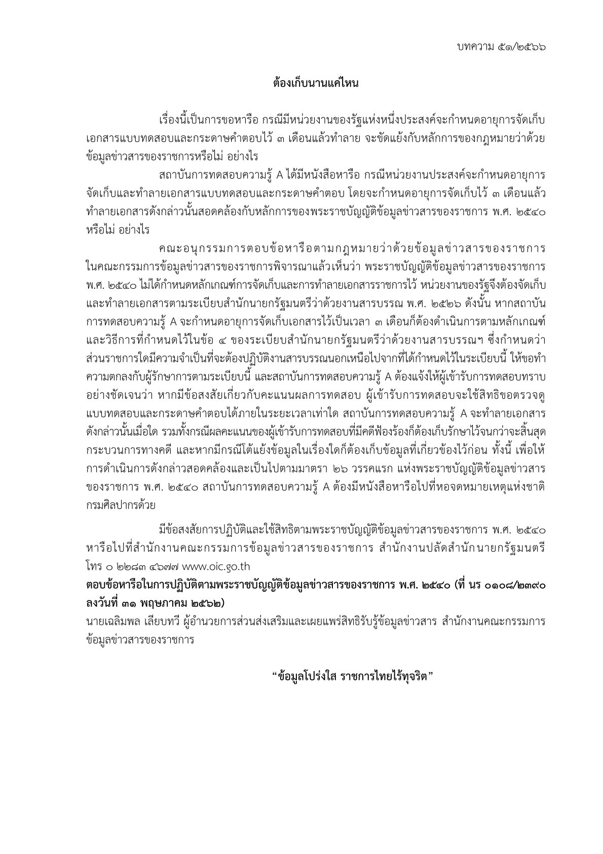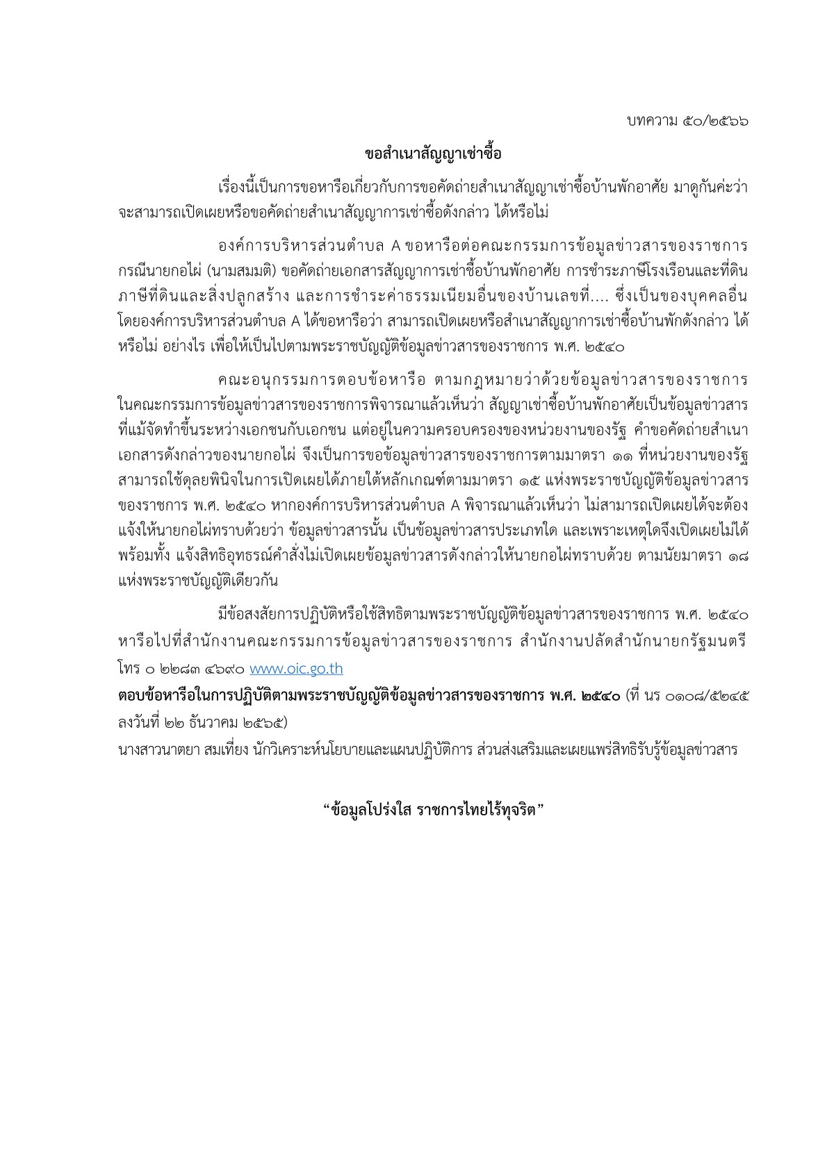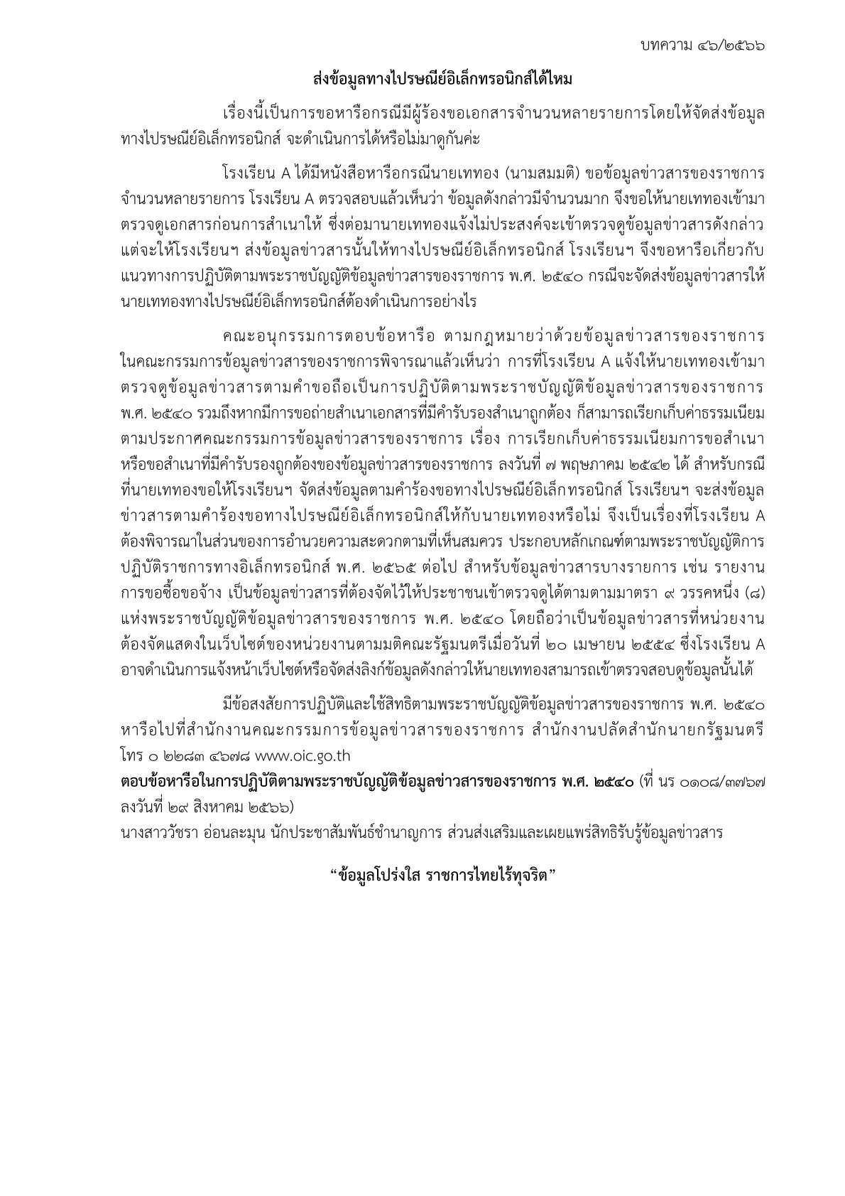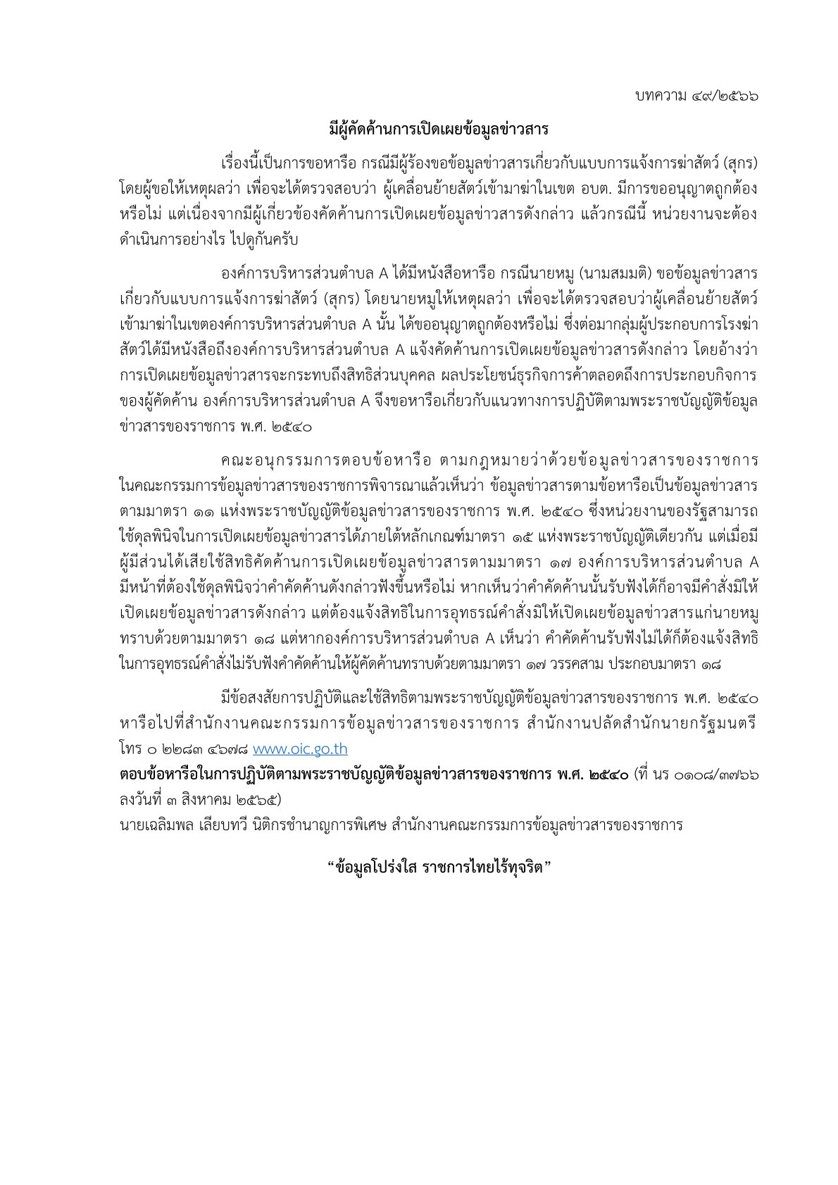 ด้วยสำนักงานปลัดสำนักนายกรัฐมนตรี โดยสำนักงานคณะกรรมการข้อมูลข่าวสารของราชการได้จัดทำบททความสรุปประเด็นคำวินิจฉัยของคณะกรรมการวินิจฉัยการเปิดเผยข้อมูลข่าวสาร และประเด็นข้อหารือ เพื่อเป็นเอกสารเผยแพร่ความรู้เกี่ยวกับพระราชบัญญัติข้อมูลข่าวสารของราชการ พ.ศ. 2540