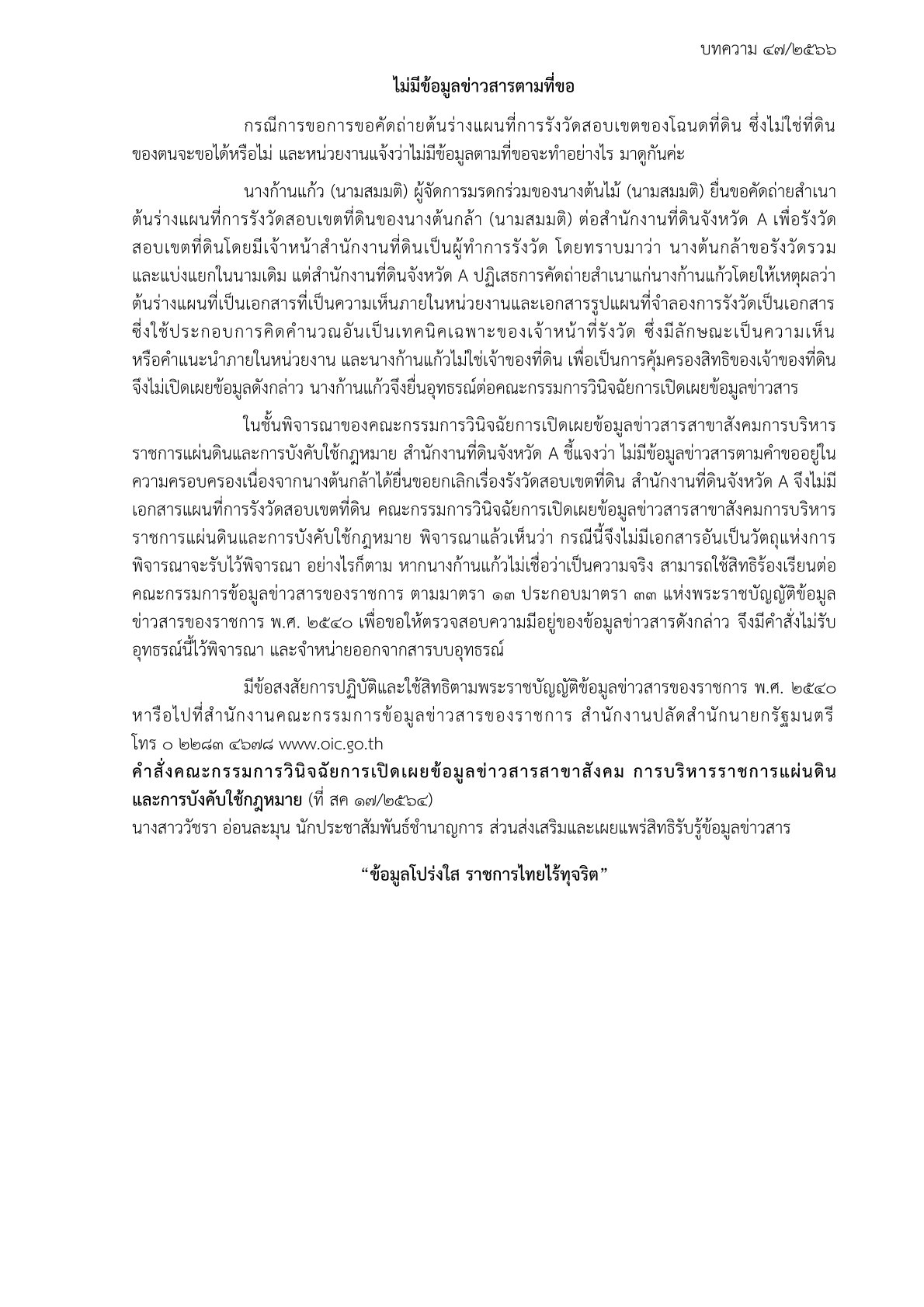 ข้อมูลข่าว : สำนักงานคณะกรรมการข้อมูลข่าวสารของราชการได้จัดทำบททความสรุปประเด็นคำวินิจฉัยของคณะกรรมการวินิจฉัยการเปิดเผยข้อมูลข่าวสาร