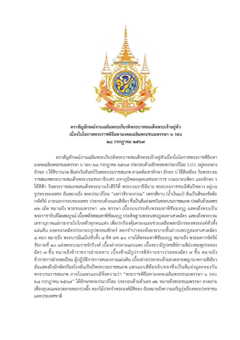 เนื่องในโอกาสมหามงคลเฉลิมพระชนมพรรษาพระบาทสมเด็จพระเจ้าอยู่หัว ทรงเจริญพระชนมพรรษา 6 รอบ 72 พรรษา ในวันที่ 28 กรกฎาคม 2567