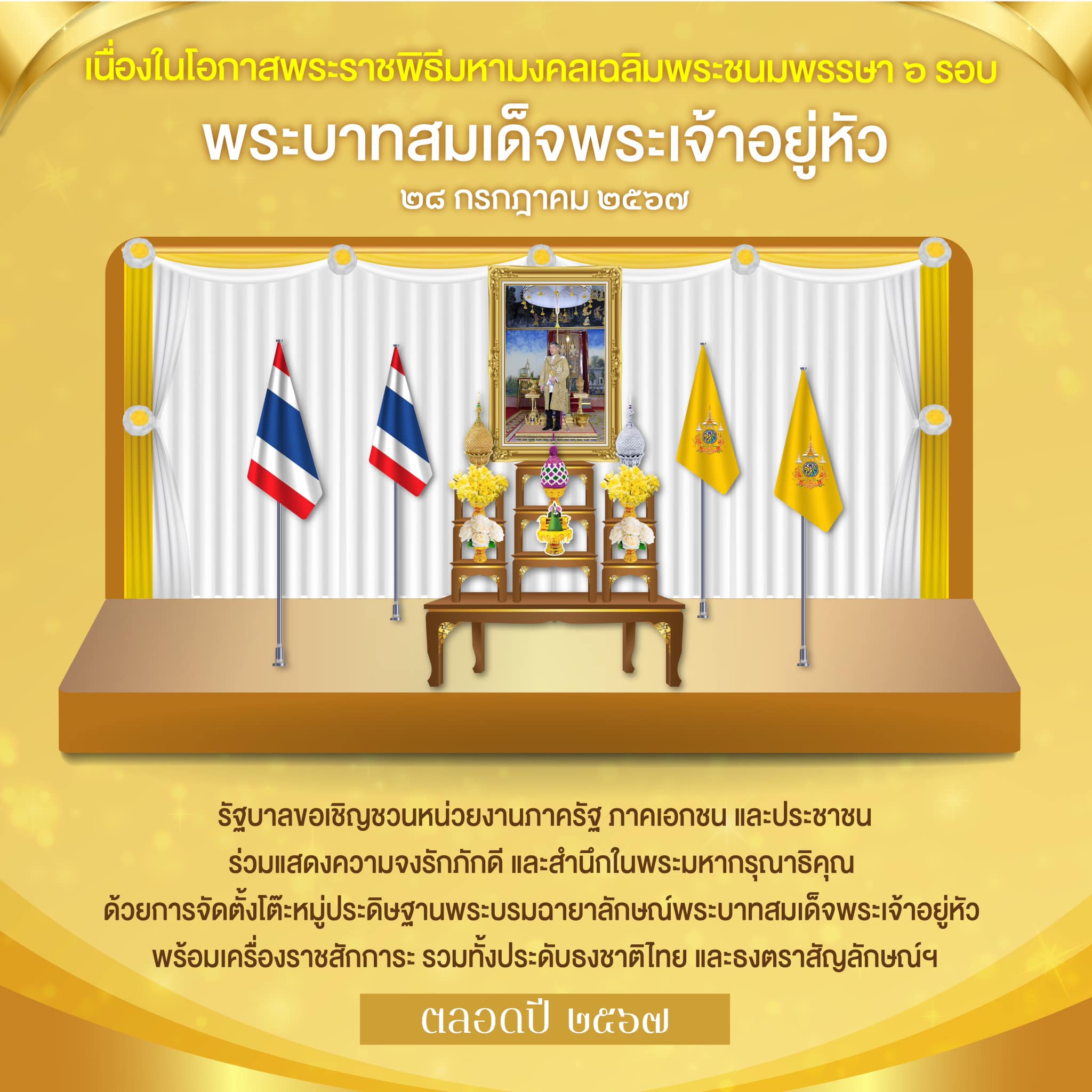 รัฐบาลขอเชิญชวนหน่วยงานภาครัฐ ภาคเอกชน และประชาชน ร่วมแสดงความจงรักภักดี และสำนึกในพระมหากรุณาธิคุณ ด้วยการจัดตั้งโต๊ะหมู่ประดิษฐานพระบรมฉายาลักษณ์พระบาทสมเด็จพระเจ้าอยู่หัว พร้อมเครื่องราชสักการะ รวมทั้งประดับธงชาติไทย ธงตราสัญลักษณ์งานเฉลิมพระเกียรติพระบาทสมเด็จพระเจ้าอยู่หัว เนื่องในโอกาสพระราชพิธีมหามงคลเฉลิมพระชนมพรรษา 6 รอบ 28 กรกฎาคม 2567 ตราสัญลักษณ์ฯ และประดับผ้าระบายสีเหลืองร่วมกับผ้าระบายสีขาว ตามอาคารสถานที่ของหน่วยงานและบ้านเรือน ตามความเหมาะสม ในระยะเวลาขอบเขตการจัดงานเฉลิมพระเกียรติฯ ตลอดปี 2567